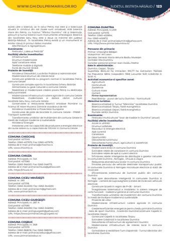 WWW.GHIDULPRIMARIILOR.RO JUDE%u021aUL BISTRI%u021aA-N%u0102S%u0102UD / 123exist%u0103 c%u00e2te o biseric%u0103, iar %u00een satul Petri%u015f mai este %u015fi o bisericu%u0163%u0103 situat%u0103 %u00een cimitirul din sat (toate sunt ortodoxe). At%u00e2t biserica mare din Petri%u015f- cu hramul %u201cSf%u00e2ntul Dumitru%u201d c%u00e2t %u015fi bisericu%u0163a, precum %u015fi turnul bisericii sunt monumente arheologice. Biserica din localitatea Satu Nou este a doua ca m%u0103rime din jude%u0163ul Bistri%u0163a-N%u0103s%u0103ud . %u00cen localitatea Petri%u015f exist%u0103 %u015fi un monument al eroilor c%u0103zu%u0163i %u00een primul r%u0103zboi mondial. Alte Pensiuni si Agropensiuni.Evenimente:Festivalul ,,Laleaua Pestri%u021b%u0103%u2019%u2019Facilit%u00e3%u0163i oferite investitorilor:Infrastructur%u0103Drumuri modernizateAp%u0103/ canalizare re%u021beaTelefonie mobile %u0219i digital%u0103For%u021b%u0103%u00a0de munc%u0103%u00a0t%u00e2n%u0103r%u0103Proiecte de investi%u0163ii:Ministerul Dezvolt%u0103rii, Lucr%u0103rilor Publice %u0219i Administra%u021bieiModernizare drumuri de interes localConstruire gr%u0103dini%u021b%u0103 cu program normal %u00een localitatea Petri%u0219, comuna CetateConstruire complex sportiv %u00een localitatea%u00a0Orheiu Bistri%u021bei%u00a0Alimentarea cu gaze naturale a comunei CetateReabilitare %u015fi modernizare cl%u0103dire %u015fcoala Petri%u015f cu destina%u0163ia sediul prima%u0103ieiModernizarea infrastructurii rutiere agricole %u00een comuna CetateReabilitare, modernizare %u0219i dotare c%u0103min cultural localitate%u00a0Satu Nou, comuna%u00a0CetateConservarea %u0219i restaurarea Bisericii ortodoxe Rom%u00e2ne cu hramul Sf. Mare Mucenic Dimitrie Izvor%u00e2torul de MirMinisterul Investi%u021biilor %u0219i Proiectelor EuropeneConstruirea de piste de biciclete %u00een comuna Cetate %u2013 PNNR %u2013 Transport sustenabilTransformarea unit%u0103%u021bilor de %u00eenv%u0103%u021b%u0103m%u00e2nt din comuna Cetate %u00een medii de %u00eenv%u0103%u021bare moderne %u0219i sustenabileMinisterul Energiei Instalarea unei noi capacit%u0103%u021bi de producere a energiei electrice din surse solare cu o capacitate de 100 kW %u00een Comuna CetateCOMUNA CHIOCHI%u015eCod po%u0219tal: 427045Telefon: 0363-407975; Fax: 0363-407975; Adresa de e-mail: primaria@chiochis.roURL: www.chiochis.roCOMUNA CHIUZAAdres%u0103: Principal%u0103, nr. 14ACod po%u0219tal: 427060Telefon: 0263-346001; Fax: 0263-346173; Adresa de e-mail: primariachiuza@yahoo.comURL: https://chiuza.ro/COMUNA CICEU MIH%u0102IE%u015eTIAdres%u0103: nr. 293Cod po%u0219tal: 427218Telefon: 0263-344500; Fax: 0263-344500; Adresa de e-mail: primariacm@gmail.comURL: www.primariacm.roCOMUNA CICEU-GIURGE%u015eTIAdres%u0103: Principal%u0103, nr. 287 ACod po%u0219tal: 427065Telefon: 0263-345090; Fax: 0263-345090; Adresa de e-mail: primgiurgesti@yahoo.comURL: https://www.primariaciceugiurgesti.ro/COMUNA CO%u015eBUCAdres%u0103: Principal%u0103, nr. 368Cod po%u0219tal: 427070Telefon: 0263-368016; Fax: 0263-368016; Adresa de e-mail: primariacosbuc@yahoo.comURL: www.primariacosbuc.roCOMUNA DUMITRAAdres%u0103: Principal%u0103, nr.209Cod po%u0219tal: 427075Telefon: 0363-402854; Fax: 0363-402872; Adresa de e-mail: primariadumitra@yahoo.comURL: http://www.primariadumitra.ro/Persoane din primarie:Primar: Gheorghe%u00a0B%u0103l%u0103jan%u00a0Viceprimar: Ani LeonSecretar General:%u00a0Maria-Veturia Bodiu Mure%u0219anContabil:%u00a0Mia%u00a0Dumitru%u00a0Consilier personal primar: Ioan Ovidiu%u00a0MatheSate %u00een administra%u021bie:Dumitra, Cepari, T%u0103rpiuSuprafa%u021ba:%u00a0 8534,43 ha; Intravilan:%u00a0 910,77 ha; Extravilan:%u00a0 7623,66 ha; Popula%u021bia:%u00a05804; Gospod%u0103rii:%u00a01959; Locuin%u021be:%u00a01631; Gr%u0103dini%u021be:%u00a03; %u0218coli:%u00a04; Activitati economice si specifice zonei:Agricultur%u0103Horticultur%u0103ZootehnieCultura mareComer%u021bFirme reprezentative:Raal Bistri%u021ba - punct de lucru Dumitra - horticultur%u0103Obiective turistice:Biserica ortodox%u0103 %u0219i Turnul %u201cSl%u0103ninilor%u201d localitatea DumitraBiserica ortodox%u0103 T%u0103rpiu, fost%u0103 evanghelicaBiserica ortodox%u0103 Cepari, fost%u0103 evanghelicaRuinele cet%u0103%u021bii DumitraEvenimente:Festivalul multicultural %u201cIzvor de tradi%u021bie %u00een Dumitra%u201d (anual)Facilit%u00e3%u0163i oferite investitorilor:Acces la utilit%u0103%u021bi:Drumuri asfaltateRacorduri la energie electric%u0103Ap%u0103 curent%u0103CanalizareOportunit%u0103%u021biDezvoltarea turismuluiDezvoltarea horticulturii, agriculturii %u0219i zootehnieiProiecte de investi%u0163ii:Modernizare str%u0103zi %u00een comuna DumitraExtindere re%u021bele de canalizare %u00een comuna DumitraExtindere re%u021bele de ap%u0103 %u0219i curent electric%u00cenfin%u021barea re%u021belei inteligente de distribu%u021bie a gazelor naturale %u00een comunele Dumitra , Nimigea , Chiuza %u0219i ZagraReducerea abandonului %u0219colar %u00een comuna Dumitra%u00cennoirea parcului de vehicole destinate transportului public %u00een comunele Dumitra %u0219i Nimigea microbuze electrice %u0219i sta%u021bii de incarcareEficientizarea sistemului de iluminat public din comuna DumitraPa%u0219i spre dezvoltarea inteligent%u0103 %u00een comunele Dumitra %u0219i Nimigea - camere de supraveghere %u0219i statie de %u00eenc%u0103rcare vehicule electrice.Construire %u0218coal%u0103 %u00een regim de P+2E - Smart%u00cenregistrarea sistematic%u0103 a imobilelor %u00een sistem integrat de carte funciar%u0103 - Cadastrul general al comunei DumitraTransformarea unita%u021bilor de %u00eenva%u021b%u0103m%u00eent din comuna Dumitra %u00een medii de %u00eenv%u0103%u021bare moderne %u0219i sustenabileProiecte de viitorModernizarea infrastructurii rutiere agricole %u00een comuna DumitraCre%u0219terea eficien%u021bei energetice pentru Sediu prim%u0103rie Dumitra , Sala de sport Dumitra , Gradini%u021b%u0103 DumitraConstruire Capel%u0103 %u00een localitatea CepariConstruire Capel%u0103 %
