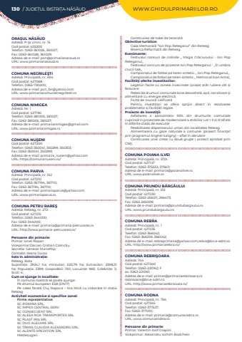 130 / JUDE%u021aUL BISTRI%u021aA-N%u0102S%u0102UD WWW.GHIDULPRIMARIILOR.ROORA%u0218UL N%u0102S%u0102UDAdres%u0103: P-%u0163a Unirii, nr. 15Cod po%u0219tal: 425200Telefon: 0263-361026, 361027; Fax: 0263-361028, 361029; Adresa de e-mail: pon@primarianasaud.roURL: www.primarianasaud.roCOMUNA NEGRILE%u015eTIAdres%u0103: Principal%u0103, nr. 494Cod po%u0219tal: 427068Telefon: 0363-730200; Adresa de e-mail: pcn_bn@yahoo.comURL: www.primariacomuneinegrilesti.roCOMUNA NIMIGEAAdres%u0103: Nr. 1Cod po%u0219tal: 427190Telefon: 0263-381005, 381027; Fax: 0263-381005, 381027; Adresa de e-mail: primarianimigea@gmail.comURL: www.primarianimigea.roCOMUNA NU%u015eENICod po%u0219tal: 427200Telefon: 0263-350041, 350299, 350303; Fax: 0263-350041, 350299; Adresa de e-mail: primaria_nuseni@yahoo.comURL: https://comunanuseni.ro/COMUNA PARVAAdres%u0103: Principal%u0103, nr. 162Cod po%u0219tal: 427210Telefon: 0263-367194, 367110; Fax: 0263-367194, 367110; Adresa de e-mail: primariaparva@yahoo.comURL: www.primariaparva.roCOMUNA PETRU RARE%u015eAdres%u0103: Reteag, nr. 272Cod po%u0219tal: 427215Telefon: 0263-344000; Fax: 0263-344000; Adresa de e-mail: primaria@primaria-petrurares.roURL: http://www.primaria-petrurares.ro/Persoane din primarie:Primar: Ionel%u00a0Ropan%u00a0Viceprimar:Dacian Cristian Calinc%u0103uSecretar General: MariaPop%u00a0Contabil: Ileana%u00a0Coco%u0219Sate %u00een administra%u021bie:Reteag, BataSuprafa%u021ba:%u00a0 2924,1 ha; Intravilan:%u00a0 525,79 ha; Extravilan:%u00a0 2398,31 ha; Popula%u021bia:%u00a0 3399; Gospod%u0103rii:%u00a0 1101; Locuin%u021be:%u00a0 865; Gr%u0103dini%u021be:%u00a0 3; %u0218coli:%u00a04; Cum se ajunge in localitate:%u00cen comuna noastr%u0103%u00a0se poate ajunge:Pe drumul european E58 (DN17)Pe calea ferat%u0103%u00a0Cluj Napoca %u2013 Ilva Mic%u0103%u00a0cu cobor%u00e2re %u00een sta%u021bia ReteagActivitati economice si specifice zonei:Firme reprezentative:SC ROXANA SRLSC IMPEX CENTRAL SERVSC CONSECVENT SRLSC ALEEA ROA TRANSPORTES SRLSC PLAST IRIS SRL SC DUO ALECARE SRLSC TRANS CLAUDIA ALEXANDRU SRLSC ALENTE SPEDITION SRLMe%u0219te%u0219ugari:Construirea de sobe de teracot%u0103Obiective turistice:Casa Memorial%u0103%u00a0%u201cIon Pop Reteganul%u201d din ReteagBiserica Reformat%u0103%u00a0din Reteag.Evenimente:Festivalul consurs de colinde ,, Magia Cr%u0103ciunului - Ion Pop Reteganul,,Festivalul concurs de pricesne Ion Pop Reteganul - ,,%u00cen umbra crucii tale,,Campionatul de fotbal pe teren sintetic ,, Ion Pop Reteganul,, Campionatul de fotbal pe teren sintetic ,, Memorial Ioan Antal,,Facilit%u00e3%u0163i oferite investitorilor:Leg%u0103turi facile cu zonele %u00eenvecinate (ora%u0219e) at%u00e2t rutiere c%u00e2t %u0219i feroviareRe%u021bea de drumuri comunale bine dezvoltat%u0103, ap%u0103, canalizare %u0219i alimentare cu energie electric%u0103For%u021b%u0103%u00a0de munc%u0103%u00a0calificat%u0103Pentru investitori se ofera sprijin direct %u00een rezolvarea problemelor %u0219i facilit%u0103%u021bi%u00a0legale.Proiecte de investi%u0163ii:Asfaltarea a aproximativ 95% din drumurile comunale cuprins%u0103%u00a0%u00een proiectele de modernizare a str%u0103zilor Lot I-II %u0219i III aflate %u00een diferite stadii de execu%u021bieReabilitarea dispensarului uman din localitatea ReteagAlimentarera cu gaze naturale a comunei (proiect finan%u021bat prin programul Anghel Saligny) %u2013 aflat %u00een derulareConstruirea unei cre%u0219e cu dou%u0103%u00a0grupe ( proiect aprobat prin CNI).COMUNA POIANA ILVEIAdres%u0103: Principal%u0103, nr. 97/ACod po%u0219tal: 427147Telefon: 0263-375533, 375611; Adresa de e-mail: primaria@poianailvei.roURL: www.poianailvei.roCOMUNA PRUNDU B%u00c2RG%u0102ULUIAdres%u0103: Principal%u0103, nr. 512Cod po%u0219tal: 427230Telefon: 0263-265011, 266473; Fax: 0263-265009; Adresa de e-mail: primaria@prundubargaului.roURL: www.prundubargaului.roCOMUNA REBRAAdres%u0103: Principal%u0103, nr. 1Cod po%u0219tal: 427235Telefon: 0263-366042; Fax: 0263-366259, 366042; Adresa de e-mail: rebraprimaria@yahoo.com,rebra@bn.e-adm.roURL: http://www.primariarebra.ro/COMUNA REBRI%u015eOARAAdres%u0103: 744Cod po%u0219tal: 427240Telefon: 0263-220162; Fax: 0263-220161; Adresa de e-mail: primar@primariarebrisoara.rorebrisoara@bn.e-adm.roURL: http://www.primariarebrisoara.ro/COMUNA RODNAAdres%u0103: Principal%u0103, nr. 756Cod po%u0219tal: 427245Telefon: 0263-377537; Fax: 0263-377010; Adresa de e-mail: primaria@comunarodna.roURL: www.comunarodna.roPersoane din primarie:Primar: Valentin Iosif%u00a0GrapiniViceprimar: Alexandru%u00a0Iochim Bodriheic