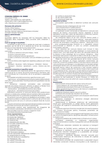 144 / JUDE%u021aUL BOTO%u0218ANI WWW.GHIDULPRIMARIILOR.ROCOMUNA DERSCA ID: 26668Cod po%u0219tal: 717125Telefon: 0231-626110; Fax: 0231-626130; Adresa de e-mail: cl.dersca@yahoo.comURL: http://www.comunadersca.roPersoane din primarie:Primar: Mihai%u00a0Cazacu%u00a0Viceprimar: Vasilic%u0103 B%u0103dr%u0103ganSecretar General: Valerica-L%u0103cr%u0103mioara%u00a0Hri%u021buleacContabil: Mihaela%u00a0T%u0103n%u0103seleSate %u00een administra%u021bie:DerscaSuprafa%u021ba:%u00a0 3857,74 ha; Intravilan:%u00a0 557 ha; Extravilan:%u00a0 3300 ha; Popula%u021bia:%u00a0 3554; Gospod%u0103rii:%u00a0 1200; Locuin%u021be:%u00a0 1200; Gr%u0103dini%u021be:%u00a0 1; %u0218coli:%u00a01; Cum se ajunge in localitate:Localitatea se afl%u0103 situat%u0103 %u00een partea de nord-vest a jude%u021bului Boto%u0219ani, pe DJ 291 B, la o distan%u021b%u0103 de 18 km de municipiul Dorohoi %u0219i 10 km fa%u021b%u0103 de Punctul Vamal Siret.Comuna Dersca se %u00eenvecineaz%u0103%u00a0 cu urm%u0103toarele teritorii comunale:-%u00a0la Nord cu teritoriul comunei Hili%u015feu - Horia-%u00a0la Sud cu comuna Lozna-%u00a0la Est cu teritoriul comuna %u015eendriceni-%u00a0la Vest cu teritoriul comunelor comuna Mih%u0103ileni %u015fi comuna C%u00e2nde%u015ftiComuna Dersca este legat%u0103 de re%u015fedin%u0163a jude%u0163ului prin dou%u0103 c%u0103i rutiere:-%u00a0Boto%u015fani %u2013 Bucecea %u2013 V%u00e2rfu C%u00e2mpului %u2013 Mih%u0103ileni - Dersca -%u00a0Boto%u015fani %u2013 Dorohoi %u2013 %u015eendriceni %u2013 Lozna - Dersca cea mai utilizat%u0103Activitati economice si specifice zonei:Spre deosebire de majoritatea %u0163%u0103rilor UE, agricultura a fost %u015fi continu%u0103 s%u0103 fie un sector de prim%u0103 importan%u0163%u0103 %u00een Rom%u00e2nia, at%u00e2t prin contribu%u0163ia sa %u00een economie, c%u00e2t %u015fi ca pondere a popula%u0163iei ocupate.Principalele activit%u0103%u021bi economice, specifice zonei, sunt:- Agricultura - activitatea economic%u0103%u00a0principala tradi%u021bional%u0103%u00a0din comun%u0103- cultura plantelor fiind favorizat%u0103%u00a0de suprafe%u021bele mari de teren arabil- Zootehnia- cre%u0219terea animalelor este activitatea agricol%u0103%u00a0 secundar%u0103, terenurile utilizate ca p%u0103%u0219uni %u0219i f%u00e2ne%u021be fiind mai mici ca suprafa%u021b%u0103%u00a0comparativ cu cele cultivate- Pomicultura - activitatea economica secundar%u0103- Apicultura - activitatea economica secundaraPoten%u0163ialul economic al comunei Dersca este predominant comer%u021b%u00a0cu am%u0103nuntul, prestare servicii sanitare, fabricarea p%u00e2inii, fabricarea pr%u0103jiturilor %u0219i a produselor proaspete de patiserie.Pe teritoriul comunei Dersca %u00ee%u0219i desf%u0103%u015foar%u0103 activitatea o serie de persoane juridice cu sediul social %u00een comun%u0103, dar %u015fi firme care au deschis punct de lucru %u00een comuna %u015fi absorb for%u0163%u0103 de munc%u0103 local%u0103.Industria alimentar%u0103: este reprezentat%u0103%u00a0de societ%u0103%u021bi comerciale cu activitate economic%u0103%u00a0de mor%u0103rit %u0219i panifica%u021bieAlimenta%u021bia public%u0103: este reprezentat%u0103%u00a0 de magazine de comercializare a produselor alimentare %u0219i restauranteAlte activit%u0103%u021bi %u0219i servicii: comer%u021b, magazine mixteActivitatea de prelucrarea lemnuluiFirme reprezentative:SC RAMIRO SRL DERSCASC EUXIN SRL DERSCASC REMAGIC SRL DERSCASC FAMILIA SRLSC GRANODURO DGI SRLSC FUTURE CONSTRUCTII SRLSC GHERMAR SRLSC IRINLAUR SRLSC MICA REPARTO SRSC CONTEM COMPANY SRLCAP TEMVADO DERSCACMI DR. SMOLENIC BRANDUSA CORINASC MONOFARM PLUS SRL CMV DR. BURLACU LAURENTIUSC PARASEVAL SRLSC LARVET PHILAXIA SRLSC LARVET PHILAXIA SRLSC VATRA CU BUNATATI SRLSC I&L MOTO SERV SRL SC DANYMAR MERY SRLObiective turistice:Principalele oportunit%u0103%u021bi %u0219i obiective turistice ale comunei sunt:-Vizitarea siturilor arheologice din sec. V-VI-Zona floristic%u0103 de la Turb%u0103ria Dersca-Castelul Burbur %u00een perioada Rena%u0219teriiUn poten%u0163ial turistic remarcabil se identific%u0103 %u00een comun%u0103 care dispune de biserici, monumente istorice, vegeta%u0163ie %u015fi faun%u0103 deosebit%u0103 ce pot oferi cadrul de dezvoltare a turismului cultural, destinat %u00een special turi%u015ftilor de la nivel na%u0163ional.De men%u0163ionat faptul c%u0103 pe raza comunei Dersca exsit%u0103 o zon%u0103 natural%u0103 protejat%u0103 de interes na%u0163ional %u2013 rezerva%u0163ie floristic%u0103 %u201cTurb%u0103rie Dersca%u201d, conform Legii nr. 5/2000 privind aprobarea Planului de amenajare a teritoriului na%u0163ional %u2013 Sec%u0163iunea a III-a %u2013 zone protejate,rezerva%u0163ie floristic%u0103 cu o deosebit%u0103 valoare monumental%u0103 %u015fi estetic%u0103 %u00een care s-a urm%u0103rit conservarea frumuse%u0163ilor naturaleDou%u0103 obiective din comuna Dersca sunt incluse %u00een lista monumentelor istorice din jude%u021bul Boto%u0219ani ca monumente de interes local. Unul este podul din lemn din perioada dacic%u0103%u00a0 de la Dersca si Situl arhiologic de la la Dersca -Strejanca - Situl arheologic este situat %u00een extravilan la 1300 m NE de sat, la 150 m E de a%u015fezarea fortificat%u0103 La Pisc, pe partea st%u00e2ng%u0103 a p%u00e2r%u00e2ului Potici.Podul din lemn din perioada dacic%u0103 de la Lozna, comuna Dersca, jud. Boto%u015fani. %u00cen timpul exploat%u0103rii z%u0103c%u0103mintelor de turb%u0103 din cunoscuta turb%u0103rie aflat%u0103 %u00een sud-estul satului Lozna din comuna Dersca, jud. Boto%u015fani, s-au descoperit numeroase vestigii arheologice dintre care una remarcabil%u0103 este podul din lemn din perioada dacic%u0103. Al%u0103turi de construc%u0163ii a fost cercetat celebrul depozit cu unelte %u015fi piese din fier dacice. Podul a fost surprins pe o suprafa%u0163%u0103 de 25 mp., avea aprox. 6 metri l%u0103%u0163ime %u015fi fusese fixat cu ajutorul unor %u0163%u0103ru%u015fi. O parte din podul de la Lozna a fost preluat %u015fi se afl%u0103 expus %u00