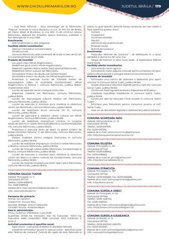 WWW.GHIDULPRIMARIILOR.RO JUDE%u021aUL BR%u0102ILA / 179- cod RAN 43741.02 - Situl Arheologic de la R%u00e2mnicelu %u201cPopina%u201d, localizat %u00een lunca Buz%u0103ului, la cca. 34 km NV de Br%u0103ila, pe malul drept al Buz%u0103ului, la cca 500 m de cimitirul satului R%u00e2mnicelu, dateaz%u0103%u00a0 din Eneolitic, Epoca bronzului, Hallstatt; a fost descoperit%u0103%u00a0%u00een anul 1958.Evenimente:Cele tradi%u0163ionale %u015fi cele religioaseFacilit%u00e3%u0163i oferite investitorilor:Terenuri intravilane concesionabileInfrastructur%u0103:Comuna R%u00e2mnicelu este traversat%u0103%u00a0de la Est la Vest de DJ 221 %u0219i %u00een partea de Nord de DJ 202A.Proiecte de investi%u0163ii:Loc joac%u0103%u00a0copii Mihail Kog%u0103lniceanuReabilitare gard cimitir Mihail Kog%u0103lniceanuRepara%u021bii capitale cl%u0103dire vestiar baz%u0103 sportiv%u0103%u00a0R%u00e2mniceluReabilitare c%u0103min cultural sat R%u00e2mniceluConsolidare maluri r%u00e2u Buz%u0103u sat Constantine%u0219tiConsolidare maluri r%u00e2u Buz%u0103u sat Mihail Kog%u0103lniceanuProiectare %u0219i execu%u021bie lucr%u0103ri de instalare sistem de supraveghere video, %u00een localit%u0103%u021bile Constantine%u0219ti, Mihail Kog%u0103lniceanu %u0219i Boarca %u201d, comuna R%u00e2mnicelu, jude%u021bul%u00a0 Br%u0103ilaimplementat 2022Lucr%u0103ri de repara%u021bii Centru integrat comunitarDispensar medical, sat R%u00e2mnicelu, comuna R%u00e2mnicelu, jude%u021bul Br%u0103ilaLucr%u0103ri de reamenajare tribun%u0103%u00a0 stadion sat R%u00e2mnicelu, comuna R%u00e2mnicelu, jude%u021bul%u00a0Br%u0103ilaLucr%u0103ri de execu%u021bie %u0219i montare por%u021bi metalice la obiectivul cimitir sat R%u00e2mnicelu, comuna R%u00e2mnicelu, jude%u021bul%u00a0Br%u0103ilaLucr%u0103ri de reabilitare drum comunal DC 51, comuna R%u00e2mnicelu, jude%u021bul%u00a0Br%u0103ilaLucr%u0103ri de igienizare %u0219i repara%u021bii c%u0103min cultural sat Mihail Kog%u0103lniceanu, comuna R%u00e2mnicelu, jude%u021bul%u00a0Br%u0103ilaLucr%u0103ri de reabilitare %u00eemprejmuiri cimitire, %u00een lungime total%u0103%u00a0de 248 ml, %u00een satele R%u00e2mnicelu(98 ml) %u0219i Constantine%u0219ti(150 ml), comuna R%u00e2mnicelu, jude%u021bul Br%u0103ilaProiectare %u0219i execu%u021bie teren de sport cu gazon sintetic de fotbal 22mX42m=924mp%u201d %u00een sat R%u00e2mnicelu, comuna R%u00e2mnicelu, jude%u021bul Br%u0103ilaDotare, mobilare Centru Integrat Comunitar %u00een comuna R%u00e2mncielu, jude%u021bul Br%u0103ilaLucr%u0103ri de reabilitare %u00eemprejmuiri cimitire %u00een satele R%u00e2mnicelu %u0219i Boarca, comuna R%u00e2mnicelu, jude%u021bul%u00a0Br%u0103ilaLucr%u0103ri de marcaje rutiere satele R%u00e2mnicelu, Constantine%u0219ti %u0219i Boarca, comuna R%u00e2mnicelu, jude%u021bul Br%u0103ilaLucr%u0103ri de execu%u021bie %u0219i montare por%u021bi metalice la obiectivul cimitir sat Boarca %u0219i c%u0103min cultural sat Constantine%u0219ti, comuna R%u00e2mnicelu, jude%u021bul Br%u0103ilaLucr%u0103ri de repara%u021bii %u00eemprejmuire teren sport satul R%u00e2mnicelu, comuna R%u00e2mnicelu, jude%u021bul Br%u0103ilaCOMUNA SALCIA TUDORAdres%u0103: Principal%u0103, nr. 11Cod po%u0219tal: 817125Telefon: 0239-698943; Fax: 0239-698943; Adresa de e-mail: secretariat@salciatudor.roURL: www.salciatudor.roPersoane din primarie:Primar: Ion SerafimViceprimar: Tincu%u021ba Ni%u021buSecretar delegat: Ionica TudoracheContabil: Nicu%u021ba- Ani%u0219oara B%u0103janSate %u00een administra%u021bie:Ariciu, Gulianca, Ol%u0103neasca, Cuza Vod%u0103Suprafa%u021ba:%u00a0 10708 ha; Intravilan:%u00a0 434 h3; Extravilan:%u00a0 10274 ha; Popula%u021bia:%u00a0 2485; Gospod%u0103rii:%u00a0 1038; Locuin%u021be:%u00a0 1243; Gr%u0103dini%u021be:%u00a0 3; %u0218coli:%u00a02; Activitati economice si specifice zonei:Agricultur%u0103 - cultivarea cerealelor %u0219i plantelor tehniceCre%u0219terea animalelor: bovine %u00een special ovine - specific%u0103 zonei este %u201cBr%u00e2nza de Gulianca%u201d, br%u00e2nz%u0103 din lapte de oaie, fabricat%u0103 la st%u00e2n%u0103, cu gust specific datorit%u0103 solului saraturat, pe care cre%u0219te o flor%u0103 specific%u0103 acestor soluriComer%u0163%u00cenv%u0103%u0163%u0103m%u00e2ntOcrotirea s%u0103n%u0103t%u0103%u0163iiMor%u0103ritAdministra%u0163ie public%u0103 local%u0103Produse locale Br%u00e2nz%u0103 de GuliancaEvenimente:Festivalul %u201cBr%u00e2nzei de Gulianca%u201d - se desf%u0103%u0219oar%u0103 %u00een a doua s%u00e2mb%u0103t%u0103 %u0219i duminica din luna maiT%u00e2rgul de toamn%u0103 %u00een satul Cuza Vod%u0103 - 8 septembrie (Sf%u00e2nta Marie Mic%u0103)Facilit%u00e3%u0163i oferite investitorilor:Concesion%u0103ri teren agricolConcesion%u0103ri teren p%u0103%u015fune natural%u0103 pentru amplasat c%u00e2mpuri eoliene de producere a energiei electrice neconven%u0163ionaleProiecte de investi%u0163ii:%u00cenfiin%u021barea unui centru de colectare a de%u0219eurilor prin aport voluntar %u00een Comuna Salcia Tudor, jude%u021bul Br%u0103ila%u0218coal%u0103%u00a0atractiv%u0103%u00a0%u0219i educa%u021bie digital%u0103%u00a0pentru copii din comuna Salcia Tudor, jude%u021bul Br%u0103ilaConstruire Pia%u021b%u0103%u00a0Agroalimentar%u0103 %u0219i Depozitare Br%u00e2nzeturiCre%u0219terea suprafe%u021bei %u00eemp%u0103durite %u00een comuna Salcia Tudor, jude%u021bul Br%u0103ilaConstruire sal%u0103%u00a0 de educa%u021bie fizic%u0103%u00a0 %u0219colar%u0103%u00a0 %u00een comuna Salcia Tudor%u00cenfiin%u021bare parc fotovoltaic pentru consumul propriu al UAT Salcia TudorHub-uri de dezvoltare digital%u0103%u00a0%u00een bibliotecile publice%u00a0br%u0103ileneCOMUNA SCOR%u0162ARU NOUAdres%u0103: Administra%u021biei, nr. 10Cod po%u0219tal: 817130Telefon: 0239-697519; Fax: 0239-697519; Adresa de e-mail: uatscortarunou@yahoo.comURL: http://www.primariascortarunou.ro/COMUNA SILI%u015eTEAAdres%u0103: Principal%u0103, nr. 83Cod po%u0219tal: 817140Telefon: 0239-638962; Fax: 0239-638962; Adresa de e-mail: sil_prim@yahoo.comURL: http://primariasilistea-