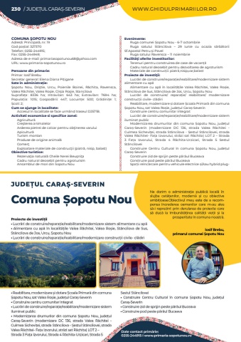 230 / JUDE%u021aUL CARA%u0218-SEVERIN WWW.GHIDULPRIMARIILOR.ROCOMUNA %u015eOPOTU NOUAdres%u0103: Principal%u0103, nr. 19Cod po%u0219tal: 327370Telefon: 0255-244915; Fax: 0255-244949; Adresa de e-mail: primariasopotunou68@yahoo.comURL: www.primaria-sopotunou.roPersoane din primarie:Primar: Iosif BrebuSecretar general:%u00a0Elena Diana%u00a0Pi%u021bigane%u00a0Sate %u00een administra%u021bie:%u015eopotu Nou, Dri%u015ftie, Urcu, Poienile Boinei, R%u0103chita, Ravensca, Valea R%u0103chitei, Valea Ro%u015fie, C%u00eer%u015fia Ro%u015fie, StancilovaSuprafa%u021ba:%u00a0 8336 ha; Intravilan:%u00a0 643 ha; Extravilan:%u00a0 7694 ha; Popula%u021bia:%u00a0 1015; Gospod%u0103rii:%u00a0 447; Locuin%u021be:%u00a0 500; Gr%u0103dini%u021be:%u00a0 1; %u0218coli:%u00a02; Cum se ajunge in localitate:Accesul %u00een localitate se face urm%u00e2nd traseul DJ571B.Activitati economice si specifice zonei:Agricultur%u0103Cre%u015fterea animalelorArderea pietrei de calcar pentru ob%u0163inerea varuluiApicultur%u0103Turism montanProduse de origine animal%u0103Comer%u0163Exploatare materiale de construc%u0163ii (piatr%u0103, nisip, balast)Obiective turistice:Rezerva%u0163ia natural%u0103 Cheile Nerei Beu%u015fni%u0163aCadru natural deosebit pentru agroturismAnsamblul de mori din Sopotu NouEvenimente:Ruga comunei %u0218opotu Nou - 6-7 octombrieRuga satului St%u0103ncilova %u2013 29 iunie cu ocazia s%u0103rb%u0103torii Sf.Apostol Petru %u0219i Pavel Ruga satului Ravensca %u2013 11 noiembrieFacilit%u00e3%u0163i oferite investitorilor:Terenuri pentru construirea de case de vacan%u021b%u0103Cadru natural deosebit pentru dezvoltarea de agroturism Materiale de construc%u021bii: piatr%u0103,nisip,var,balastProiecte de investi%u0163ii:Lucr%u0103ri de construire/repara%u021bie/reabilitare/modernizare sistem alimentare cu ap%u0103Alimentare cu ap%u0103 %u00een localit%u0103%u021bile Valea R%u0103chitei, Valea Ro%u0219ie, St%u0103ncilova de Sus, St%u0103ncilova de Jos, Urcu, %u0218opotu NouLucr%u0103ri de construire/ repara%u021bie/ reabilitare/ modernizare construc%u021bii civile- cl%u0103diriReabilitare, modernizare %u0219i dotare %u0218coala Primar%u0103 din comuna %u0218opotu Nou, sat Valea Ro%u0219ie, jude%u021bul Cara%u0219-SeverinConstruire centru comunitar integratLucr%u0103ri de construire/repara%u021bie/reabilitare/modernizare sistem iluminat publicModernizarea drumurilor din comuna %u0218opotu Nou, jude%u021bul Cara%u0219-Severin (modernizare DC 136, strada Valea R%u0103chitei - Culmea Sichevi%u021bei, strada St%u0103ncilova - %u0218estul St%u0103ncilovei, strada Valea R%u0103chitei- Fa%u021ba Izvorului, str%u0103zi sat R%u0103chita) LOT 2 %u2013 Strada 3 Fa%u021ba Izvorului, Strada 4 R%u0103chita-Urzicari, Strada 5 Sestul St%u0103nciloveiConstruire Centru Cultural %u00een comuna %u0218opotu Nou, jude%u021bul Cara%u0219-SeverinConstruire zid de sprijin peste p%u00e2r%u00e2ul BuceavaConstruire pod peste p%u00e2r%u00e2ul BuceavaSpa%u021bii re%u00eenc%u0103rcare pentru vehicule electrice %u0219i/sau hybrid plug-