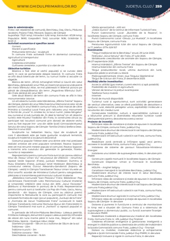 WWW.GHIDULPRIMARIILOR.RO JUDE%u021aUL CLUJ / 259Sate %u00een administra%u021bie:Frata ( sat re%u0219edin%u021b%u0103 de comun%u0103), Berchie%u015fu, Oa%u015f, Olariu, P%u0103durea Iacobeni, Poiana Fr%u0103%u0163ii, R%u0103zoare, Soporu de C%u00e2mpieSuprafa%u021ba:%u00a073,01 kmp; Intravilan:%u00a05,92 kmp; Extravilan:%u00a067,09 kmp; Popula%u021bia:%u00a0 3690; Gospod%u0103rii:%u00a0 1542; Locuin%u021be:%u00a0 1636; Gr%u0103dini%u021be:%u00a0 3; %u0218coli:%u00a02; Activitati economice si specifice zonei:Comer%u021bMor%u0103rit %u0219i panifica%u021biePrelucrarea lemnului - sculptur%u0103%u00cen comuna Frata activeaz%u0103 firme %u00een domeniul comer%u021bului, agriculturii %u0219i transportuluiAgricultur%u0103Cre%u0219terea animalelorCultivarea cerealelor, a pomilor %u0219i a vi%u021bei de vieObiective turistice:Biserica a fost aliat al vechii popula%u021bii %u0219i se cunosc date vechi %u00een care se pomene%u0219te despre biseric%u0103. %u00cen comuna Frata se afl%u0103%u00a0 dou%u0103%u00a0 bisericu%u021be de lemn, cu turnuri %u00eenalte %u0219i ascu%u021bite ca s%u0103ge%u021bile.Bierica de lemn ,,Sfin%u021bii Arhangheli Mihail %u0219i Gavriil din satul Berchie%u0219u, dateaz%u0103 din anul 1765, an %u00eensemnat pe piciorul de piatr%u0103 din masa Sf%u00e2ntului Altar, se mai p%u0103streaz%u0103 %u00een Biseric%u0103 pictura pe p%u00e2nz%u0103 de c%u00e2nep%u0103.Biserica din lemn ,,Pogor%u00e2rea Sf%u00e2ntului Duh%u201d, din Frata dat%u00e2nd din anul 1827.%u00a0Cele dou%u0103 Biserici de lemn din comuna Frata se afl%u0103 %u00een lista monumentelor istorice.Un alt obiectiv turistic este M%u0103n%u0103stirea ,,Sf%u00e2nta Treime%u201d Soporu de C%u00e2mpie, datat%u0103%u00a0din anul 1994.%u00censemnul Memorial al celor 40 de oameni uci%u0219i %u00een anul 1848 %u00een comuna Frata, a fost marcat de c%u0103tre Prim%u0103ria %u0219i Consiliul Local Frata prin ridicarea unui monument %u00een form%u0103%u00a0de ,,cruce%u201d %u00een cinstea lor, la locul numit ;,Valea S%u00e2ngelui%u201d sau cunoscut %u0219i sub numele de ,,%u00cen deal la Vamo%u0219%u201d.Un alt obiectiv turistic este Muzeul Tradi%u021biilor din Frata, la construirea c%u0103ruia au participat to%u021bi locuitorii comunei prin dona%u021bii de obiecte vechi, care au fost expuse %u00eentr- una din s%u0103lile %u0218colii Gimnaziale.Muzeul Satului din satul Soporu de C%u00e2mpie- familia Ghi%u021b%u0103 %u0219i %u0218tefana Deac. Deschis %u00een anul 2021.Sculpturile lui Sebastian Naciu, tipul de sculptur%u0103%u00a0 pe care %u00eel abordeaz%u0103%u00a0 este pe toate gusturile: sculptur%u0103%u00a0 tematic%u0103, sculptur%u0103%u00a0modern%u0103%u00a0%u0219i sculptur%u0103%u00a0decorativ%u0103Costumul popular fr%u0103tean este una dintre cele mai pre%u021bioase realiz%u0103ri artistice ale artei populare rom%u00e2ne%u0219ti. Raveca Soporan este cel mai renumit me%u0219ter popular al comunei. Raveca Soporan a transmis arta cusutului din genera%u021bie %u00een genera%u021bie, fiicelor, nurorilor %u0219i nepoatelor.Reprezentativi pentru comuna Frata sunt %u0219i cei care au ob%u021binut titlul de ,Tezaur Uman Viu%u201d recunoscut de UNESCO - renumitul rapsod Vasile Soporan (Frata), juc%u0103u%u0219ii Moldovan Dumitru %u0219i Rusu Elisabeta (Frata), juc%u0103u%u015ful Ionel Moldovan (Berchie%u015fu) %u015fi cunoscutul cetera%u0219%u00a0 Ciurcui Alexandru-%u0218andoric%u0103 (Soporu de C%u00e2mpie) - vesti%u021bi %u00een C%u00e2mpia Transilvaniei Tezaur Uman Viu%u00a0este un titlul onorific acordat de%u00a0Ministerul Culturii%u00a0pentru salvgardarea, p%u0103strarea %u0219i transmiterea patrimoniului cultural imaterial.,,Biblioteca Comunal%u0103 %u201cIoan Ploscaru%u201d Frata- Bibliotecar: Pop L%u0103cr%u0103mioara Florentina%u00cen Lista Patrimoniului Cultural Imaterial al Umanit%u0103%u021bii UNESCO este inclus din 2015 ,,Jocul Fecioresc%u201d (B%u0103rbunc %u0219i Rom%u00e2ne%u0219te %u00een ponturi) de la Frata. Reprezentative pentru comun%u0103%u00a0sunt %u0219i tarafurile: Lia Pop din Frata, Gaciu, Nonu, %u0218andoric%u0103 - din Soporu de C%u00e2mpie, care au ob%u021binut premii importante la festivalurile la care au participat.%u00cen comun%u0103%u00a0 mai activeaz%u0103 forma%u021bia de copii (jocuri populare) ,,Juc%u0103u%u015fii de la Frata%u201d %u015fi ,,Forma%u021bia de Jocuri Tradi%u021bionale Frata%u201d cunoscut%u0103%u00a0 %u00een toat%u0103%u00a0 C%u00e2mpia Transilvan%u0103, instructor Romulus Bucur din Frata.Vesti%u021bi %u00een C%u00e2mpia Transilvan%u0103%u00a0 mai sunt %u0219i ,,horitorii%u201d %u0219i rapsozii populari ai comunei.%u00cen perioada de %u00eenflorire-P%u0103durea Berchie%u0219u- Laleaua pestri%u021b%u0103, Fritillaria meleagris, denumit%u0103 %u00een popor Laleaua pestri%u021b%u0103, %u00eenflore%u0219te de obicei din luna martie p%u00e2n%u0103 %u00een luna mai,, Stejarul%u201d din satul Berchie%u0219u, Specia %u2013 Querqus robur, stejarDiametrul tulpinei %u2013 159 cm la o inaltime de 135cm de la sol%u00cen%u0103l%u021bimea %u2013 22m%u00cen%u0103l%u021bime trunchi %u2013 3m%u00cen%u0103l%u021bime coroana %u2013 19mDeschiderea coroanei %u2013 16.5m V%u00e2rsta aproximativ%u0103 %u2013 400 ani,,Odaia bunicii%u2019%u2019 de la Centrul de Informare Turistic%u0103 FrataPunct Gastronomic Local- ,,Bun%u0103t%u0103%u021bi de la Roxana%u201d, %u00een localitatea Soporu de C%u00e2mpie, comuna FrataPunct Gastronomic Local -C%u0103su%u021ba ,,La Musta%u021b%u0103%u201d, %u00een localitatea Soporu de C%u00e2mpie, comuna FrataPensiunea Agroturistic%u0103 ILSA din satul Soporu de C%u00e2mpie, nr.17, telefon: 0774 529 157Evenimente:%u201dT%u00e2rgul tradi%u0163ional de la Berchie%u015fu%u201d anual, 29 iunie 2025Festivalul ,,Jocul Satului%u201d din Frata, 27 iulie 2025S%u0103rb%u0103toarea cresc%u0103torilor de animale din Soporu de C%u00e2mpie, 26-27 septembrie 2025Hramul m%u0103n%u0103stirii ,,Sf%u00e2nta Treime%u201d din Soporu de C%u00e2mpieHramul bisericilor din comuna FrataT%u00e2rgul prod