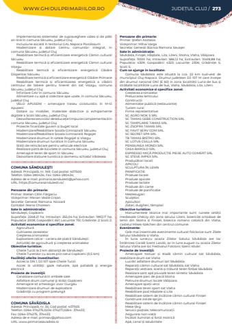WWW.GHIDULPRIMARIILOR.RO JUDE%u021aUL CLUJ / 273Implementarea sistemelor de supraveghere video %u0219i de pl%u0103%u021bi on-line %u00een comuna S%u0103cuieu, jude%u021bul ClujIncluziune social%u0103%u00a0%u00een teritoriul GAL Napoca PorolissumModernizare %u0219i dotare Centru comunitar integrat, %u00een comuna%u00a0S%u0103cuieu, jude%u021bul%u00a0ClujReabilitare termic%u0103%u00a0%u0219i eficientizare energetic%u0103%u00a0C%u0103min cultural S%u0103cuieuReabilitare termic%u0103%u00a0%u0219i eficientizare energetic%u0103%u00a0C%u0103min cultural Vi%u0219aguReabilitare termic%u0103%u00a0 %u0219i eficientizare energetic%u0103%u00a0 Cl%u0103dire Dispensar S%u0103cuieuReabilitare termic%u0103%u00a0%u0219i eficientizare energetic%u0103%u00a0Cl%u0103dire PrimarieReabilitare termic%u0103 %u0219i eficientizarea energetic%u0103 a cl%u0103dirii centrului de tabere pentru tineret din sat Vi%u0219agu, comuna S%u0103cuieu, jude%u021bul Cluj%u00cenfiin%u021bare CAV %u00een comuna%u00a0S%u0103cuieuAlimentare cu ap%u0103%u00a0%u0219i colectare ape uzate, %u00een comuna%u00a0S%u0103cuieu, jude%u021bul%u00a0ClujVELO APUSENI %u2013 amenajare traseu cicloturistic %u00een M-tii ApuseniDotare cu mobilier, materiale didactice %u0219i echipamente digitale a %u0218colii S%u0103cuieu, jude%u021bul%u00a0ClujDezvoltarea serviciilor de educa%u021bie timpurie complementar%u0103%u00a0%u00een comuna S%u0103cuieu, jude%u021bul%u00a0ClujProiecte finan%u021bate guvern %u0219i buget localModernizare/Reabilitare %u0218coala Gimnazial%u0103%u00a0S%u0103cuieuModernizare/Reabilitare %u0218coala Gimnazial%u0103%u00a0RogojelModernizare drumuri %u00een satele Rogojel %u0219i VisaguModernizare drumuri turistice %u00een Comuna S%u0103cuieuSta%u021bii de re%u00eenc%u0103rcare pentru%u00a0vehicule electriceRealizare pist%u0103%u00a0de biciclete %u00een comuna S%u0103cuieu, jude%u021bul ClujAmenajare teren de sport %u00een S%u0103cuieuDezvoltare sta%u021biune turistica %u0219i domeniu schiabil Vl%u0103deasaCOMUNA S%u0102NDULE%u015eTIAdres%u0103: Principal%u0103, nr. 169; Cod po%u0219tal: 407500Telefon: 0264-280434; Fax: 0264-280434; Adresa de e-mail: primaria.sandulesti@yahoo.comURL: https://comunasandulesti.ro/Persoane din primarie:Primar: Stelian C%u0103lin F%u0103rgaciu%u00a0Viceprimar:%u00a0Marian%u00a0Vasile%u00a0Cri%u0219an%u00a0Secretar General:%u00a0Ramona%u00a0%u00a0Nicoar%u0103Contabil:%u00a0Ileana%u00a0ChioreanSate %u00een administra%u021bie:S%u0103ndule%u015fti, Cop%u0103ceniSuprafa%u021ba:%u00a02248,21 ha; Intravilan:%u00a0255,04 ha; Extravilan:%u00a01993,17 ha; Popula%u021bia:%u00a02008; Gospod%u0103rii:%u00a0651; Locuin%u021be:%u00a0751; Gr%u0103dini%u021be:%u00a02; %u0218coli:%u00a02; Activitati economice si specifice zonei:Agricultur%u0103Cultivarea cerealelorCre%u015fterea animalelorExploatare calcar - cariera de piatr%u0103 S%u0103ndule%u015ftiActivit%u0103%u0163i de agricultur%u0103 %u015fi cre%u015fterea animalelorObiective turistice:Cheile Turzii la 2 km distan%u0163%u0103 de S%u0103ndule%u015ftiCheile Turenilor cu acces prin satul Cop%u0103ceni (0,5 km)Facilit%u00e3%u0163i oferite investitorilor:Acces la DN 1, DJ 107 spre Cheile TurziiAcces la utilit%u0103%u0163i: gaze naturale, ap%u0103 potabil%u0103 %u015fi energie electric%u0103Proiecte de investi%u0163ii:Canalizare comun%u0103 %u00een ambele sateAsfaltare drum comunal %u015fi str%u0103zi Cop%u0103ceniAmenajare sit arheologic izvor Ciurg%u0103uModernizare drumuri de exploatareGr%u0103dini%u0163%u0103 cu program prelungitCOMUNA S%u0102V%u0102DISLAAdres%u0103: Principal%u0103, nr. 35; Cod po%u0219tal: 407505Telefon: 0264-374275,0234-374271,0264- 374433; Fax: 0264-374275, 374433; Adresa de e-mail: primsav@yahoo.comURL: www.primariasavadisla.roPersoane din primarie:Primar:%u00a0%u015etefan%u00a0Asztalos%u00a0Viceprimar: Mihai VargaSecretar General:%u00a0Bianca%u00a0Ramona%u00a0Sava%u015fer%u00a0Sate %u00een administra%u021bie:S%u0103v%u0103disla, Fini%u015fel, H%u0103%u015fdate, Lita, Liteni, Stolna, Vlaha, V%u0103li%u015foaraSuprafa%u021ba:%u00a011000 ha; Intravilan:%u00a0586,12 ha; Extravilan:%u00a010418,88 ha; Popula%u021bia:%u00a0 4309; Gospod%u0103rii:%u00a0 4323; Locuin%u021be:%u00a0 2306; Gr%u0103dini%u021be:%u00a0 5; %u0218coli:%u00a05; Cum se ajunge in localitate:Comuna S%u0103v%u0103disla este situat%u0103%u00a0 la cca. 22 km sud-vest de municipiul Cluj-Napoca. Drumul jude%u021bean DJ 107 M care %u00eencepe din drumul na%u021bional DN1%u00a0(E 60) %u00een zona localit%u0103%u021bii Luna de Sus %u0219i str%u0103bate localit%u0103%u021bile Luna de Sus, Vlaha, S%u0103v%u0103disla, Lita, LiteniActivitati economice si specifice zonei:Cre%u0219terea animalelorPrelucrarea lemnuluiConstruc%u021biiAlimenta%u021bie public%u0103 (restaurante)Turism ruralFirme reprezentative:SC AGRO NOK S SRLSC TAMAS GEBE CONSTRUCTION SRLSC TAMPLARIE TAMAS SRLSC ZSOFRA TAMAS SRLSC FAVIT SERV COM SRLSC SECRET SPA SRLTB TAMAS BISTRO SRLSC LOTUS CSILLA SRLPENSIUNEA MONDI SRLCASA BAROLO SRLESPRESSO MIC%u0102 PRODUC%u021aIE PIESE AUTO COMERT SRLSC STEVE IMPEX SRLProduc%u0103tori locali:APICOLISCULPTURA %u00ceN LEMNPANIFICA%u021aIEProduse locale:Produse apicoleProduse lactateProduse din carneProduse de panifica%u021bieMe%u0219te%u0219ugari:SculptoriApicultoriZidari, dulgheri, t%u00e2mplariObiective turistice:Monumentele istorice mai importante sunt: ruinele cet%u0103%u021bii medievale Gh%u00e9czy din zona satului Liteni, bisericile ortodoxe de lemn din Stolna %u0219i Fini%u0219el, biserica romano catolic%u0103 din Vlaha, castelul Mikes-Sz%u00e9chen din centrul comuneiEvenimente:Cele mai %u00eensemnate evenimente cultural-folclorice sunt Zilele Satului S%u0103v%u0103disla %u0219i Vlaha.%u00cen luna iunie,cu ocazia Zilelor Satului S%u0103v%u0103disla are loc %u00cent%u0103lnirea Coral%u0103 Szent Laszl%u00f3, iar %u00een luna august cu ocazia Zilelor Satului Vlaha are loc Festivalul Folcloric Szent Istv%u00e1nProiecte de investi%u0163ii:Amenajare trotuar %u0219i stad%u0103%u00a0 c%u0103mi