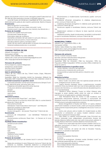 WWW.GHIDULPRIMARIILOR.RO JUDE%u021aUL CLUJ / 275g%u0103sesc dou%u0103%u00a0plante unice %u00een lume: astragalus peterfii descris%u0103 %u00eenc%u0103 din 1916 de c%u0103tre botanistul Javorko, %u0219i Ephedra distachia.Lacul din Suatu, se %u00eentinde pe o suprafa%u021b%u0103%u00a0de 70 ha. Lacul este o destina%u021bie pentru pescuit, dar %u0219i pentru petrecerea%u00a0 liber%u0103%u00a0a timpuluiEvenimente:Balul strugurilor %u00een octombrieFestivalul florilor de mai ( zilele comunei) %u2013iunie Diverse ocazii ( ziua copilului, ziua mamei, ziua femeii etc%u2026)Proiecte de investi%u0163ii:Construire capel%u0103%u00a0mortuar%u0103%u00a0SuatuIntroducerea re%u021belei de gazPrelungire re%u021bea de canalizareMontarea camerelor de luat vederi %u00een comun%u0103%u00a0( 96 buc )Sta%u021bii de %u00eenc%u0103rcare pentru ma%u0219ini electriceMicrobus electric pentru transport eleviDot%u0103ri s%u0103li de clas%u0103%u00a0%u0219i sal%u0103%u00a0de sport la %u0218coala Gimnazial%u0103%u00a0Suatu Dotarea buldoexcavatorului cu accesoriiCOMUNA TRITENII DE JOSAdres%u0103: Principal%u0103, nr. 392; Cod po%u0219tal: 407550Telefon: 0264-285998; Fax: 0264-285998; Adresa de e-mail: primaria.triteniidejos@yahoo.comURL: https://primariatriteniidejos.ro/Persoane din primarie:Primar:Septimiu Gabriel M%u0103rgineanViceprimar: Aurel CeclanSecretar:Adina Deo%u015fean%u00a0Contabil:Viorica Toth%u00a0Sate %u00een administra%u021bie:Tritenii de Jos, Tritenii de Sus, Tritenii Hotar, Clapa, P%u0103dureni, Tritenii ColonieSuprafa%u021ba:%u00a0 5948 ha; Intravilan:%u00a0 641,60 ha; Extravilan:%u00a0 5306,40 ha; Popula%u021bia:%u00a04657; Gospod%u0103rii:%u00a01457; Locuin%u021be:%u00a01641; Gr%u0103dini%u021be:%u00a04; %u0218coli:%u00a04; Activitati economice si specifice zonei:Cultivarea plantelor (cartof-aprovizion%u00e2nd zona C%u00e2mpia TurziiTurda, sfecl%u0103 de zah%u0103r, porumb, gr%u00e2u, etc)Cre%u015fterea animalelor (porcine, ovine, bovine)Producere c%u0103r%u0103mizi (wienerberger)Mor%u0103ritPanifica%u0163ieAgricultur%u0103Comer%u0163Obiective turistice:Casa memorial%u0103 %u201cPavel Dan%u201d - sat ClapaBustul statuar al scriitorului Pavel Dan aflat %u00een curtea bisericii ortodoxe din Tritenii de JosMonumentul EroilorM%u00e2n%u0103stirea %u201cAdormirea Maicii Domnului%u201d - sat P%u0103dureniBisericile ortodoxe %u015fi reformateP%u0103durile din %u00eemprejurimiMuzeul etnografic - din %u015ecoala %u201cPavel Dan%u201d Tritenii de JosEvenimente:Concurs de interpretare - voci b%u0103rb%u0103te%u015fti %u201cFestivalul Ion Cristoreanu%u201dComemorarea scriitorului Pavel Dan - %u00een fiecare an %u00een luna septembrieFacilit%u00e3%u0163i oferite investitorilor:Infrastructur%u0103 rutier%u0103TerenElectricitateGaze NaturaleAp%u0103CanalizareTelefonie fix%u0103 %u015fi mobil%u0103For%u0163%u0103 de munc%u0103Proiecte de investi%u0163ii:Modernizare drumuri de interes local %u00een comuna Tritenii de JosRe%u021bea de canalizare %u00een satul P%u0103durenii, Comuna Tritenii de JosDotarea cu mobilier, materiale didactice %u0219i echipamente digitale ale %u0218colii Gimnaziale%u201d Pavel Dan%u201d comuna Tritenii de JosEficientizarea %u0219i modernizarea iluminatului public comuna Tritenii de JosCre%u0219terea eficien%u021bei energetice %u00een cl%u0103direa dispensarului uman, comuna Tritenii de JosCre%u0219terea eficien%u021bei energetice %u00een cl%u0103direa %u0219colii generale Nr. 60, comuna Tritenii de JosConstruire capel%u0103 %u00een localitatea Colonia, comuna Tritenii de JosModernizare vestiare %u0219i tribune la baza sportiv%u0103 comuna Tritenii de Jos Asfaltarea str%u0103zilor dup%u0103 introducerea canaliz%u0103rii %u0219i aliment%u0103rii cu ap%u0103 %u00een localitatea P%u0103durenii, comuan Tritenii de JosMUNICIPIUL TURDAAdres%u0103: P-%u0163a 1 Decembrie 1918, nr. 28;Cod po%u0219tal: 401184Telefon: 0264-313160; Fax: 0264-317081; Adresa de e-mail: primaria@primariaturda.roURL: www.primariaturda.roPersoane din primarie:Primar: Cristian Octavian MateiSecretar General: Mihaela Elena M%u0103rgineanDirector Executiv: Liliana VonicaSuprafa%u021ba:%u00a0 9156 ha; Intravilan:%u00a0 1780 ha; Extravilan:%u00a0 7376 ha; Popula%u021bia:%u00a057966; Gospod%u0103rii:%u00a010700; Locuin%u021be:%u00a021954; Gr%u0103dini%u021be:%u00a012; %u0218coli:%u00a09; Licee:%u00a05; Activitati economice si specifice zonei:Turism balnear, cultural %u015fi de agrementConstruc%u0163ii %u015fi materiale de construc%u0163iiComponente %u015fi subansamble pentru industria autoTurismComer%u0163Obiective turistice:Patrimoniu cultural %u0219i istoric:- Salina Turda: Una dintre cele mai spectaculoase saline din lume, atr%u0103g%u00e2nd anual mii de turi%u0219ti.- Castrul Roman Potaissa: Parte a patrimoniului mondial UNESCO, fiind unul dintre cele mai mari %u0219i bine p%u0103strate castruri romane din Rom%u00e2nia, cu o semnifica%u021bie istoric%u0103 deosebit%u0103 pentru zona transilv%u0103nean%u0103.- Obeliscul Mihai Viteazul: Trupul lui Mihai Viteazul este %u00eengropat la acest obelisk astfel, acest loc este un simbol al sacrificiului %u0219i al luptei pentru unitatea na%u021bional%u0103.- Sala Polivalent%u0103 Nova PG Arena: O sal%u0103 modern%u0103, care g%u0103zduie%u0219te evenimente sportive, culturale %u0219i comunitare de amploare. Nova PG Arena reprezint%u0103 un punct de referin%u021b%u0103 pentru infrastructura cultural%u0103 %u0219i sportiv%u0103 a ora%u0219ului.- Sec%u021bia etnografic%u0103 %u0219i Muzeul de Istorie: Un spa%u021biu dedicat valorific%u0103rii tradi%u021biilor %u0219i istoriei locale, unde sunt expuse artefacte %u0219i documente importante pentru %u00een%u021belegerea trecutului Turzii %u0219i a regiunii.- Centru de cultur%u0103, art%u0103 %u0219i tradi%u021bii, (%u00een modernizare) va oferi locuitorilor %u0219i vizitatorilor un spa%u021biu modern dedicat culturii, educa%u021biei %u0219i petrecerii timpului liber.- Alte cl%u0103diri cu valoare monumental%u0103: Casa Princiar%u0103 sau Palatu