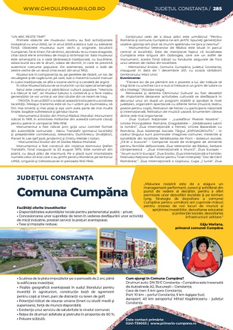 WWW.GHIDULPRIMARIILOR.RO JUDE%u021aUL CONSTAN%u021aA / 285%u201cUN ARC PESTE TIMP%u201d.%u00a0Primele obiecte ale muzeului nostru au fost achizi%u0163ionate %u00eencep%u00e2nd cu anul 2002, iar %u00een anul 2003 acesta a luat cu adev%u0103rat fiin%u0163%u0103. Obiectele muzeului sunt vechi %u015fi originale, locuitorii Cumpenei, fie ei tineri, fie v%u00e2rstnici, don%u00e2ndu-le cu mare dragoste, chiar dac%u0103 ele le aminteau de mo%u015fii %u015fi str%u0103mo%u015fii lor. Sala muzeului este amenajat%u0103 ca o cas%u0103 %u0163%u0103r%u0103neasc%u0103 tradi%u0163ional%u0103, cu buc%u0103t%u0103rie, odaia bun%u0103 sau de la drum, odaia de dormit, %u00een care se prezint%u0103 autentice costume populare. De asemenea, exist%u0103 o lad%u0103 de zestre veche de un secol (mai exact din anul 1912).Muzeul are %u00een componen%u0163a sa, pe peretele de r%u0103s%u0103rit, un loc de reculegere %u015fi de rug%u0103ciune, pe care, sub o maram%u0103 cusut%u0103 manual %u00een culori tradi%u0163ionale, se afl%u0103 4 icoane vechi %u015fi o candel%u0103 de argint.%u00cen viitor Muzeul Satului se va muta %u00eentr-un loc special amenajat.%u00a0Satul este creatorul %u0219i p%u0103str%u0103torul culturii populare. %u201cVe%u0219nicia s-a n%u0103scut la sat%u201d, iar Muzeul Satului o conserv%u0103 %u015fi o face cadou genera%u0163iilor ce vor urma %u015fi vor dori s%u0103 %u015ftie din ce neam se trag.- TROI%u0162A. %u00cen anul 2007 s-a ridicat aceast%u0103 troita pentru ocrotirea localit%u0103%u0163ii. Mesajul transmis este s%u0103 nu-l uit%u0103m pe Dumnezeu, s%u0103 fim mai smeri%u0163i %u015fi mai pio%u015fi %u015fi a%u015fa vom avea parte de mai mult%u0103 lini%u015fte, bog%u0103%u0163ie sufleteasc%u0103 %u015fi g%u00e2nduri bune.- Monumentul Eroilor din Primul R%u0103zboi Mondial. Monument ridicat %u00een 1919, %u00een amintirea militarilor din aceast%u0103 comun%u0103 c%u0103zu%u0163i pentru patrie %u00een campania 1916-1918.%u00a0Monumentul a fost ridicat prin grija unui comitet format din autorit%u0103%u0163ile comunale - Alecu Trandafir (primarul localit%u0103%u0163ii %u015fi pre%u015fedintele comitetului), Alexandru Dumitrescu (%u00eenv%u0103%u0163%u0103tor), Panait N. Lae (%u015fef post jandarmi) %u015fi Cristiu Melide ( notar).%u00a0- Monumentul Eroilor din Al Doilea R%u0103zboi Mondial.Monumentul a fost construit din in%u0163iativa domnului %u015etefan Trandafir, fiind inaugurat la 23 august 1975. Este construit din piatr%u0103, cu dou%u0103 pl%u0103ci de marmur%u0103. Pe o plac%u0103 sunt imortalizate numele celor 23 eroi care s-au jertfit pentru Rom%u00e2nia pe teritoriul URSS, Ungariei %u015fi Cehoslovaciei %u00een perioada 1941-1945.Con%u0163inutul celei de a doua pl%u0103ci este urm%u0103torul: %u201cPentru Rom%u00e2nia %u015fi comuna Cump%u0103na ne-am jertfit. Spune%u0163i genera%u0163iilor voastre-glorio%u015fi am %u015ftiut s%u0103 murim ap%u0103r%u00e2ndu-ne %u0163ara %u015fi neamul%u201d.- Monumentul Veteranilor de R%u0103zboi este situat %u00een parcul central al localit%u0103%u0163ii. Este de men%u0163ionat faptul c%u0103 localitatea Cump%u0103na este singura din Dobrogea, care are un astfel de monument, acesta fiind ridicat cu fondurile asigurate de fiica unui veteran de r%u0103zboi din localitate.- Memorialul Eroilor, Comuna Cump%u0103na, jude%u021bul Constan%u021ba, inaugurat %u00een data de 1 decembrie 201, cu ocazia s%u0103rb%u0103torii Centeranului Marii UniriEvenimente:%u201cFiecare loc de pe p%u0103m%u00e2nt are o poveste a lui, dar trebuie s%u0103 tragi bine cu urechea ca s-o auzi %u0219i trebuie %u0219i un gram de iubire ca s%u0103 o %u00een%u021belegi.%u201d (Nicolae Iorga)Renovarea %u015fi dotarea C%u0103minului Cultural au fost deosebit de importante deoarece activitatea cultural%u0103%u00a0 se desf%u0103%u015foar%u0103 %u00een decursul unui an dup%u0103 un program stabilit %u015fi aprobat la nivel jude%u0163ean, organiz%u0103m spectacole cu diferite teme (muzic%u0103, teatru, poezie pentru copii), festivaluri de folclor cu participare na%u0163ional%u0103 %u015fi interna%u0163ional%u0103, festivaluri de muzic%u0103%u00a0u%u0219oar%u0103. Enumer%u0103m c%u00e2teva dintre cele mai importante:-%u00a0 Ziua Culturii Na%u0163ionale - %u201eLuceaf%u0103rul Poeziei Noastre%u201d , Unirea Principatelor Rom%u00e2ne, Dragobetele %u2013 %u201eS%u0103rb%u0103toarea iubirii la rom%u00e2ni%u201d, Ziua Interna%u0163ional%u0103 a Femeii, Unirea Basarabiei cu Rom%u00e2nia, Ziua Asisten%u0163ei Sociale, T%u00e2rgul %u201eEXPOAGROUTIL%u201d %u2013 %u00een cadrul t%u00e2rgului sunt promovate imaginea comunei, meseriile %u015fi societ%u0103%u0163ile din localitate, S%u0103rb%u0103toarea de Florii %u2013 botezuri sociale, %u201eF%u0103-le o bucurie%u201d %u2013 Campanie local%u0103 de str%u00e2ngere de alimente pentru familiile defavorizate, Ziua Veteranilor de R%u0103zboi, Serbare c%u00e2mpeneasc%u0103 %u2013 %u201eZiua Interna%u0163ional%u0103 a Muncii%u201d, Ziua Europei %u2013 %u2019%u2019Acum sunt %u00een Europa%u2019%u2019, Ziua Eroilor, Ziua Interna%u0163ional%u0103 a Familiei, Festivalul Na%u0163ional de Folclor pentru Tineri Interpre%u0163i %u2019%u2019Dor de C%u00e2nt Rom%u00e2nesc%u2019%u2019, Ziua Interna%u0163ional%u0103 a Copilului, Cupa %u201e1 Iunie%u201d, Ziua