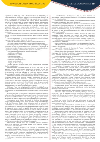 WWW.GHIDULPRIMARIILOR.RO JUDE%u021aUL CONSTAN%u021aA / 291suprafa%u021b%u0103 de 12.981 mp a fost achizi%u021bionat de la SC IMUM SA prin intermediul unui lichidator judiciar. Parcul cuprinde 3 locuri de joac%u0103 cu suprafa%u021ba total%u0103 de 1 751.68 mp, o zon%u0103 pentru relaxare %u0219i un amfiteatru cu gradene din beton armat elicopterizat av%u00e2nd %u00een zona central%u0103 un splash pad din beton elicopterizat cu cuar%u021b, suprafa%u021ba amfiteatrului fiind de aproximativ 529.92 mp. Amenajarea parcului IMUM a avut %u00een vedere %u00eembun%u0103t%u0103%u021birea mediului urban prin reconversia func%u021bional%u0103 a unui teren degradat %u0219i transformarea acestuia %u00eentr-un parc modern, util %u0219i extrem de necesar pentru petrecerea timpului liber, unde acum se g%u0103sesc:- zon%u0103 de promenad%u0103 format%u0103 din alei amenajate, spa%u021biu verde format cu mixuri de plante perene-flori, arbori diferite specii %u0219i gazon;-%u00a03 zone amenajate cu locuri de joac%u0103 pentru copii cu v%u00e2rste cuprinse %u00eentre 3-5 ani, 6-9 ani %u0219i 10- 12 ani;-%u00a0zon%u0103 de relaxare amenajat%u0103 pentru persoane v%u00e2rstnice;-%u00a0f%u00e2nt%u00e2n%u0103 artezian%u0103 plasat%u0103 %u00een centrul zonei de agrement.Reamenajare Parc Nord - zona Intim din municipiul Medgidia Finan%u021bare: Buget local Valoarea total%u0103 a proiectului: 6.250.678 lei Parcul reamenajat din zona Intim cuprinde un loc de joac%u0103 cu o suprafa%u021b%u0103 de 701 mp %u0219i este dotat dup%u0103 cum urmeaz%u0103 :- complex de joac%u0103 exterior tematic%u0103 spa%u021bial%u0103;-%u00a0c%u0103%u021b%u0103r%u0103toare stil lian%u0103;-%u00a0balansoare cu lumini;-%u00a0carusel tip ghiocel;-%u00a0trei balansoare pe arc;-%u00a0balansoar planet%u0103 rotativ%u0103;-%u00a0c%u0103su%u021b%u0103 loc de joac%u0103;-%u00a0leag%u0103n cu dou%u0103 locuri;- tunel, precum %u0219i juc%u0103rii care imit%u0103 instrumente muzicale: xilofon, harp%u0103, tobe.Reamenajarea suprafe%u021bei totale a locului de joac%u0103 a fost realizat%u0103 cu un covor elastic antitraum%u0103, %u00een culori vii, au fost reabilitate aleile pietonale, a fost asfaltat drumul de acces %u0219i amenajate locuri de parcare. A mai fost plantat material dendrologic format din arbori foio%u0219i, arbori r%u0103%u0219ino%u0219i %u0219i gazonReabilitare %u0219i modernizare Parc Nicolae B%u0103lcescu - zona Po%u0219t%u0103 Finan%u021bare: Buget local Valoarea total%u0103 a proiectului: 624.437 lei Pentru Parcul Nicolae B%u0103lcescu - zona Po%u0219t%u0103 au fost realizate lucr%u0103ri pentru realizarea instala%u021biei electrice subterane, iluminat pietonal, trotuar perimetral %u0219i reabilitat%u0103 zona de promenad%u0103 format%u0103 din alei amenajate, spa%u021biu verde format cu mixuri de plante perene-flori, arbori diferite specii %u0219i gazon%u00cenfiin%u021bare Parc - zona Spitalului Municipal Medgidia %u00cen anul 2024, echipele societ%u0103%u021bii Apollo Ecoterm SRL, au %u00eenfiin%u021bat pe strada Ion Creang%u0103, un spa%u021biu de odihn%u0103 %u0219i recreere pentru locuitorii din zon%u0103.Au fost realizate lucr%u0103ri pentru realizarea instala%u021biei electrice subterane, iluminat pietonal, trotuar perimetral %u0219i construire zon%u0103 de promenad%u0103 format%u0103 din alei amenajate, spa%u021biu verde format din arbori de diferite specii %u0219i au fost montate rulouri de gazon.Amenajarea unor locuri de joac%u0103 %u00een incinta Complexului Sportiv, pe strada Republicii, zona Hidrofor %u0219i pe strada Pe%u0219terii nr. 2 bis Finan%u021bare: Buget local Valoarea total%u0103 a proiectului: 1.390.772,06 lei. Elementele variate existente %u00een locurile de joac%u0103 au fost alese cu grij%u0103, respect%u00e2nd standardele europene %u0219i priorit%u0103%u021bile de siguran%u021b%u0103 pentru copii. %u00cen spa%u021biile destinate locurilor de joac%u0103 au fost realizate suprafe%u021be cu covor de tartan special conceput pentru atenuarea %u0219ocurilor %u0219i antiderapant, reduc%u00e2nd riscul de accident%u0103ri. %u00cen plus, fiecare loc de joac%u0103 este echipat cu b%u0103nci pentru odihn%u0103 %u0219i co%u0219uri de gunoi pentru a men%u021bine cur%u0103%u021benia %u00een jurul spa%u021biilor de divertisment. Toate lucr%u0103rile efectuate au contribuit la asigurarea condi%u021biilor optime de petrecere a timpului liber, la cre%u0219terea gradului de siguran%u021b%u0103 a copiilor %u0219i a gradului de confort pentru cet%u0103%u021benii municipiului Medgidia.Revitalizare urban%u0103 prin art%u0103 stradal%u0103 pentru obiectivul %u201cPod rutier Medgidia%u201d Finan%u021bare: Buget local Valoarea total%u0103 a proiectului: 1.519.475,30 leiPentru cre%u0219terea accesului la cultur%u0103 a cet%u0103%u021benilor din municipiul Medgidia, dar %u0219i pentru crearea de noi puncte culturale %u0219i atractive %u00een ora%u0219, au fost realizate pe o suprafa%u021b%u0103 de 5.000 mp, urm%u0103toarele lucr%u0103ri: cur%u0103%u021barea suprafe%u021belor de impurit%u0103%u021bile care ar fi putut afecta aplicarea vopselelor, inclusiv efectuarea de repara%u021bii %u0219i realizarea de picturi urbane.Proiectul a avut c%u00e2teva obiective centrale, printre care putem enumera:-%u00a0 transformarea municipiului %u00eentr-un hub cultural de promovare a patrimoniului na%u021bional %u0219i includerea obiectivului %u00eentr-un circuit turistic;-%u00a0promovarea arti%u0219tilor grafferi %u0219i %u00eencurajarea tinerelor talente s%u0103 urmeze o carier%u0103 %u00een domeniul %u201eStreet art%u201d.Extinderea %u015fi modernizarea iluminatului public Pe raza unit%u0103%u021bii administrativ teritoriale Medgidia, %u00een perioada 2016-2024 au fost executate lucr%u0103ri electrice de interes public pentru care au fost folosite %u00een total: 1914 l%u0103mpi, 240 de proiectoare, 1341 de bra%u021be, 1154 de becuri cu led, 44 de bran%u0219amente, 212 st%u00e2lpi %u0219i 35.975 ml de cablu electric, astfel:-%u00a0 mentenan%u0