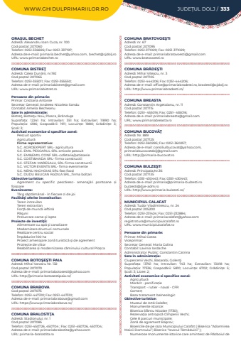 WWW.GHIDULPRIMARIILOR.RO JUDE%u021aUL DOLJ / 333ORA%u0218UL BECHETAdres%u0103: Alexandru Ioan Cuza, nr. 100Cod po%u0219tal: 207060Telefon: 0251-336826; Fax: 0251-337197; Adresa de e-mail: primaria.bechet@yahoo.com , bechet@cjdolj.roURL: www.primariabechet.roCOMUNA BISTRE%u0162Adres%u0103: Calea Dun%u0103rii, nr.192Cod po%u0219tal: 207065Telefon: 0251-355011; Fax: 0251-355550; Adresa de e-mail: primariabistret@gmail.comURL: www.primariabistret.roPersoane din primarie:Primar: Cristiana AntonieSecretar General: Andreea Nicoleta SanduContabil: Amelia BecheanuSate %u00een administra%u021bie:Bistre%u0163,%u00a0Bistre%u0163u Nou, Plosca, Br%u00e2ndu%u015faSuprafa%u021ba:%u00a0 12241 ha; Intravilan:%u00a0 351 ha; Extravilan:%u00a0 11890 ha; Popula%u021bia:%u00a0 4186; Gospod%u0103rii:%u00a0 1911; Locuin%u021be:%u00a0 1880; Gr%u0103dini%u021be:%u00a0 3; %u0218coli:%u00a03; Activitati economice si specifice zonei:Pescuit sportivAgricultur%u0103Firme reprezentative:S.C. AGROEXPERT SRL- agriculturaS.C. EMIL PESCARUL SRL-articole pescuitS.C. EMI&EMtL CONF SRL-cofetarie/patisserieS.C. COSTI&MADA SRL- firma constructiiS.C. STEFAN MARESALU, SRL-firma constructiiS.C. VICTOR EVENTS SRL- firma evenimenteS.C. NENU NtCHOIAS SRL-fast foodS.C. DUDU BEUCAN RoDtcA SRL_firma bol%u021bariObiective turistice:Agrement cu specific pesc%u0103resc- amenaj%u0103ri pontoane %u0219i foi%u0219oareEvenimente:T%u00e2rg s%u0103pt%u0103m%u00e2nal - %u00een%u00a0fiecare zi de joiFacilit%u00e3%u0163i oferite investitorilor:Teren intravilanTeren extravilanFor%u0163%u0103 de munc%u0103 ieftin%u0103P%u0103%u015funiPrelucrare carne %u015fi lapteProiecte de investi%u0163ii:Alimentare cu ap%u0103 %u015fi canalizareModernizare drumuri comunaleRealizare centru social%u00cemp%u0103durire 100 haProiect amenajare zon%u0103 turistic%u0103 %u015fi de agrementProirecte de viitorReabilitarea %u0219i modernizarea c%u0103minului cultural Plo%u0219caCOMUNA BOTO%u015eE%u015eTI PAIAAdres%u0103: Mihai Varzaru Nr. 132Cod po%u0219tal: 207070Adresa de e-mail: primariabotosesti@yahoo.comURL: http://primaria-botosestipaia.ro/COMUNA BRABOVACod po%u0219tal: 207075Telefon: 0251-447310; Fax: 0251-447310; Adresa de e-mail: primariabrabova@gmail.comURL: https://www.primariabrabova.ro/COMUNA BRALOSTI%u0162AAdres%u0103: Stadionului, nr. 1Cod po%u0219tal: 207085Telefon: 0251-450726, 450704 ; Fax: 0251-450726, 450704; Adresa de e-mail: primariabralostita@yahoo.comURL: primaria-bralostita.roCOMUNA BRATOVOE%u015eTIAdres%u0103: nr. 67Cod po%u0219tal: 207095Telefon: 0251-371029; Fax: 0251-371029; Adresa de e-mail: primariabratovoesti@gmail.comURL: www.bratovoesti.roCOMUNA BR%u0102DE%u015eTIAdres%u0103: Mihai Viteazu, nr. 3Cod po%u0219tal: 207105Telefon: 0251-444206; Fax: 0251-444206; Adresa de e-mail: office@primariabradesti.ro, bradesti@cjdolj.roURL: http://www.primariabradesti.ro/COMUNA BREASTAAdres%u0103: Constantin Argetoianu, nr. 11Cod po%u0219tal: 207115Telefon: 0251- 455016; Fax: 0251- 455016; Adresa de e-mail: primariabreasta@gmail.comURL: www.primariabreasta.roCOMUNA BUCOV%u0102%u0162Adres%u0103: Nr. 889Cod po%u0219tal: 207125Telefon: 0251-360285; Fax: 0251-360257; Adresa de e-mail: consiliulbucovat@yahoo.com,primariabucovatdolj@gmail.com URL: http://primaria-bucovat.roCOMUNA BULZE%u015eTIAdres%u0103: Principala,Nr.36Cod po%u0219tal: 207135Telefon: 0351-430443; Fax: 0351-430443; Adresa de e-mail: primaria@primaria-bulzesti.robulzesti@dj.e-adm.roURL: http://www.primaria-bulzesti.ro/MUNICIPIUL CALAFATAdres%u0103: Tudor Vladimirescu, nr. 24Cod po%u0219tal: 205200Telefon: 0251-231424; Fax: 0251-232884; Adresa de e-mail: primariacalafat@yahoo.comregistratura@municipiulcalafat.roURL: www.municipiulcalafat.roPersoane din primarie:Primar: Mihai CoteaViceprimar:Secretar General: Maria%u00a0Colina%u00a0Contabil:%u00a0Lavinia%u00a0Iordache%u00a0Administrator Public: Constantin%u00a0Catrina%u00a0Sate %u00een administra%u021bie:Ciupercenii Vechi, Basarabi, Golen%u0163iSuprafa%u021ba:%u00a0 13761 ha; Intravilan:%u00a0 743 ha; Extravilan:%u00a0 13018 ha; Popula%u021bia:%u00a0 17336; Gospod%u0103rii:%u00a0 5810; Locuin%u021be:%u00a0 6702; Gr%u0103dini%u021be:%u00a0 5; %u0218coli:%u00a03; Licee:%u00a02; Activitati economice si specifice zonei:Agricultur%u0103Mor%u0103rit - panifica%u021bieTransport - rutier - naval - CFRComer%u021bBaza tratament balneologicObiective turistice:Muzeul de Art%u0103 Calafat;Monumente istorice:%u00a0Biserica Sf%u00e2ntu Nicolae (1730);Rezerva%u0163ia antropic%u0103 C%u00eempenii Vechi;Cele 8 parcuri municipale;Zon%u0103 de agrement Ba%u015fcov;Bisericile de pe raza Municipiului Calafat ( Biserica %u201cAdormirea Maicii Domnului%u201d; Biserica %u201cIzvorul T%u0103m%u0103duirii%u201d );Numerose monumente istorice care amintesc de R%u0103zboiul de