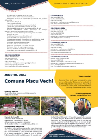 346 / JUDE%u021aUL DOLJ WWW.GHIDULPRIMARIILOR.ROModernizare Dispensar uman Mo%u021b%u0103%u021beiAsfaltare 8 km str%u0103zi %u00een localitatea Mo%u021b%u0103%u021beiAmenajare drumuri de exploata%u021bie agricol%u0103%u00a0DE 303 %u201e%u0218oseaua B%u0103ile%u0219tiuluiActualizare PUG/PUZPia%u021b%u0103 agroalimentar%u0103Lucr%u0103ri de cadastru domeniu privat Mo%u021b%u0103%u021beiLucr%u0103ri de cadastru domeniu public Mo%u021b%u0103%u021beiC%u0103mine ap%u0103-bran%u0219amente la re%u021beaua public%u0103%u00a0de ap%u0103Panouri fotovoltaice pentru produc%u021bia de energie electric%u0103%u00a0pentru sistemul de iluminat publicAchizi%u021bia unui nou tractor %u0219i accesorii prin GAL CalafatProiecte de viitor:Reabilitare Modernizare Gr%u0103dini%u021ba nr. 2 Reabilitare Modernizare Gr%u0103dini%u021ba nr. 3Re%u021bea de ap%u0103%u00a0potabil%u0103%u00a0%u0219i canalizare %u00een satul Mo%u021b%u0103%u021bei-Gar%u0103Re%u021bea de ap%u0103%u00a0potabil%u0103%u00a0%u0219i canalizare %u00een satul DobridorExtindere re%u021bea canalizare Mo%u021b%u0103%u021beiRacorduri individuale canalizareAsfaltarea %u00een totalitate a localit%u0103%u021bi Mo%u021b%u0103%u021beiExtindere sitem de supraveghere videoAchizi%u021bie mobilier C%u0103min Cultural Mo%u021b%u0103%u021beiAmenajare teren de sport %u00een curtea %u0219colii nr. 2COMUNA MURGA%u015eIAdres%u0103: Prim%u0103riei, nr. 1Cod po%u0219tal: 207420Telefon: 0251-447627, 447507; Fax: 0251-447627; Adresa de e-mail: primaria.murgasi@gmail.comprimariamurgasi@yahoo.comURL: http://www.primaria.murgasi.ro/COMUNA NEGOICod po%u0219tal: 207430Telefon: 0251-325088; Fax: 0251-325088; Adresa de e-mail: comuna.negoi@yahoo.roURL: www.primarianegoi.roCOMUNA ORODELAdres%u0103: Principala, nr. 133Cod po%u0219tal: 207435Telefon: 0251-367538; Fax: 0251-367538; Adresa de e-mail: primariaorodel@yahoo.roURL: http://primariaorodel.ro/COMUNA OSTROVENICod po%u0219tal: 207440Telefon: 0251-337366; Fax: 0251-337866; Adresa de e-mail: ostroveni@cjdolj.rocomunaostroveni@yahoo.comURL: www.comunaostroveni.roCOMUNA PISCU VECHIAdres%u0103: Mihai Viteazu, nr. 83Cod po%u0219tal: 207455Telefon: 0251-323002; Fax: 0251-323008; Adresa de e-mail: primariapiscuvechi@yahoo.compiscu_vechi@cjdolj.roURL: http://www.primariapiscuvechi.ro