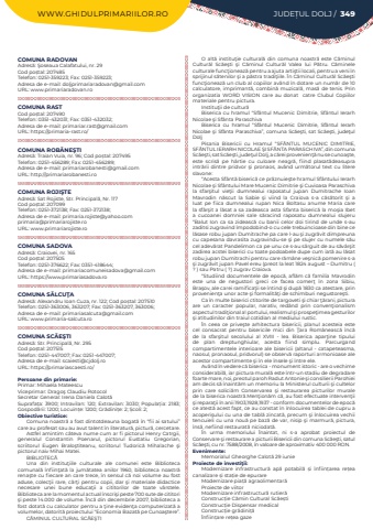 WWW.GHIDULPRIMARIILOR.RO JUDE%u021aUL DOLJ / 349COMUNA RADOVANAdres%u0103: %u015eoseaua Calafatului, nr. 29Cod po%u0219tal: 207485Telefon: 0251-359223; Fax: 0251-359223; Adresa de e-mail: doljprimariaradovan@gmail.comURL: www.primariaradovan.roCOMUNA RASTCod po%u0219tal: 207490Telefon: 0351-432031; Fax: 0351-432032; Adresa de e-mail: primariar.rast@gmail.comURL: https://primaria-rast.ro/COMUNA ROB%u0102NE%u015eTIAdres%u0103: Traian Vuia, nr. 96; Cod po%u0219tal: 207495Telefon: 0251-456289; Fax: 0251-456289; Adresa de e-mail: primariarobanesti@gmail.comURL: http://primariarobanesti.roCOMUNA ROJI%u015eTEAdres%u0103: Sat Rojiste, Str. Principal%u0103, Nr. 117Cod po%u0219tal: 207099Telefon: 0251-372138; Fax: 0251-372138; Adresa de e-mail: primaria.rojiste@yahoo.comprimaria@primariarojiste.roURL: www.primariarojiste.roCOMUNA SADOVAAdres%u0103: Craiovei, nr. 165Cod po%u0219tal: 207505Telefon: 0251-376622; Fax: 0351-418644; Adresa de e-mail: primariacomuneisadova@gmail.comURL: https://www.primariasadova.roCOMUNA S%u0102LCU%u0162AAdres%u0103: Alexandru Ioan Cuza, nr. 122; Cod po%u0219tal: 207510Telefon: 0251-363006, 363207; Fax: 0251-363207, 363006; Adresa de e-mail: primariasalcuta@gmail.comURL: www.primaria-salcuta.roCOMUNA SC%u0102E%u015eTIAdres%u0103: Str. Principal%u0103, Nr. 295Cod po%u0219tal: 207515Telefon: 0251-447007; Fax: 0251-447007; Adresa de e-mail: scaiesti@cjdolj.roURL: https://primariascaesti.ro/Persoane din primarie:Primar: Mihaela MateescuViceprimar: Drago%u015f%u00a0Claudiu RotocolSecretar General: Irena Daniela Calot%u0103Suprafa%u021ba:%u00a0 3900; Intravilan:%u00a0 120; Extravilan:%u00a0 3030; Popula%u021bia:%u00a0 2183; Gospod%u0103rii:%u00a01200; Locuin%u021be:%u00a01200; Gr%u0103dini%u021be:%u00a02; %u0218coli:%u00a02; Obiective turistice:Comuna noastr%u0103 a fost dintotdeauna bogat%u0103 %u00een %u201cfii ai satului%u201d care au profesat sau au avut talent %u00een literatur%u0103, pictur%u0103, cercetare.Astfel amintim c%u00e2teva nume cum ar fi pictorul Henry Catrgii, generalul Constantin Poenarul, pictorul Eustatiu Gregorian, scriitorul Eugen Bralo%u015ftiteanu, scriitorul Tudoric%u0103 Mihalache %u015fi pictorul naiv Mihai Matei.BIBLIOTEC%u0102Una din institu%u0163iile culturale ale comunei este Biblioteca comunal%u0103 %u00eenfiin%u0163at%u0103 la jum%u0103tatea anilor 1960, biblioteca noastr%u0103 rena%u015fte cu fiecare an care trece, %u00een sensul c%u0103 noi volume au fost aduse, colec%u0163ii rare, c%u0103r%u0163i pentru copii, dar %u015fi materiale didactice necesare unei bune educa%u0163ii a cititorilor de toate v%u00e2rstele. Biblioteca are la momentul actual %u00eenscri%u015fi peste 700 sute de cititori %u015fi peste 14.000 de volume. %u00cenc%u0103 din decembrie 2007, biblioteca a fost dotat%u0103 cu calculator pentru a %u0163ine eviden%u0163a computerizat%u0103 a volumelor, datorit%u0103 proiectului %u201cEconomia Bazat%u0103 pe Cunoa%u015ftere%u201d.C%u0102MINUL CULTURAL SC%u0102E%u015eTIO alt%u0103 institu%u0163ie cultural%u0103 din comuna noastr%u0103 este C%u0103minul Cultur%u0103l Sc%u0103e%u015fti %u015fi C%u0103minul Cultur%u0103l Valea lui P%u0103tru. C%u0103minele culturale func%u0163ioneaz%u0103 pentru a ajuta arti%u015ftii locali, pentru a veni %u00een sprijinul s%u0103tenilor %u015fi a p%u0103stra tradi%u0163iile. %u00cen C%u0103minul Cultur%u0103l Sc%u0103e%u015fti func%u0163ioneaz%u0103 un club al copiilor av%u00e2nd %u00een dotare un num%u0103r de 10 calculatore, imprimant%u0103, combin%u0103 muzical%u0103, mas%u0103 de tenis. Prin organizatia WORD VISION care au donat%u00a0 catre Clubul Copiilor materiale pentru pictura.Institu%u0163ii de cultur%u0103Biserica cu hramul %u201cSf%u00e2ntul Mucenic Dimitrie, Sf%u00e2ntul Ierarh Nicolae %u015fi Sf%u00e2nta Paraschiva%u00a0Biserica cu hramul %u201cSf%u00e2ntul Mucenic Dimitrie, Sf%u00e2ntul Ierarh Nicolae %u015fi Sf%u00e2nta Paraschiva%u201d, comuna Sc%u0103e%u015fti, sat Sc%u0103e%u015fti, jude%u0163ul Dolj%u00a0Pisania Bisericii cu Hramul %u201cSF%u00c2NTUL MUCENIC DIMITRIE, SF%u00c2NTUL IERARH NICOLAE %u015eI SF%u00c2NTA PARASCHIVA%u201d, din comuna Sc%u0103e%u015fti, sat Sc%u0103e%u015fti, jude%u0163ul Dolj, a c%u0103rei provenien%u0163%u0103%u00a0nu se cunoa%u015fte, este scris%u0103 pe h%u00e2rtie cu culoare neagr%u0103, fiind plasat%u0103deasupra intr%u0103rii dintre pridvor %u015fi pronaos, av%u00e2nd urm%u0103torul text cu litere slavone:%u201cAcesta Sf%u00e2nt%u0103 biseric%u0103 ce pr%u0103znuie%u015fte hramul Sf%u00e2ntului Ierarh Nicolae %u015fi Sf%u00e2ntului Mare Mucenic Dimitrie %u015fi Cuvioasa Paraschiva la sfar%u015fitul vie%u0163ii dumnealui raposatul%u00a0 jupan Dumitrache Ioan Mavrodin n%u0103scut la Sabie %u015fi viind la Craiova s-a c%u0103s%u0103torit %u015fi a luat pe fiica dumnealui rupan Nica Boltasu anume Maria care la sf%u00e2r%u015fit a l%u0103sat a sa zadeasca asta Sfanta biseric%u0103 la mo%u015fia Ibet a cucoanei domniei sale s%u0103racind raposatu dumnealui slujeru %u201cBalut Ion ca sa zideasc%u0103 cu banii celor doi tirind de unde s-au zaditsi zugravind %u00eempodobind-o cu cele trebuincioase din bine ce l%u0103sase robu jupan Dumitrache pa care l-au %u015fi zugr%u0103vit dimpreuna cu capesana davrasita zugravindu-se %u015fi pe slujer cu numele s%u0103u cel adev%u0103rat Pandelimon ca pe unu ce s-au s%u00e2rguit de au s%u0103v%u00e2r%u015fit zadirea acstei biserici cu toate podoabele dupe cum iat%u0103 au l%u0103sat robu jupan Dumitrachi pentru care r%u0103m%u00e2ne ve%u015fnic%u0103 pomenire s-a %u015fi zugr%u0103vit jupan Pavel ereu (preot la leat 1824 august %u2013 Dumitru ( ? ) sau Patru ( ?) zugrav Craiova.%u201cStudiind documentele de epoc%u0103, afl%u0103m c%u0103 familia Mavrodin este una de negustori greci ce facea comer%u0163%u00a0 %u00een zona Sibiu, Bra%u015fov, ale carei ramifica%u0163ii se %u00eentind %u015fi dup%u0103 1830 ca atestare, prin provenien%u0163a unor acte %u015fi formalit%u0103%u0163i de schimburi negustore%u015fti.Ca %u00een 