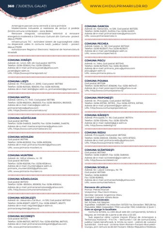 360 / JUDE%u021aUL GALA%u021aI WWW.GHIDULPRIMARIILOR.ROAmenajare parcare zona central%u0103 %u0219i zona prim%u0103rieModernizarea trotuarele %u0219i realizarea de %u0219an%u021buri %u0219i pode%u021be (limit%u0103 comuna Umbr%u0103re%u0219ti %u2013 zona Botez)Renovare integrat%u0103, consolidare seismic%u0103%u00a0 %u0219i renovare energetic%u0103%u00a0moderat%u0103%u00a0a C%u0103minului Cultural din Comuna%u2013 proiect depus PNRRInfrastructura TIC - extindere sistem de supraveghere video cu dispecerat video %u00een comuna Ive%u0219ti, jude%u021bul Gala%u021bi %u2013 proiect depus PNRRAchizi%u021bionare Registrul Electronic Na%u021bional de Nomenclatur%u0103 Stradal%u0103COMUNA JOR%u0102%u015eTIAdres%u0103: str. Unirii ,NR. 49; Cod po%u0219tal: 807175Telefon: 0236-331600; Fax: 0236-331600; Adresa de e-mail: primaria.jorasti@yahoo.comjorasti@gl.e-adm.roURL: https://www.primariajorasti.ro/COMUNA LIE%u015eTIAdres%u0103: str. Principal%u0103, nr. 2095; Cod po%u0219tal: 807180Telefon: 0236-821020, 836010; Fax: 0236-821006; Adresa de e-mail: liesti@gl.e-adm.ro, primarialiesti@gmail.comCOMUNA MATCAAdres%u0103: Centru, nr. 1140; Cod po%u0219tal: 807185Telefon: 0236-860004, 860003; Fax: 0236-860004, 860003; Adresa de e-mail: matca@gl.e-adm.roprimariamatca@yahoo.comURL: https://www.comunamatca.ro/COMUNA M%u0102ST%u0102CANICod po%u0219tal: 807190Telefon: 0236-346503, 346576; Fax: 0236-346980, 346576; Adresa de e-mail: mastacaniprimarie@yahoo.comURL: https://www.comunamastacani.ro/COMUNA MOVILENICod po%u0219tal: 807195Telefon: 0236-823002; Fax: 0236-823006; Adresa de e-mail: primaria.movileni@yahoo.comURL: www.primaria-movileni.roCOMUNA MUNTENIAdres%u0103: str. Mihai Viteazu, nr. 33Cod po%u0219tal: 807200Telefon: 0236-820126; Fax: 0236-832644; Adresa de e-mail: munteni@gl.e-adm.ro primarie_munteni2002@yahoo.comURL: www.primaria-munteni.roCOMUNA N%u0102MOLOASACod po%u0219tal: 807210Telefon: 0236- 830504, 830835; Fax: 0236-830504; Adresa de e-mail: primarianamoloasa@yahoo.comURL: http://www.comunanamoloasa.ro/COMUNA NEGRILE%u015eTIAdres%u0103: str. Alexandru Cel Bun , nr.129; Cod po%u0219tal: 807202Telefon: 0236-832671, 832171; Fax: 0236-832671, 832171; Adresa de e-mail: negrilesti@gl.e-adm.roprimarianegrilesti@yahoo.roCOMUNA NICORE%u015eTICod po%u0219tal: 807215Telefon: 0236-867021, 867127; Fax: 0236-836766, 867103; Adresa de e-mail: primarianicorestigalati@yahoo.comURL: www.primarianicoresti.roCOMUNA OANCEAAdres%u0103: str. Nationala , nr.128; Cod po%u0219tal: 807235Telefon: 0236-343011, 343104; Fax: 0236-343011; Adresa de e-mail: primariaoancea@yahoo.comURL: www.primariaoancea.roCOMUNA PECHEAAdres%u0103: Gala%u0163i, nr. 181; Cod po%u0219tal: 807240Telefon: 0236-823507; Fax: 0236-823507; Adresa de e-mail: pechea@gl.e-adm.roURL: www.comunapechea.roCOMUNA PISCUAdres%u0103: nr. 1464; Cod po%u0219tal: 807245Telefon: 0236-827529; Fax: 0236-840300; Adresa de e-mail: primaria_piscu@yahoo.compiscu@gl.e-adm.roURL: www.primaria-piscu.roCOMUNA POIANACod po%u0219tal: 807226Telefon: 0236-867447, 836696; Fax: 0236-867447; Adresa de e-mail: poianaprimaria@yahoo.co.ukURL: http://www.comunapoiana.ro/COMUNA PRIPONE%u015eTIAdres%u0103: str. Principala; Cod po%u0219tal: 807250Telefon: 0236-337351, 337313, ; Fax: 0236-337313, 337351; Adresa de e-mail: priponesti@gl.e-adm.roURL: http://www.comunapriponesti.ro/COMUNA R%u0102DE%u015eTIAdres%u0103: Principal%u0103, nr. 90; Cod po%u0219tal: 807014Telefon: 0236-333494; Fax: 0236-333479; Adresa de e-mail: radesti@gl.e-adm.roURL: http://www.radestigl.ro/COMUNA REDIUAdres%u0103: Principal%u0103; Cod po%u0219tal: 807255Telefon: 0236-330049, 330355; Fax: 0372-875151; Adresa de e-mail: primaria.rediu@yahoo.comURL: https://www.primaria-rediu.ro/COMUNA SC%u00c2NTEIE%u015eTICod po%u0219tal: 807260Telefon: 0236-348007; Fax: 0236-348000; Adresa de e-mail: scinteiesti@gl.e-adm.roURL: http://www.scinteiesti.ro/COMUNA SCHELAAdres%u0103: Str. Lasc%u0103r Catargiu, Nr. 79Cod po%u0219tal: 807265Telefon: 0236-828100Fax: 0236-828165; Adresa de e-mail: primariaschela@yahoo.comURL: www.comunaschela.roPersoane din primarie:Primar: Petrea MaricelViceprimar: Paul Dorin MoscuSecretar General:%u00a0Argentina OlaruContabil: Gabriela Violeta BozaSate %u00een administra%u021bie:Sat Schela, Sat NegreaSuprafa%u021ba:%u00a04428,594 ha; Intravilan:%u00a0507,512 ha; Extravilan:%u00a03921,08 ha; Popula%u021bia:%u00a03860; Gospod%u0103rii:%u00a01700; Locuin%u021be:%u00a01100; Gr%u0103dini%u021be:%u00a02; %u0218coli:%u00a01; Cum se ajunge in localitate:Comuna Schela, cu cele dou%u0103 sate din componen%u021b%u0103, Schela %u0219i Negrea, se %u00eentinde de o parte %u0219i de alta a DJ 251.Sub aspectul c%u0103ilor rutiere majore (Planul de Amenajare a Teritoriului National %u2013 P.A.T.N. %u2013 Sectiunea 1: C%u0103i de comunica%u021bie), jude%u021bul Gala%u021bi beneficiaz%u0103, la limita sa nord %u2013 vestic%u0103 de culoarul autostr%u0103zii nord%u2013sud Ucraina%u2013Siret%u2013Roman%u2013Foc%u0219ani%u2013Bucure%u0219ti%u2013Giurgiu, prin ramura sa de est Foc%u0219ani%u2013Albi%u021ba%u2013Republica Moldova.