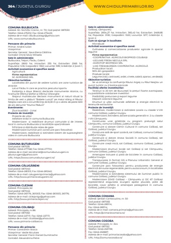 364 / JUDE%u021aUL GIURGIU WWW.GHIDULPRIMARIILOR.ROCOMUNA BULBUCATAAdres%u0103: Str. Nichifor Crainic, nr. 70; Cod po%u0219tal: 087030Telefon: 0246-275312; Fax: 0246-275433; Adresa de e-mail: clbulbucatagr@yahoo.comURL: www.comunabulbucata.roPersoane din primarie:Primar: Andrei IulianViceprimar:%u00a0Secretar General : Sava Elena C%u0103t%u0103linaContabil: Chin%u0103 Silvia MihaelaSate %u00een administra%u021bie:Bulbucata, Tei%u015fori, F%u0103c%u0103u, CoteniSuprafa%u021ba:%u00a0 2800 ha; Intravilan:%u00a0 235 ha; Extravilan:%u00a0 2565 ha; Popula%u021bia:%u00a01416; Gospod%u0103rii:%u00a01350; Locuin%u021be:%u00a0939; Gr%u0103dini%u021be:%u00a02; %u0218coli:%u00a01; Activitati economice si specifice zonei:Agricultur%u0103Firme reprezentative:SC AGROMAD SRL%u00a0Obiective turistice:Localitatea din punct de vedere turistic are zone turistice de atrac%u021bie:Lacul F%u0103c%u0103u %u00een care se practica pescuitul sportivExisten%u0163a a doua Biserici declarate monumente istorice, cu hramurile Sf%u00e2ntul %u015etefan %u015fi Sf%u00e2ntul GheorgheStejarul multisecular declarat monument al naturii situat la limita de vest a p%u0103durii %u201cBabele Lunc%u0103%u201d pe malul st%u00e2ng al R%u00e2ului Neajlov care are o circumferin%u0163a de 8,30 m %u015fi o v%u00e2rsta de peste 600 de ani denumit %u201cMuma P%u0103durii%u201dEvenimente:Ziua localit%u0103%u021bii - 2 maiProiecte de investi%u0163ii:Proiecte de viitor:Asfaltare str%u0103zi %u00een comuna BulbucataModernizare%u00a0 %u0219i reabilitare drumuri comunale %u0219i de interes local %u00een comuna Bulbucata %u0219i localit%u0103%u021bile apar%u021bin%u0103toare%u00cenfiin%u021bare %u0219i distribu%u021bie re%u021bea de gazeModernizare iluminat prin construire parc fotovoltaicModernizare, reabilitare %u0219i extindere sistem de supraveghere video in comuna BulbucataCOMUNA BUTURUGENICod po%u0219tal: 087035Telefon: 0246-277168; Fax: 0246-277110; Adresa de e-mail: secretariat@comunabuturugeni.ro pbuturugeni@yahoo.comURL: https://www.comunabuturugeni.ro/COMUNA C%u0102LUG%u0102RENICod po%u0219tal: 087040Telefon: 0246-281313; Fax: 0246-281240; Adresa de e-mail: calugareniprimaria@yahoo.comURL: http://www.primariacalugareni.ro/COMUNA CLEJANIAdres%u0103: Principala, 62Cod po%u0219tal: 087045Telefon: 0246-261176, 261003; Fax: 0246-261003, 261176; Adresa de e-mail: clclejanigr@yahoo.comURL: http://www.primariaclejani.ro/COMUNA COLIBA%u015eIAdres%u0103: Principala, nr.86Cod po%u0219tal: 087050Telefon: 0246-227111; Fax: 0246-227111; Adresa de e-mail: clcolibasi@yahoo.comURL: www.primaria-colibasi.roPersoane din primarie:Primar: Constantin Stoica%u00a0Viceprimar: Vasile Niculcea%u00a0Secretar General: Florin Daniel DumitracheContabil:%u00a0Alexandrina Petre%u00a0Sate %u00een administra%u021bie:Coliba%u015fi, C%u00e2mpureluSuprafa%u021ba:%u00a0 2834,27 ha; Intravilan:%u00a0 365,42 ha; Extravilan:%u00a0 2468,85 ha; Popula%u021bia:%u00a0 3130; Gospod%u0103rii:%u00a0 1320; Locuin%u021be:%u00a0 1217; Gr%u0103dini%u021be:%u00a0 2; %u0218coli:%u00a02; Cum se ajunge in localitate:MicrobuzeActivitati economice si specifice zonei:Cultivarea %u0219i comercializarea produselor agricole %u00een special legumeFirme reprezentative:-COOPERATIVA%u00a0 AGRICOL%u0102%u00a0BIOPROD COLIBA%u0218I-LEGUME FRESH NECULA SRL-AGROTOP BIOFRESH SRL-LIVE FRESH&GREEN COOPERATIVA%u00a0 AGRICOL%u0102Produc%u0103tori locali:90% din gospod%u0103riiProduse locale:Legume (ro%u021bii, castrave%u021bi, ardei, vinete, salat%u0103, spanac, verdea%u021b%u0103)Obiective turistice:Se va amenaja la confluen%u0163a R%u00e2ului Arge%u015f cu R%u00e2ul Neajlov un punct turistic cu 2 bazine piscicoleFacilit%u00e3%u0163i oferite investitorilor:Terenuri la 20 km de Bucure%u015fti la pre%u0163uri foarte avantajoase, cu posibilitate colaborare investitoriPosibilit%u0103%u0163i prelucrare %u015fi export legumeDepozit colectare legumeDrumuri %u015fi uli%u0163e comunale asfaltate %u015fi energie electric%u0103 la terenurile extravilaneProiecte de investi%u0163ii:Reabilitare, modernizare %u0219i extindere %u0219coala cu clasele V-VIII comuna Coliba%u0219i, jude%u021bul GiurgiuModernizare, extindere, dotare %u0219coala general%u0103 nr. 2 cu clasele I-VIII C%u00e2mpureluConstruirea unei gr%u0103dini%u021be cu program prelungit satul C%u00e2mpurelu, comuna Coliba%u0219i, jude%u021bul GiurgiuConstruire %u0219i dotare C%u0103min Cultural %u00een comuna Coliba%u0219i, sat Coliba%u0219i, jude%u021bul GiurgiuConstruire sal%u0103%u00a0de sport %u0219colar%u0103, sat Coliba%u0219i, comuna Coliba%u0219i, jude%u021bul GiurgiuConstruire %u0219i dotare Anexa Social%u0103%u00a0 %u00een comuna Coliba%u0219i, sat Coliba%u0219i, jude%u021bul GiurgiuConstruire cre%u0219%u0103%u00a0mic%u0103, sat Coliba%u0219i, comuna Coliba%u0219i, jude%u021bul GiurgiuModernizare drumuri locale sat Coliba%u0219i %u0219i sat C%u00e2mpurelu, comuna Coliba%u0219i, jude%u021bul GiurgiuAmenajare trotuare %u0219i pist%u0103%u00a0 de biciclete %u00een comuna Coliba%u0219i, jude%u021bul GiurgiuTranspunerea %u00een format GIS a Planului Urbanistic General al comunei Coliba%u0219i, jude%u021bul GiurgiuConstruire parc fotovoltaic pentru producerea de energie electric%u0103%u00a0din surse regenerabile, pentru autoconsum, %u00een localitatea Coliba%u0219i, jude%u021bul GiurgiuModernizarea %u0219i extinderea sistemului de iluminat public %u00een comuna Coliba%u0219i, jude%u021bul GiurgiuModernizare DJ412 Coliba%u0219i %u2013 C%u00e2mpurelu %u0219i DC 67 Coliba%u0219i reprezent%u00e2nd asigurarea scurgerii apelor pluviale, piste de biciclete, covor asfaltic %u0219i amenejare peisagistic%u0103%u00a0 %u00een comuna Coliba%u0219i, jude%u021bul GiurgiuCOMUNA COMANAAdres%u0103: %u015eerban Cantacuzino, nr. 50Cod po%u0219tal: 087055Telefon: 0246-283114; Fax: 0246-283114; Adresa de e-mail: comana.primaria@yahoo.comURL: https://primariecomana.ro/COMUNA COSOBAAdres%u0103: Principal%u0103, nr. 344Cod po%u0219tal: 087152Telefon: 0246-253739; Fax: 0246-253887; Ad