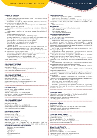 WWW.GHIDULPRIMARIILOR.RO JUDE%u021aUL GIURGIU / 367Proiecte de investi%u0163ii:Proiecte realizate:Modernizare str%u0103zi de interes local %u00een sat Chircule%u015fti, comuna Iepure%u0219ti, jude%u021bul GiurgiuAlimentare cu ap%u0103 %u00een satele Iepure%u0219ti, St%u00e2lpu %u0219i Gorneni, comuna Iepure%u0219ti, jude%u021bul GiurgiuConsolidare, reabilitare, modernizare %u0219i extindere Gr%u0103dini%u021ba cu program normal nr 2 GorneniConsolidare, reabilitare, modernizare %u0219i extindere Gr%u0103dini%u021ba Iepure%u0219tiModernizare, reabilitare %u0219i extindere %u0218coala gimnazial%u0103%u00a0 nr 1 Iepure%u0219tiModernizare sediu prim%u0103rieConsolidare %u0219i reabilitare fosta %u0219coal%u0103%u00a0Iepure%u0219tiModernizare par%u021biala a iluminatului public %u00een comuna Iepure%u0219tiTeren de sport cu gazon sintetic %u00een sat Iepure%u0219tiTeren de sport cu gazon sintetic %u00een sat St%u00e2lpuTeren de sport cu gazon sintetic %u00een sat GorneniAchizi%u021bionare buldo-excavator cu accesoriiProiecte de viitor:Asfaltare drumuri comunale DC 105, Iepure%u0219ti- Chircule%u015fti, DC 141A Iepure%u0219ti- Valter M%u0103r%u0103cineanu, DC 139 Gorneni- B%u0103ne%u0219tiAsfaltare drum comunal DC 139 B Iepure%u0219ti- B%u0103ne%u0219ti %u0219i str%u0103zi de interes local %u00een comuna Iepure%u0219tiAlimentare %u0219i distribu%u021bie gaze naturale %u00een comuna Iepure%u0219tiRealizare pod peste r%u00e2ul Nea%u0219lov pe DC 139B%u00a0Realizare pod peste r%u00e2ul Nea%u0219lov pe DC 105Modernizare iluminat public %u00een satele B%u0103ne%u0219ti, Chircule%u0219ti %u0219i Valter M%u0103r%u0103cineanuCOMUNA ISVOARELEAdres%u0103: Principal%u0103, nr. 243Cod po%u0219tal: 087127Adresa de e-mail: primariaisvoarele@yahoo.comURL: https://comunaisvoarele.ro/COMUNA IZVOARELEAdres%u0103: str. Soseaua Giurgiului ,nr. 52Cod po%u0219tal: 087140Telefon: 0246-248104; Fax: 0246-248104; Adresa de e-mail: primariaizvoarele@yahoo.comURL: www.primariaizvoarelegiurgiu.roCOMUNA JOI%u0162AAdres%u0103: Calea Bucure%u015fti DJ 601 A, nr. 156Cod po%u0219tal: 087150Telefon: 0246-252250; Fax: 0246-252168; Adresa de e-mail: primariajoita@yahoo.comURL: www.primariajoita.roCOMUNA LETCA NOU%u0102Adres%u0103: Prim%u0103riei, nr. 26Cod po%u0219tal: 087155Telefon: 0246-260015; Fax: 0246-260015; Adresa de e-mail: letcanouaprimaria@yahoo.comURL: http://comunaletcanoua.roPersoane din primarie:Primar:%u00a0Marian Negru%u00a0Viceprimar: Ilie LucaSecretar%u00a0Interimar: Florina Miu%u00a0Contabil:%u00a0Maria Vlad%u00a0Sate %u00een administra%u021bie:Letca Nou%u0103, Letca Veche, Milcov%u0103%u0163uSuprafa%u021ba:%u00a0 7764 ha; Intravilan:%u00a0 411 ha; Extravilan:%u00a0 7353 ha; Popula%u021bia:%u00a03691; Gospod%u0103rii:%u00a01500; Locuin%u021be:%u00a01500; Gr%u0103dini%u021be:%u00a03; %u0218coli:%u00a03; Activitati economice si specifice zonei:Cultivarea terenuluI agricolZootehniePiscicultur%u0103Agricultur%u0103Activitate petrolier%u0103Mor%u0103ritObiective turistice:%u00censemnate suprafe%u0163e cu p%u0103duri - cca 2000 haV%u0103ile r%u00e2urilor Milcov%u0103%u0163u %u015fi GlavaciocMonument istoric de interes na%u0163ional - Biserica Sfin%u0163ii %u00cemp%u0103ra%u0163i Constantin %u015fi Elena, Mitropolit Nifon din 1860 din localitatea Letca Nou%u0103P%u0103durea VetricosuEvenimente:T%u00e2rg comunal %u00een satul Milcov%u0103%u0163u (s%u00e2mb%u0103ta)%u015eez%u0103toare (martie)Hora satului (august)Ziua comunei (8 septembrie)Facilit%u00e3%u0163i oferite investitorilor:Fond forestier %u00eensemnatC%u0103i de transport accesibile (DN61)Proiecte de investi%u0163ii:Digitalizarea serviciilor comunei Letca Nou%u0103, Jude%u021bul Giurgiu, %u00een vederea atragerii de fonduri nerambursabile %u00een cadrul Programului Regional Sud-Muntenia 2021-2027, Prioritatea de investi%u021bie 1 -, Obiectiv specific 1.2, apelul de proiecte nr PRSM/473/PRSM_P1/OP1/RSO1.2/PRSM_A38Construire %u0219i dotare dispensar medical %u00een localitatea Letca Nou%u0103, jude%u021bul GiurgiuCre%u0219terea eficien%u021bei energetice a infrastructurii de iluminat public %u00een comuna Letca Nou%u0103, jude%u021bul GiurgiuCre%u0219terea eficien%u021bei energetice a infrastructurii de iluminat public %u00een comuna Letca Nou%u0103, jude%u021bul GiurgiuRegional de ap%u0103%u00a0 %u0219i ap%u0103%u00a0 uzat%u0103%u00a0 din aria de operare a EURO -APAVOL S.A %u00een satul Letca Veche, comuna Letca Nou%u0103, jude%u021bul GiurgiuExtindere re%u021bea de alimentare cu ap%u0103, comuna Letca Nou%u0103, satele Letca Nou%u0103%u00a0%u0219i Milcov%u0103%u021bu, jude%u021bul GiurgiuModernizare DC 142 LETCA NOU%u0102 %u2013 LETCA VECHE, comuna Letca Nou%u0103, jude%u021bul GiurgiuModernizare drumuri de interes local %u00een comuna Letca Nou%u0103, jude%u021bul Giurgiu-2.53 Km.Programul privind cre%u0219tere eficien%u021bei energetice %u0219i gestionarea inteligent%u0103%u00a0a energiei %u00een cl%u0103dirile publice- %u015ecoala Gimnazial%u0103 nr.3 Letca VecheDezvoltarea re%u021belelor inteligente de distribu%u021bie a gazelor naturale %u00een comuna Letca Nou%u0103%u00a0%u0219i localit%u0103%u021bile apar%u021bin%u0103toare (Letca Nou%u0103,Letca Veche, Milcov%u0103%u021bu),jude%u021bul Giurgiu%u00cenfiin%u021bare PARC INDUSTRIAL MILCOV%u0102%u021aUSistem fotovoltaic cu stocare de energieCadastru general gratuit-%u201cCre%u0219terea gradului de acoperire %u0219i incluziune a sistemului de %u00eenregistrare a propriet%u0103%u021bilor %u00een zonele rurale din Rom%u00e2nia%u201dCOMUNA MALUAdres%u0103: Str. Soseaua Giurgiului , nr 115; Cod po%u0219tal: 087261Telefon: 0246-241106; Fax: 0246-241106; Adresa de e-mail: primariamalu@gmail.comURL: http://primaria-malu.ro/COMUNA M%u00c2R%u015eACod po%u0219tal: 087160Telefon: 0246-268187, 268235, 268236; Fax: 0246-268187; Adresa de e-mail: primariamirsa@yahoo.comURL: http://primariamirsa.ro/COMUNA MIHAI BRAVUAdres%u0103: %u015eoseaua Principal%u0103, nr. 76Cod po%u0219tal: 087165Telefon: 0246-286115; Fax: 0246-2861