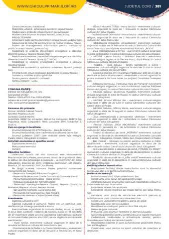 WWW.GHIDULPRIMARIILOR.RO JUDE%u021aUL GORJ / 381Construire muzeu tradi%u021bionalMobilitate urban%u0103%u2013 amenajare parc%u0103ri %u00een ora%u0219ul NovaciModernizare str%u0103zi de interes local %u00een orasul NovaciModernizare drumuri %u00een ora%u0219ul Novaci, jude%u021bul GorjPROIECTE PNRRAmenajare piste pentru biciclete %u00een ora%u0219ul Novaci, jude%u021bul GorjAsigurarea de locuin%u021be%u00a0pentru tineri la nivelul Ora%u0219ului NovaciSistem de management informatizat pentru transportul public %u00een ora%u0219ul Novaci, jude%u021bul GorjReabilitare %u00een vederea eficientiz%u0103rii energetice a cl%u0103dirilor aferente Liceului Teoretic Novaci (C2)Reabilitare %u00een vederea cre%u0219terii eficien%u021bei energetice a cl%u0103dirilor aferente Liceului Teoretic Novaci ( C3 si C4)Reabilitare %u00een vederea eficientiz%u0103rii energetice a Liceului Teoretic NovaciReabilitare moderat%u0103%u00a0 a spitalului or%u0103%u0219enesc Novaci, jude%u021bul Gorj%u00cenfiin%u021barea de insule ecologice digitalizate %u00een ora%u0219ul NovaciDotare cu mobilier %u0219coli %u0219i gr%u0103dini%u021beCentru pentru v%u00e2rstnici %u2013 Hirisesti Centru integrat - LiceuCOMUNA PADE%u015eAdres%u0103: Sat C%u0103lug%u0103reni, Nr. 124Cod po%u0219tal: 217327Telefon: 0253-471101; Fax: 0253-471298; Adresa de e-mail: primariapades@yahoo.comURL: www.primariapades.roPersoane din primarie:Primar: Mih%u0103i%u021b%u0103 Gabriel Troac%u0103Secretar:Popescu AurelContabil: Ciorb%u0103 MarinaSuprafa%u021ba:%u00a038981 ha; Intravilan:%u00a0582,40 ha; Extravilan:%u00a038397,8 ha; Popula%u021bia:%u00a0 4632; Gospod%u0103rii:%u00a0 1900; Locuin%u021be:%u00a0 2197; Gr%u0103dini%u021be:%u00a0 3; %u0218coli:%u00a04; Cum se ajunge in localitate:Drumul Na%u021bional DN 67D T%u00e2rgu Jiu %u2013 Baia de Aram%u0103Drumul Na%u021bional 66, care traverseaz%u0103 localitatea Cerna Sat Drumul jude%u021bean DJ671 care str%u0103bate satele Apa Neagr%u0103, Pade%u0219, V%u0103ieni, C%u0103lug%u0103reni %u0219i Clo%u0219aniActivitati economice si specifice zonei:Exploatarea lemnuluiPrelucrarea lemnului Comer%u021bObiective turistice:Obiectivul turistic cel mai cunoscut este Monumentul Proclama%u021biei de la Pade%u0219, monument istoric de importan%u021b%u0103 clasa B, al%u0103turi de situl arheologic %u0219i a%u0219ezarea ,, La mormin%u021bi%u201d din satul C%u0103lug%u0103reni, Biserica de lemn ,,%u00cen%u0103l%u021barea Domnului%u201d, sat Clo%u0219ani, Biserica ,,Sf. Atanasie %u0219i Chiril%u201d, sat Pade%u0219.Pe l%u00e2ng%u0103 acestea, comuna Pade%u0219 prezint%u0103 numeroase monumente ale naturii:- Rezerva%u021bia forestier%u0103 P%u0103durea Gorganu- Rezerva%u021biile de munte Cheile Corcoaia %u0219i Ciucevele Cernii- Parcul Na%u021bional Domogled %u2013 Valea Cernei- Re%u021beaua ecologic%u0103 SIT NATURA 2000- Rezerva%u021bii speologice:Pe%u0219tera Clo%u0219ani, Pe%u0219tera Cioaca cu Brebenei, Pe%u0219tera Lazului, Pe%u0219tera Martei- Sat vacan%u021b%u0103 Complex Lucia Cerna Sat- Pensiunea C%u00e2mpia Soarelui%u2013Apa Neagr%u0103 - Pensiunea Heaven %u2013Clo%u0219ani (Valea Mare)Evenimente:Agenda cultural%u0103 a UATAgenda cultural%u0103 a comunei Pade%u0219 are un con%u021binut vast, desf%u0103%u0219urat pe %u00eentreaga perioad%u0103 a anuluiEvenimentele organizate %u00een comuna Pade%u0219, anual, %u00een spe%u021b%u0103, %u00een anul 2021, conform Hot%u0103r%u00e2rii de Consiliu Local nr. 13 din data de 27 noiembrie 2020, privind aporbarea Calendarului Cultural al comunei Pade%u0219 pentru anul 2021, se vor organiza urm%u0103toarele evenimente :-%u00a0 Hora Ionilor, eveniment cultural organizat %u00een data de 6 ianuarie la C%u0103minul cultural din satul Motru Sec-%u00a0Proclama%u021bia de la Pade%u0219 a lui Tudor Vladimirescu, eveniment cultural organizat %u00een data de 23 ianuarie a fiec%u0103rui an, %u00een satul Pade%u0219-%u00a0Sf%u00e2ntul Mucenic Trifon %u2013 Hora Satului %u2013 eveniment culturalreligios, organizat la data de 1 februarie %u00een cadrul C%u0103minului cultural din satul Clo%u0219ani-%u00a0%u00cent%u00e2mpinarea Domnului %u2013 Hora Satului %u2013 eveniment culturalreligios, organizat %u00een data de 2 februarie %u00een cadrul C%u0103minului cultural din satul Motru Sec-%u00a0 S%u0103rb%u0103toarea Dragostei %u201eDragobetele%u201d eveniment cultural, organizat %u00een data de 24 februarie %u00een cadrul C%u0103minului Cultural din satul Clo%u0219ani cu participarea Ansamblului Folcloric %u201eROUA%u201d-%u00a0Ziua Interna%u021bional%u0103 a femeii %u2013 eveniment cultural organizat %u00een data de 8 martie %u00een cadrul C%u0103minului cultural din satul Clo%u0219ani-%u00a0 NEDEIE %u2013 Hora Satului %u2013 S%u0103rb%u0103tori Pascale %u2013 eveniment cultural-religios organizat %u00een fiecare mar%u021bi, dup%u0103 Pa%u0219te, %u00een cadrul C%u0103minului cultural din satul Clo%u0219ani-%u00a0 NEDEIE %u2013 Hora Satului %u2013 Sfin%u021bii Constantin %u0219i Elena %u2013 eveniment cultural-religios organizat %u00een data de 21 mai %u00een cadrul C%u0103minului cultural din satul Pade%u0219-%u00a0Evocarea istoric%u0103 %u201eImn %u00een c%u00e2mpia Pade%u0219ului%u201d 200 de ani de la revolu%u021bia lui Tudor Vladimirescu %u2013 eveniment cultural organizat %u00een prima duminic%u0103 din luna iunie cu sprijinul Consiliului Jude%u021bean Gorj-%u00a0%u00cen%u0103l%u021barea Domnului %u201eFestivalul Hora de Poman%u0103%u201d eveniment cultural-religios organizat cu ocazia s%u0103rb%u0103torii cre%u0219tine %u00cen%u0103l%u021barea Domnului (Ispas), %u00een cadrul C%u0103minului cultural din satul Clo%u0219ani-%u00a0 NEDEIE Satului%u2013 Duminica Rusalilor, eveniment culturalreligios organizat %u00een data de Rusalii %u00een cadrul C%u0103minului cultural din satul C%u0103lug%u0103reni-%u00a0 NEDEIE Satului Sf%u00e2ntul Ilie %u2013 eveniment cultural-religios organizat %u00een data de 20 iulie %u00een cadrul C%u0103minelor culturale din satele V%u0103ieni %u0219i Pade%