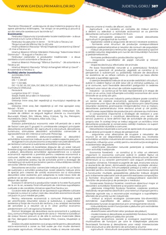 WWW.GHIDULPRIMARIILOR.RO JUDE%u021aUL GORJ / 387%u201cRom%u00e2nia Pitoreasc%u0103%u201d, unde spune c%u0103 zeul %u00eendemna poporul s%u0103-%u015fi apere p%u0103m%u00e2ntul str%u0103mo%u015fesc, %u201ciar stropii ce se preling %u015fi picur%u0103 %u015fi azi din steiurile acestea sunt lacrimile lui%u201d.Evenimente:Festivalul C%u0103p%u0219unului %u0219i produselor locale tradi%u021bionale %u2013 a doua duminic%u0103%u00a0a luni iunie a fiecarui anFestivalul Sculpturilor %u00een lemn%u00a0 %u00a0- 10-19 iulie a fiecarui anT%u00e2rgul anual de Sf%u00e2ntul Ilie 14-20 iulieHramul Bisericii Racovi%u0163a %u201cSfin%u0163ii %u00cemp%u0103ra%u0163ii Constantin %u015fi Elena%u201d - 21 mai a fiecarui anHramul Bisericii Sfintei M%u0103n%u0103stiri Polovragi %u201cAdormirea Maicii Domnului%u201d - 15 august a fiec%u0103rui anFestivalul castanelor si produselor traditionale %u2013 a doua sambata a lunii octombrie a fiecarui anHramul Bisericii Polovragi %u201cSf%u00e2ntul Dumitru%u201d - 26 octombrie a fiec%u0103rui anHramul Bisericii Racovi%u0163a %u201cSfin%u0163ii Arhangheli Mihail %u015fi Gavril%u201d - 8 noiembrie a fiec%u0103rui aFacilit%u00e3%u0163i oferite investitorilor:ACCESIBILITATE:Rutier%u0103:DN = 1; DN 67.DJ = 1; DJ 665.DC = 5; DC 22, DC 22A, DC 22B, DC 22C, DC 22D, DC (spre Pasul Curmatura Olte%u021bului).Feroviar%u0103:Lungime linie CF = 0 kmSta%u0163ie /halt%u0103 /anul d%u0103rii %u00een folosin%u0163%u0103: -Aerian%u0103: 0 KmDistan%u0163a %u00eentre ora%u015f /sat re%u015fedin%u0163%u0103 %u015fi municipiul re%u015fedin%u0163a de jude%u0163: 53 kmDistan%u0163a %u00eentre ora%u015f /sat re%u015fedin%u0163%u0103 %u015fi cel mai apropiat ora%u015f: Novaci -%u00a015 kmConectare la sisteme de transport public interurban: DA. Cursele de c%u0103l%u0103tori ce asigur%u0103 leg%u0103turi directe cu municipiile: Bucure%u015fti, Pite%u015fti, Rm. V%u00e2lcea, Sibiu, Craiova, Tg. Jiu, Petro%u015fani, Hunedoara, Deva, Timi%u015foara, Alba Iulia, Cluj.Oportunit%u0103%u021bi: Evolu%u021bia poten%u021bialului economic este influen%u021bat%u0103 de o serie de factori care pot fi grupa%u021bi %u00een urm%u0103toarele categorii principale: dezvoltarea activit%u0103%u021bilor din agricultur%u0103 %u0219i silvicultur%u0103, dezvoltarea turismului, stimularea dezvolt%u0103rii activit%u0103%u021bilor comerciale %u0219i agrozootehnice din interiorul comunei Polovragi.%u00cen scopul elimin%u0103rii disfunctionalit%u0103%u021bilor %u0219i dezvolt%u0103rii activit%u0103%u021bilor economice trebuie avute %u00een vedere aspecte precum:Atragerea %u00een circuitul economic a resurselor naturale identificate pe teritoriul comunei %u0219i sus%u021binerea activit%u0103%u021bilor productive.Av%u00e2nd %u00een vedere c%u0103 localitatea dispune de un areal natural forestier %u0219i agricol, dezvoltarea activit%u0103%u021bilor de valorificare complex%u0103 a p%u0103durii, dezvoltarea activit%u0103%u021bilor agrozootehnice ca o solu%u021bie economic%u0103 reprezint%u0103 o premis%u0103 pentru cre%u0219terea economic%u0103 a comunei. Astfel, este necesar ca autorit%u0103%u021bile locale s%u0103 se implice activ %u00een sus%u021binerea acestui tip de activitate printr-o strategie de marketing %u0219i s%u0103 sus%u021bin%u0103 pe localnici pentru %u00eembun%u0103t%u0103%u021birea calit%u0103%u021bii serviciilor oferite investitorilor.Dezvoltarea serviciilor comerciale trebuie privit%u0103 ca un factor de sus%u021binere a activit%u0103%u021bii productive. Acest obiectiv trebuie atins %u00een special prin crearea de unit%u0103%u021bi economice noi %u0219i stimularea dezvolt%u0103rii celor existente, prin adaptarea la noile nevoi. Este de preferat s%u0103 se stimuleze ini%u021biativa particular%u0103 a investitorilor care dispun de capital.Evolu%u021bia %u00een dinamic%u0103 a produc%u021biilor totale la ha este fluctuant%u0103 de la an la an, aceasta fiind influen%u021bat%u0103 de m%u0103rimea suprafe%u021belor cultivate %u0219i de condi%u021biile climatice specifice fiec%u0103rui an.Ca atare este de preferat s%u0103 se sporeasc%u0103 suprafe%u021bele cultivate %u00een special cu soiuri %u0219i culturi care dau rezultate economice situate cel pu%u021bin %u00een jurul mediei pe jude%u021b.Pentru relansarea economic%u0103 a comunei Polovragi axat%u0103 pe valorificarea resurselor solului %u015fi subsolului, a capacit%u0103%u0163ilor existente %u015fi for%u0163ei de munc%u0103 din teritoriu, s-au analizat sectoarele de activitate %u015fi a rezultat c%u0103 %u015fi %u00een viitor profilul economic predominant va fi cel agricol %u015fi forestier.Potrivit Strategiei de dezvoltare socio-economic%u0103 a jude%u021bului Gorj, comuna Polovragi face parte din zona 2 %u2013 Montana sud al%u0103turi de ora%u0219ul Novaci precum %u0219i de alte 6 comune %u00eenvecinate (Baia de Fier, Benge%u0219ti-Ciocadia, Bumbe%u0219ti Pitic, Crasna, Mu%u0219ete%u0219ti %u0219i S%u0103celu).Analiza situa%u021biei existente ca %u0219i propunerile pentru dezvoltarea socio-economic%u0103 a zonei au fost axate pe mai multe domenii principale: agricultura, infrastructura, mediu %u0219i resurse naturale, resurse umane %u0219i mediu de afaceri, social.Agricultur%u0103 - va necesita un complex de m%u0103suri pentru a deveni cu adev%u0103rat o activitate economic%u0103 ce va permite dezvoltarea comunei %u00een urm%u0103torii 10-15 ani.Printre principalele propuneri care vizeaz%u0103 dezvoltarea agriculturii %u00een perspectiv%u0103 se num%u0103r%u0103:- exploata%u0163ii viabile %u015fi asigurarea de servicii necesare acestora;- formarea unor structuri de produc%u0163ie corespunz%u0103toare condi%u0163iilor pedoameliorative %u015fi nevoilor de consum ale popula%u0163iei;- m%u0103suri de protec%u0163ie a terenurilor agricole valoroase %u015fi sporire a calit%u0103%u0163ii solurilor degradate prin lucr%u0103ri de %u00eembun%u0103t%u0103%u0163iri funciare %u015fi pedoameliorative;- formarea profesional%u0103 a produc%u0103torilor agricoli;- revigorarea supr