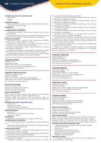 412 / JUDE%u021aUL HUNEDOARA WWW.GHIDULPRIMARIILOR.ROActivitati economice si specifice zonei:Agricultur%u0103Comer%u0163Turism%u00a0Obiective turistice:Biserica Sf%u00e2nta Parascheva din satul Merghe%u0219 din secolul XVIII V%u00e2rful Piatra Coziei cota 686Evenimente:Zilele comunei - 15 augustFacilit%u00e3%u0163i oferite investitorilor:Achizi%u0163ionarea legal%u0103 a unor terenuri situate %u00eentr-un cadru natural deosebitExisten%u0163a unei re%u0163ele de drumuri modernizate care fac leg%u0103turi facile cu Municipiul Deva - re%u015fedin%u0163a jude%u0163ului HunedoaraProiecte de investi%u0163ii:Modernizare drum comunal 125A, Alma%u0219u-Sec (DJ708eAarchia), comuna C%u00e2rji%u021bi, jude%u021bul HunedoaraReabilitarea, modernizarea %u0219i dotarea c%u0103minului cultural Alma%u0219u Sec, comuna C%u00e2rji%u021bi, jude%u021bul HunedoaraAchizi%u021bie echipamente IT pentru dotare prim%u0103rie %u00een comuna C%u00e2rji%u021bi, jude%u021bul HunedoaraRealizarea infrastructurii de ap%u0103%u00a0uzat%u0103%u00a0%u0219i canalizare %u00een satele Cozia, Almasu Sec %u0219i C%u00e2rjiti, comuna C%u00e2rji%u021bi, jude%u021bul Hunedoara Proiectul regional de dezvoltare a infrastructurii de ap%u0103 %u015fi ap%u0103 uzat%u0103 din jude%u0163ul Hunedoara. %u00een perioada 2014-2020COMUNA CERB%u0102LAdres%u0103: nr. 7ACod po%u0219tal: 337180Telefon: 0254-735403; Fax: 0254-268328; Adresa de e-mail: primariacerbal@yahoo.comURL: www.primariacerbal.roCOMUNA CERTEJU DE SUSAdres%u0103: Principal%u0103, nr. 236Cod po%u0219tal: 337190Telefon: 0254-648714, 648555; Fax: 0254-648720; Adresa de e-mail: primaria_certejudesus@yahoo.comURL: https://www.certejudesus.ro/Persoane din primarie:Primar : Luca AlexandruViceprimar: Ciobanu Florin CosminSecretar General: Bugi OvidiuContabil: Ivan Ramona IzabelaSate %u00een administra%u021bie:Certeju de Sus, Hondol, Boc%u015fa Mare, Boc%u015fa Mic%u0103, S%u0103c%u0103r%u00e2mb, Nojag, V%u0103rmaga, M%u0103gura-Topli%u0163a, Topli%u0163a-Mure%u015fuluiSuprafa%u021ba:%u00a0 8965 ha; Intravilan:%u00a0 189 ha; Extravilan:%u00a0 3241 ha; Popula%u021bia:%u00a0 3034; Gospod%u0103rii:%u00a0 1577; Locuin%u021be:%u00a0 2400; Gr%u0103dini%u021be:%u00a0 6; %u0218coli:%u00a07; Activitati economice si specifice zonei:Agricultur%u0103Cre%u015fterea animalelorColectarea fructelor de p%u0103dureExploatarea minereurilor auro-argentifere %u015fi neferoaseObiective turistice:AgroturismPensiune %u00een satul S%u0103c%u0103r%u00e2mb %u015fi V%u0103rmagaCaban%u0103 Lac F%u0103eragEvenimente:Zilele comunei la %u00eenceputul lunii august a fiec%u0103rui anFacilit%u00e3%u0163i oferite investitorilor:OG 241/1998, spa%u0163ii %u015fi terenuri adiacente drumului jude%u0163ean DJ 761Distan%u0163a de 18 km fa%u0163%u0103 de Municipiul Deva, re%u015fedin%u0163a de jude%u0163Scutiri taxe %u015fi impozite localeProiecte de investi%u0163ii:Alimentare cu ap%u0103 %u00een localitatea Topli%u021ba Mure%u0219ului, comuna Certeju de Sus, jude%u021bul HunedoaraAlimentare cu ap%u0103 %u00een localit%u0103%u021bile M%u0103gura-Topli%u021ba %u0219i S%u0103c%u0103r%u00e2mb, comuna Certeju de Sus, jude%u021bul HunedoaraSta%u021bie de epurare %u00een localitatea Certeju de Sus,comuna Certeju de Sus, jude%u021bul HunedoaraCanalizare menajer%u0103 %u00een localit%u0103%u021bile Boc%u0219a Mic%u0103 %u0219i Hondol, comuna Certeju de Sus,jude%u021bul HunedoaraCanalizare menajer%u0103 %u00een localitatea Topli%u021ba Mure%u0219ului, comuna Certeju de Sus, jude%u021bul HunedoaraCanalizare menajer%u0103 %u00een localitatea M%u0103gura-Topli%u021ba, comuna Certeju de Sus, jude%u021bul HunedoaraCanalizare menajer%u0103 %u00een localitatea S%u0103c%u0103r%u00e2mb, comuna Certeju de Sus, jude%u021bul HunedoaraCanalizare menajer%u0103 %u00een localitatea Nojag, comuna Certeju de Sus, jude%u021bul HunedoaraCanalizare menajer%u0103 %u00een localitatea V%u0103rmaga, comuna Certeju de Sus, jude%u021bul Hunedoara%u00cenfiin%u021bare re%u021bea distribu%u021bie %u0219i racorduri gaze naturale %u00een comuna Certeju de Sus, jude%u021bul HunedoaraAchizi%u021bionarea de vehicule nepoluante-microbuze electrice, parteneriat co ora%u0219ul Simeria, comuna B%u0103cia, comuna H%u0103r%u0103u, comuna Certeju de Sus, comuna %u0218oimu%u0219, comuna Pe%u0219ti%u0219u Mic, comuna C%u00eerji%u021bi %u0219i comuna Cerb%u0103lProiectul regional de dezvoltare a infrastructurii de ap%u0103 %u0219i ap%u0103 uzat%u0103 din jude%u021bul Hunedoara Dotarea cu mobilier, materiale didactice %u0219i echipamente digitalea unit%u0103%u021bilor de %u00eenv%u0103%u021b%u0103m%u00e2nt preuniversitar %u0219i a unit%u0103%u021bilor conexe-componenta C15 educa%u021bieCOMUNA CR%u00c2%u015eCIORAdres%u0103: Plopilor, nr. 6Cod po%u0219tal: 337200Telefon: 0254-616367; Fax: 0254-616366; Adresa de e-mail: prim.criscior@yahoo.comURL: www.primariacriscior.roCOMUNA DENSU%u0218Adres%u0103: Principal%u0103, nr. 154Cod po%u0219tal: 337205Telefon: 0254-775010; Fax: 0254-775010; Adresa de e-mail: comunadensus@gmail.comprimariadensus@yahoo.comURL: www.primariadensus.roMUNICIPIUL DEVAAdres%u0103: P-%u0163a Unirii, nr. 4Cod po%u0219tal: 330152Telefon: 0254-213435, 218325, 232310; Fax: 0254-226176; Adresa de e-mail: primar@primariadeva.roURL: www.primariadeva.roCOMUNA DOBRAAdres%u0103: P-%u0163a Victorie, nr. 1Cod po%u0219tal: 337215Telefon: 0254-283241, 283301; Fax: 0254-283101; Adresa de e-mail: primariadobra@yahoo.comURL: https://www.dobrahd.ro/Persoane din primarie:Primar:%u00a0Ovidiu Iosif P%u0103durean%u00a0Viceprimar: Dalia Col%u0163atuSecretar General: Violeta V%u00e2natoru VioletaContabil:%u00a0Loredana-Ramona Ini%u0219ca%u00a0Sate %u00een administra%u021bie:Dobra, Abucea, Bujoru, F%u0103ge%u0163el, L%u0103pu%u015fnic, Mih%u0103ie%u015fti, Panc, PancS%u0103li%u015fte, R%u0103dule%u015fti, Roc%u015fani, St%u00e2nce%u015fti, St%u00e2nce%u015fti-Ohaba, StreteaSuprafa%u021ba:%u00a0 13816 ha; Intravilan:%u00a0 517 ha; Extravilan:%u00a0 13299 ha; Popula%u021bia:%u00a03581; Gospod%