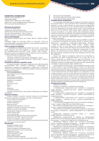 WWW.GHIDULPRIMARIILOR.RO JUDE%u021aUL HUNEDOARA / 415MUNICIPIUL HUNEDOARAAdres%u0103: B-dul Libert%u0103%u0163ii, nr. 17Cod po%u0219tal: 331128Telefon: 0254-716322; Fax: 0254-716087; Adresa de e-mail: info@primariahunedoara.roURL: www.primariahunedoara.roPersoane din primarie:Primar: Dan Bobou%u021banuViceprimar: Mircea Marcel PopaAdministrator Public: Ramona Elena TodorSecretar General: Militon - D%u0103nu%u021b Lasl%u0103uDirector%u00a0Economic: Ani%u0219oara Aurelia PopaSate %u00een administra%u021bie:Hunedoara, R%u0103c%u0103%u0219tie, Bo%u0219, Gro%u0219, Zla%u0219ti, Buituri, H%u0103%u0219dat, Pe%u0219ti%u0219u MareSuprafa%u021ba:%u00a0 9780 ha; Intravilan:%u00a0 1879 ha; Extravilan:%u00a0 7910 ha; Popula%u021bia:%u00a068387; Gospod%u0103rii:%u00a020000; Locuin%u021be:%u00a028000; Gr%u0103dini%u021be:%u00a013; %u0218coli:%u00a010; Licee:%u00a05; Universita%u021bi:%u00a01; Cum se ajunge in localitate:Localitatea este str%u0103b%u0103tut%u0103 de DJ 687: S%u00e2ntuhalm - Hunedoara, drum na%u021bional care face leg%u0103tura cu drumul European E68 care str%u0103bate %u021bara pe ruta Arad - Deva - Or%u0103%u0219tie - Sibiu - Bra%u0219ov - Bucure%u0219ti %u0219i drumuri jude%u021bene care fac leg%u0103tura %u00eentre Hunedoara %u0219i C%u0103lan, respectiv Hunedoara %u0219i Ha%u021beg.Acces A1 %u2013 18 km, acces la E15 %u2013 12 kmC%u0103i ferate: Coridorul IV: Bucure%u0219ti %u2013 Budapesta %u2013 Viena Aeroporturi interna%u021bionale: Timi%u0219oara %u2013 148 km, Sibiu %u2013 100 km, Cluj-Napoca %u2013 180 kmActivitati economice si specifice zonei:%u00cen ceea ce prive%u0219te municipiul Hunedoara, ramurile industriale reprezentative sunt: industria siderurgic%u0103, metalurgic%u0103 %u0219i automotive; industria de exploatare %u0219i prelucrare a lemnului; industria u%u0219oar%u0103 (textile, %u00eenc%u0103l%u021b%u0103minte, piel%u0103rie, covoare); industria alimentar%u0103; artizanatFirme reprezentative:Assa Abloy Entrance Systems ProductionMicro MegaDr%u00e4xlmaier HunedoaraArcelorMittal HunedoaraDedeman HunedoaraKauflandProfi Rom FoodPennyLidlCarrefourProduc%u0103tori locali: Asocia%u021bia produc%u0103torilor de produse tradi%u021bionale %u0219i ecologice HunedoaraObiective turistice:Muzeul Castelul Corvinilor (include Muzeul de Arheologie, Istorie %u0219i Etnografie Hunedoara %u0219i Muzeul Casa Breslelor)Centrul vechi al HunedoareiCentrul Pietonal CorvinGr%u0103dina zoologic%u0103Bazinul de %u00cenotComplexul de Agrement %u201eCorvina%u201dCl%u0103direa Prim%u0103riei municipiului HunedoaraBiserica cu hramul Sf. NicolaeCatedrala Sf. %u00cemp%u0103ra%u021bi Constantin %u0219i ElenaBiserica Reformat%u0103Turnul-clopotni%u021b%u0103Fortifica%u021bia de p%u0103m%u00e2nt de pe Dealul S%u00e2npetruExpozi%u021bia %u00een aer liber %u201eDrumul Corvinilor%u201dMuzeul Trenule%u021belor %u201eValentin Banciu%u201d Muzeul Comunismului (Expozi%u021bia Permanent%u0103 %u201ePa%u0219ii Rom%u00e2niei prin comunism %u0219i democra%u021bie%u201d)Evenimente:Noaptea Muzeelor (mai)Festivalul Luminii (mai)T%u00e2rgul European al Castelelor (mai)Cupa %u201eIoan Corvin%u201d la tir cu arcul (mai)Tangothica (iunie)Zilele Hunedoarei (iulie)Opera Nights (iulie)Festivalul Medieval (august)Stradivarius Music Nights by the Castle (iulie)Nunta de Aur (octombrie)Ziua Na%u021bional%u0103 a Rom%u00e2niei (1 Decembrie) E vremea colindelor (decembrie)Facilit%u00e3%u0163i oferite investitorilor:%u00cen ce prive%u0219te facilit%u0103%u021bile oferite mediului de afaceri, de%u021binem trei puncte forte: un parc industrial (Parc Industrial Hunedoara) deschis %u00een urm%u0103 cu dou%u0103 decenii, %u00een care sunt acum disponibile 6 parcele de teren, dar %u0219i un sit industrial (Centru de Afaceri) %u00een care sunt disponibile at%u00e2t spa%u021bii pentru birouri, c%u00e2t %u0219i parcele de teren pe 17,7 de hectare. Toate aceste spa%u021bii, respectiv parcele, se pot concesiona %u00een condi%u021bii extrem de avantajoase pentru solicitan%u021bi. Acestora li se adaug%u0103 o suprafa%u0163%u0103 de aproximativ 108 de hectare existent%u0103 pe fostul amplasament al vechiului combinat siderurgic, de asemenea, disponibil%u0103 pentru concesionare %u00een condi%u0163ii avantajoase.Parcul Industrial Hunedoara este situat pe DJ687, la intrarea %u00een municipiul Hunedoara, pe partea st%u00e2ng%u0103 %u00een direc%u021bia Deva %u2013 S%u00e2ntuhalm %u2013 Hunedoara, cu deschidere spre Ha%u021beg %u2013 Petro%u0219ani %u2013 T%u00e2rgu Jiu, respectiv Ha%u021beg %u2013 Re%u0219i%u021ba %u2013 C%u0103lan %u2013 Or%u0103%u0219tie %u2013 Sibiu. Accesul %u00een parc se face direct din drumul jude%u021bean DJ687: Hunedoara %u2013 Deva. Terenurile dispun de acord de mediu, studii geo %u0219i topo care pot fi puse la dispozi%u021bia investitorilor, %u00een mod gratuit. Ca infrastructur%u0103, acesta dispune de: energie electric%u0103, gaz, ap%u0103 potabil%u0103, canalizare, c%u0103i de acces, telefoane, Internet, sal%u0103 de conferin%u021be.Centrul de Afaceri Hunedoara (Structur%u0103 de Sprijinire a Afacerilor) are spa%u021bii repartizate pentru un num%u0103r de 27 de birouri, restaurant cu autoservire %u0219i o sal%u0103 de conferin%u021be cu o capacitate de 200 de locuri. Aceast%u0103 cl%u0103dire dispune de toate facilit%u0103%u021bile necesare: energie electric%u0103, gaze naturale, ap%u0103 potabil%u0103, canalizare, comunica%u021bii prin cablu, Internet etc. Vechea platform%u0103 industrial%u0103 %u2013 este amplasat%u0103 pe malul vestic al r%u00e2ului Cerna, %u00een zona ocupat%u0103 p%u00e2n%u0103 %u00een urm%u0103 cu 20 de ani de vechiul combinat siderurgic al Hunedoarei. Accesul se poate face at%u00e2t dinspre intrarea %u00een ora%u015f (de pe DJ 687 S%u00e2ntuhalm Hunedoara %u2013 drum rapid de 8 Km care face leg%u0103tura cu autostrada A 1) c%u00e2t %u015fi dinspre ora%u015ful %u00een sine, prin alte trei puncte. Punerea %u00een valoare a celor 108 de hectare se poate face prin parcelare; se va pune la dispo