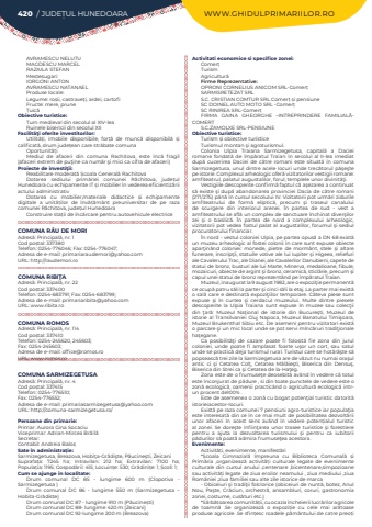 420 / JUDE%u021aUL HUNEDOARA WWW.GHIDULPRIMARIILOR.ROAVRAMESCU NELUTUMAGDESCU MARCELRAZAILA STEFANMe%u0219te%u0219ugari:IORGONI ANTONAVRAMESCU NATANAELProduse locale:Legume: ro%u0219ii, castrave%u021bi, ardei, cartofiFructe: mere, prune%u021auic%u0103Obiective turistice:Turn medieval din secolul al XIV-leaRuinele bisericii din secolul XIIFacilit%u00e3%u0163i oferite investitorilor:Utilit%u0103%u021bi, imobile disponibile, for%u021b%u0103%u00a0 de munc%u0103%u00a0 disponibil%u0103%u00a0 %u0219i calificat%u0103, drum jude%u021bean care str%u0103bate comunaOportunit%u0103%u021biMediul de afaceri din comuna Rachitova, este %u00eenc%u0103 fragil (afaceri extrem de pu%u0163ine ca num%u0103r %u015fi mici ca cifra de afaceri)Proiecte de investi%u0163ii:Reabilitare moderat%u0103%u00a0%u0218coala General%u0103%u00a0RachitovaDotarea sediului prim%u0103riei comunei R%u0103chitova, jude%u021bul Hunedoara cu echipamente IT %u0219i mobilier %u00een vederea eficientiz%u0103rii actului administrativDotarea cu mobilier,materiale didactice %u0219i echipamente digitale a unit%u0103%u021bilor de %u00eenv%u0103%u021b%u0103m%u00e2nt preuniversitar de pe raza comunei R%u0103chitova, jude%u021bul HunedoaraConstruire sta%u021bii de %u00eenc%u0103rcare pentru autovehicule electriceCOMUNA R%u00c2U DE MORIAdres%u0103: Principal%u0103, nr. 1Cod po%u0219tal: 337380Telefon: 0254-776046; Fax: 0254-776047; Adresa de e-mail: primariaraudemori@yahoo.comURL: http://raudemori.roCOMUNA RIBI%u0162AAdres%u0103: Principal%u0103, nr. 22Cod po%u0219tal: 337400Telefon: 0254-683791; Fax: 0254-683799; Adresa de e-mail: primariaribita@yahoo.comURL: www.ribita.roCOMUNA ROMOSAdres%u0103: Principal%u0103, nr. 114Cod po%u0219tal: 337410Telefon: 0254-245620, 245603; Fax: 0254-245603; Adresa de e-mail: office@romos.roURL: www.romos.roCOMUNA SARMIZEGETUSAAdres%u0103: Principal%u0103, nr. 4Cod po%u0219tal: 337415Telefon: 0254-776510; Fax: 0254-776552; Adresa de e-mail: primariasarmizegetusa@yahoo.comURL: http://comuna-sarmizegetusa.ro/Persoane din primarie:Primar: Aurora Gina SocaciuViceprimar: Adrian-Mircea Br%u0103il%u0103Secretar:%u00a0Contabil: Andreia Balo%u0219Sate %u00een administra%u021bie:Sarmizegetusa, Breazova, Hobi%u0163a-Gr%u0103di%u015fte, P%u0103ucine%u015fti, ZeicaniSuprafa%u021ba:%u00a0 7245 ha; Intravilan:%u00a0 212 ha; Extravilan:%u00a0 7100 ha; Popula%u021bia:%u00a01195; Gospod%u0103rii:%u00a0415; Locuin%u021be:%u00a0530; Gr%u0103dini%u021be:%u00a01; %u0218coli:%u00a01; Cum se ajunge in localitate:Drum comunal DC 85 - lungime 600 m (Clopotiva - Sarmizegetusa )Drum comunal DC 86 - lungime 550 m (Sarmizegetusa %u2013 Hobita-Gr%u0103diste)Drum comunal DC 87 - lungime 910 m (P%u0103ucine%u0219ti)Drum comunal DC 88- lungime 420 m (Zeicani) Drum comunal DC 92-lungime 200 m (Breazova)Activitati economice si specifice zonei:Comer%u021bTurismAgricultur%u0103Firme Reprezentative:OPRONI CORNELIUS ANICOM SRL-Comer%u021bSARMISRETEZAT SRLS.C. CRISTIAN COMTUR SRL Comer%u021b%u00a0%u0219i pensiuneSC DOINEL AUTO MOTO SRL -Comer%u021bSC RINIREA SRL-Comer%u021bFIRMA GAINA GHEORGHE %u2013INTREPRINDERE FAMILIAL%u0102COMER%u021aS.C.ZAMOLXE SRL-PENSIUNEObiective turistice:Turism %u0219i obiective turisticeTurismul montan %u015fi agroturismul.Colonia Ulpia Traiana Sarmizegetusa, capital%u0103 a Daciei romane fondat%u0103 de %u00eemp%u0103ratul Traian %u00een secolul al II-lea imediat dup%u0103 cucerirea Daciei de c%u0103tre romani este situat%u0103 %u00een comuna Sarmizegetusa, unul dintre acele locuri unde trec%u0103torul p%u0103%u015fe%u015fte pe istorie. Complexul arheologic ofer%u0103 vizitatorilor vestigii romane: amfiteatrul, palatul augustalilor, forul, templele unor divinit%u0103%u0163i.Vestigiile descoperite confirm%u0103 faptul c%u0103 a%u015fezarea a continuat s%u0103 existe %u015fi dup%u0103 abandonarea provinciei Dacia de c%u0103tre romani (271/275) p%u00e2n%u0103 %u00een cursul secolului IV. Vizitatorii pot urm%u0103ri zidurile amfiteatrului de form%u0103 eliptic%u0103, precum %u015fi traseul canalului de scurgere din interiorul arenei. %u00cen partea de sud - vest a amfiteatrului se afl%u0103 un complex de sanctuare %u00eenchinat diver%u015filor zei %u015fi o basilic%u0103. %u00cen partea de nord a complexului arheologic, vizitatorii pot vedea fostul palat al augustalilor, forumul %u015fi sediul procuratorului financiar.%u00cen nord - vestul coloniei Ulpia, pe partea opus%u0103 a DN 68 exist%u0103 un muzeu arheologic al fostei colonii %u00een care sunt expuse obiecte apar%u0163in%u00e2nd coloniei: monede, pietre de morm%u00e2nt, stele %u015fi altare funerare, inscrip%u0163ii, statuile votive ale lui Iupiter %u015fi Higeea, reliefuri ale Cavalerului Trac, ale Dianei, ale Cavalerilor Danubieni, capete de statui de bronz, busturi ale lui Marte, Minerva, medalioane, fibule, mozaicuri, obiecte de argint %u015fi bronz, ceramic%u0103, sticl%u0103rie, precum %u015fi capul unei statui de bronz reprezent%u00e2nd pe %u00eemp%u0103ratul Traian.Muzeul, inaugurat la 9 august 1982, are o expozi%u0163ie permanent%u0103 ce ocup%u0103 patru s%u0103li la parter %u015fi cinci s%u0103li la etaj. La parter mai exist%u0103 o sal%u0103 care e destinat%u0103 expozi%u0163iilor temporare. C%u00e2teva piese sunt expuse %u015fi %u00een curtea %u015fi cerdacul muzeului. Multe dintre piesele descoperite la Ulpia Traiana sunt expuse %u00een muzee sau colec%u0163ii din %u0163ar%u0103: Muzeul Na%u0163ional de istorie din Bucure%u015fti, Muzeul de istorie al Transilvaniei Cluj Napoca, Muzeul Banatului Timi%u015foara, Muzeul Brukenthal Sibiu etc. De asemeni pentru vizitatori exist%u0103 o parcare %u015fi un mic local unde se pot servi m%u00eenc%u0103ruri tradi%u0163ionale ha%u0163egane.Ca posibilit%u0103%u0163i de cazare poate fi folosit%u0103 fie zona din jurul coloniei, unde poate fi amplasat foarte u%u015for un cort, sau satul unde se practic%u0103 deja turismul rural. Turistul care se hot%u0103r%u0103%u015fte s%u0103 popseasc%u0103 trei zile la Sarmizegetusa are 