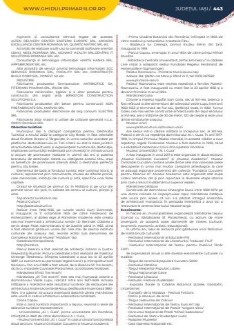 WWW.GHIDULPRIMARIILOR.RO JUDE%u021aUL IA%u0218I / 443Inginerie %u0219i consultan%u021b%u0103 tehnic%u0103 legate de acestea: ALTEN DELIVERY CENTER EASTERN EUROPE SRL, ARCADIS EXCELLENCE CENTER ROMANIA SA, QUARTZ MATRIX SRL%u00a0etc.Activit%u0103%u021bi de realizare a soft-ului la comand%u0103 (software orientat client): NESS ROM%u00c2NIA SRL, SIGNANT HEALTH SRL,CENTRIC IT SOLUTIONS ROMANIA SRL etc.Consultan%u0163%u0103 %u00een tehnologia informa%u0163iei: HARTE HANKS SRL, APPSBROKER SRL%u00a0etc.Alte activit%u0103%u021bi de servicii privind tehnologia informa%u021biei: SCC SERVICES ROMANIA SRL, FOCALITY SRL etc. CONSTRUC%u021aII: BUILD CORP SRL, CONEST SA etc.INDUSTRIE:Fabricarea produselor farmaceutice: ANTIBIOTICE SA, FITERMAN PHARMA SRL, IRCON SRL Fabricarea c%u0103r%u0103mizilor, %u021biglelor %u0219i a altor produse pentru construc%u021bii, din argil%u0103 ars%u0103: BRIKSTON CONSTRUCTION SOLUTIONS S.AFabricarea produselor din beton pentru construc%u021bii: ADN PREFABRICATE SRL, MARVIO SRLFabricarea produselor electronice de larg consum: ELECTRA SRLFabricarea altor ma%u0219ini %u0219i utilaje de utilizare general%u0103 n.c.a.: OMCO Rom%u00e2nia SRLObiective turistice:Municipiul Ia%u0219i a c%u00e2%u0219tigat competi%u021bia pentru Destina%u021bia Turistic%u0103 a Anului 2022 la categoria City Break, %u00een fa%u021ba celorlalte dou%u0103 finaliste: Bra%u0219ov %u0219i T%u00e2rgovi%u0219te, %u00een urma voturilor acordate pe platforma destinatiaanului.ro. Trei criterii au stat la baza juriz%u0103rii: atractivitatea obiectivelor %u015fi experien%u0163elor turistice din destina%u0163ie, implicarea comunit%u0103%u0163ii eviden%u0163iat%u0103 prin investi%u0163ii %u00een infrastructur%u0103 %u015fi ac%u0163iuni de promovare realizate %u00een ultimii doi ani %u015fi puterea brandului de destina%u0163ie. Odat%u0103 cu c%u00e2%u0219tigarea acestui titlu, Ia%u0219ul va beneficia de promovare intens%u0103 drept o destina%u021bie perfect%u0103 pentru city break.%u00a0Elementul de baz%u0103 al fondului turistic este turismul istoric %u015fi cultural, reprezentat prin monumente, muzee de diferite profile, case memoriale, institu%u0163ii de cultur%u0103 %u015fi art%u0103, specifice unei foste capitale.Ora%u015ful se situeaz%u0103 pe primul loc %u00een Moldova %u015fi pe unul din primele locuri din %u0163ar%u0103, %u00een calitate de centru al culturii, %u015ftiin%u0163ei %u015fi artei.Top atrac%u021bii turistice %u00een Ia%u0219iPalatul Culturiihttp://palatulculturii.roRidicat %u00eentre 1906-1925, pe ruinele vechii Cur%u021bi Domne%u0219ti, %u0219i inaugurat la 11 octombrie 1925 de c%u0103tre Ferdinand de Hohenzollern, al doilea rege al Rom%u00e2niei moderne, este crea%u021bia cea mai %u00eensemnat%u0103 a arhitectului rom%u00e2n I.D. Berindei. Cl%u0103direa a servit drept Palat Administrativ %u0219i de Justi%u021bie p%u00e2n%u0103 %u00een 1955, c%u00e2nd a fost destinat g%u0103zduirii unora din cele mai de seama institu%u021bii culturale ale ora%u0219ului Ia%u0219i, reunite ast%u0103zi sub denumirea de Complexul Na%u021bional Muzeal %u201cMoldova%u201d Ia%u0219i.Catedrala Mitropolitan%u0103http://mmb.roPlanul bisericii a fost realizat de arhitec%u0163ii Johann %u0219i Gustav Freywald %u015fi Bucher. Pictura catedralei a fost realizat%u0103 de maestrul Gheorge T%u0103tt%u0103rescu. Sfin%u0163irea Catedralei a avut loc la 23 aprilie 1887. La eveniment au participat regele Carol I %u015fi mitropolitul Iosif Naniescu. Din anul 1889 a fost adus%u0103, de la Biserica Sf. Trei Ierarhi, racla cu moa%u015ftele Cuvioasei Parascheva, ocrotitoarea Moldovei.M%u0103n%u0103stirea Sfin%u0163ii Trei IerarhiM%u0103n%u0103stirea %u201eSf. Trei Ierarhi%u201d este cea mai frumoas%u0103 ctitorie a domnitorului Vasile Lupu, ridicat%u0103 %u00eentre anii 1637-1639. Actuala %u00eenf%u0103%u0163i%u015fare a m%u0103n%u0103stirii este rezultatul lucr%u0103rilor de restaurare ale arhitectului Andre Lecomte de Nouy, desf%u0103%u0219urate %u00een perioada 1882-1904. S-a p%u0103strat structura exterioar%u0103 datorit%u0103 c%u0103reia m%u0103n%u0103stirea este unic%u0103 %u00een cadrul arhitecturii ecleziastice rom%u00e2ne%u0219ti.Colina CopouEste o zon%u0103 turistic%u0103 important%u0103 a Ia%u015fului, reunind o serie de obiective turistice reprezentative:-%u00a0Universitatea %u201eAl. I. Cuza%u201d, prima universitate din Rom%u00e2nia, %u00eenfiin%u0163at%u0103 %u00een 1860 de c%u0103tre domnitorul A. I. Cuza,-%u00a0Muzeul Universit%u0103%u021bii %u201eAl. I. Cuza%u201d %u00een cadrul c%u0103ruia func%u021bioneaz%u0103 dou%u0103 sec%u021biuni: Muzeul Civiliza%u021biei Cucuteni %u0219i Muzeul Academic-%u00a0Prima Gradin%u0103 Botanic%u0103 din Rom%u00e2nia, %u00eenfiin%u0163at%u0103 %u00een 1856 de c%u0103tre medicul %u015fi naturalistul Anastasie F%u0103tu,-%u00a0 Bojdeuca lui Creang%u0103, primul muzeu literar din %u0163ar%u0103, inaugurat %u00een 1918-%u00a0Parcul Copou, amenajat %u00een anul 1834 de c%u0103tre prin%u0163ul Mihail Sturdza-%u00a0Biblioteca Central%u0103 Universitar%u0103 %u201eMihai Eminescu%u201d %u00een cl%u0103direa care ini%u0163ial a ad%u0103postit sediul Funda%u0163iei Regelui Ferdinand de Hohenzollern-Sigmaringen.Palatul Roznovanu - Prim%u0103ria Municipiului Ia%u015fiAdresa: Bd. %u015etefan cel Mare %u015fi Sf%u00e2nt nr.11, tel: 0232.267582www.primaria-iasi.roPalatul Roznovanu este vechea re%u015fedin%u0163%u0103 a familiei RosettiRoznovanu. A fost inaugurat%u0103 cu mare fast la 23 aprilie 1832 %u015fi a devenit Prim%u0103rie %u00een anul 1894.M%u0103n%u0103stirea GoliaCtitorie a marelui logof%u0103t Ioan Golia, sec al XVI-lea, biserica a fost ref%u0103cut%u0103 la alte dimensiuni de voievodul Vasile Lupu %u00eentre anii 1650-1653 %u015fi terminat%u0103 de fiul s%u0103u, %u015etef%u0103ni%u0163%u0103 Vod%u0103, %u00een 1660. Turnul Goliei, cea mai veche construc%u021bie arhitectural%u0103 din Ia%u015ful secolului al XVI-lea, are o %u00een%u0103l%u0163ime de 30 de metri, 120 de trepte %u015fi es