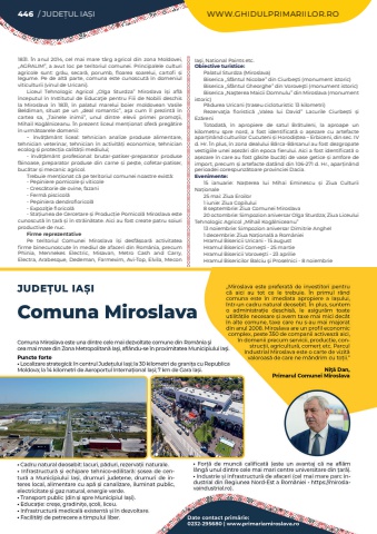 446 / JUDE%u021aUL IA%u0218I WWW.GHIDULPRIMARIILOR.RO1831. %u00cen anul 2014, cel mai mare t%u00e2rg agricol din zona Moldovei, %u201eAGRALIM%u201d, a avut loc pe teritoriul comunei. Principalele culturi agricole sunt: gr%u00e2u, secar%u0103, porumb, floarea soarelui, cartofi %u0219i legume. Pe de alt%u0103 parte, comuna este cunoscut%u0103 %u00een domeniul viticulturii (vinul de Uricani).Liceul Tehnologic Agricol %u201eOlga Sturdza%u201d Miroslava %u00ee%u0219i afl%u0103 %u00eenceputul %u00een Institutul de Educa%u0163ie pentru Fiii de Nobili deschis la Miroslava %u00een 1831, %u00een palatul marelui boier moldovean Vasile Beldiman, situat pe un %u201edeal romantic%u201d, a%u015fa cum %u00eel prezint%u0103 %u00een cartea sa, %u201eTainele inimii%u201d, unul dintre elevii primei promo%u0163ii, Mihail Kog%u0103lniceanu. %u00cen prezent liceul men%u021bionat ofer%u0103 preg%u0103tire %u00een urm%u0103toarele domenii:- %u00eenv%u0103%u021b%u0103m%u00e2nt liceal: tehnician analize produse alimentare, tehnician veterinar, tehnician %u00een activit%u0103%u021bi economice, tehnician ecolog %u0219i protec%u021bia calit%u0103%u021bii mediului;- %u00eenv%u0103%u021b%u0103m%u00e2nt profesional: brutar-patiser-preparator produse f%u0103inoase, preparator produse din carne %u0219i pe%u0219te, cofetar-patiser, buc%u0103tar %u0219i mecanic agricol.Trebuie men%u021bionat c%u0103 pe teritoriul comunei noastre exist%u0103:- Pepiniere pomicole %u015fi viticole- Cresc%u0103torie de ovine, fazani- Ferm%u0103 piscicol%u0103- Pepiniera dendrofloricol%u0103- Expozi%u0163ie floricol%u0103- Sta%u021biunea de Cercetare %u0219i Produc%u021bie Pomicol%u0103 Miroslava este cunoscut%u0103 %u00een %u021bar%u0103 %u0219i %u00een str%u0103in%u0103tate. Aici au fost create patru soiuri productive de nuc.Firme reprezentative Pe teritoriul Comunei Miroslava %u00ee%u0219i desf%u0103%u0219oar%u0103 activitatea firme binecunoscute %u00een mediul de afaceri din Rom%u00e2nia, precum Phinia, Mennekes Electric, Misavan, Metro Cash and Carry, Electra, Arabesque, Dedeman, Farmexim, Avi-Top, Elvila, Mecon Ia%u015fi, National Paints etc.Obiective turistice:Palatul Sturdza (Miroslava)Biserica %u201eSf%u00e2ntul Nicolae%u201d din Ciurbe%u015fti (monument istoric)Biserica %u201eSf%u00e2ntul Gheorghe%u201d din Vorove%u015fti (monument istoric)Biserica %u201eNa%u015fterea Maicii Domnulu%u201d din Miroslava (monument istoric)P%u0103durea Uricani (traseu cicloturistic 13 kilometri)Rezerva%u0163ia floristic%u0103 %u201eValea lui David%u201d Lacurile Ciurbe%u0219ti %u0219i Ez%u0103reni Totodat%u0103, %u00een apropiere de satul Br%u0103tuleni, la aproape un kilometru spre nord, a fost identificat%u0103 o a%u0219ezare cu artefacte apar%u021bin%u00e2nd culturilor Cucuteni %u0219i Horodi%u0219tea %u2013 Erbiceni, din sec. IV d. Hr. %u00cen plus, %u00een zona dealului B%u00e2rca-B%u00e2rsanul au fost dezgropate vestigiile unei a%u0219ez%u0103ri din epoca fierului. Aici a fost identificat%u0103 o a%u0219ezare %u00een care au fost g%u0103site buc%u0103%u021bi de vase getice %u0219i amfore de import, precum %u0219i artefacte dat%u00e2nd din 106-271 d. Hr., apar%u021bin%u00e2nd perioadei corespunz%u0103toare provinciei Dacia.Evenimente:15 ianuarie: Na%u0219terea lui Mihai Eminescu %u0219i Ziua Culturii Na%u021bionale25 mai: Ziua Eroilor1 iunie: Ziua Copilului8 septembrie: Ziua Comunei Miroslava20 octombrie: Simpozion aniversar Olga Sturdza; Ziua Liceului Tehnologic Agricol %u201eMihail Kog%u0103lniceanu%u201d13 noiembrie: Simpozion aniversar Dimitrie Anghel1 decembrie: Ziua Na%u021bional%u0103 a Rom%u00e2nieiHramul Bisericii Uricani - 15 augustHramul Bisericii Corne%u015fti - 25 martieHramul Bisericii Vorove%u015fti - 23 aprilieHramul Bisericilor Balciu %u015fi Proselnici - 8 noiembrie