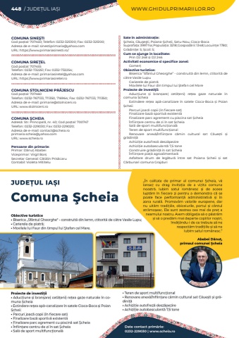 448 / JUDE%u021aUL IA%u0218I WWW.GHIDULPRIMARIILOR.ROCOMUNA SINE%u015eTICod po%u0219tal: 707450; Telefon: 0232-325100; Fax: 0232-325100; Adresa de e-mail: sinestiprimaria@yahoo.comURL: https://www.primariasinesti.ro/COMUNA SIRE%u0162ELCod po%u0219tal: 707455Telefon: 0232-732251; Fax: 0232-732254; Adresa de e-mail: primariasiretel@yahoo.comURL: https://www.primariasiretel.roCOMUNA STOLNICENI PR%u0102JESCUCod po%u0219tal: 707460Telefon: 0232-767133, 711350, 716964; Fax: 0232-767133, 711350; Adresa de e-mail: primarie@stolniceni.roURL: www.stolniceni.roCOMUNA %u015eCHEIAAdres%u0103: Str. Principal%u0103, nr. 40; Cod po%u0219tal: 700747Telefon: 0232-229030; Fax: 0232-229020; Adresa de e-mail: contact@scheia.roprimaria.scheia@yahoo.comURL: www.scheia.roPersoane din primarie:Primar: D%u0103nu%u021b AbabeiViceprimar:%u00a0Virgil Bor%u0219Secretar General: C%u0103t%u0103lin Pris%u0103caruContabil: Violeta MititeluSate %u00een administra%u021bie:%u015echeia, C%u0103u%u015fe%u015fti, Poiana-%u015echeii, Satu-Nou, Cioca-BocaSuprafa%u021ba:%u00a03997 ha; Popula%u021bia:%u00a03218; Gospod%u0103rii:%u00a01348; Locuin%u021be:%u00a01780; Gr%u0103dini%u021be:%u00a05; %u0218coli:%u00a05; Cum se ajunge in localitate:Prin DJ 248 %u0219i DJ 246Activitati economice si specifice zonei:Comer%u021bObiective turistice:Biserica %u201cSf%u00e2ntul Gheorghe%u201d - construit%u0103 din lemn, ctitorit%u0103 de c%u0103tre Vasile LupuCarierele de piatr%u0103Movilele lui Faur din timpul lui %u015etefan cel MareProiecte de investi%u0163ii:Aduc%u021biune %u0219i bran%u0219are( cet%u0103%u021beni) re%u021bea gaze naturale %u00een comuna %u0218cheiaExtindere re%u021bea ap%u0103-canalizare %u00een satele Cioca-Boca %u0219i Poian %u0218cheiiParcuri joac%u0103 copii (%u00een fiecare sat)Finalizare baz%u0103 sportiv%u0103 existent%u0103Finalizare parc agrement cu piscina sat %u0218cheia%u00cenfiin%u021bare centru de zi %u00een sat %u0218cheiaSal%u0103%u00a0de sport multifunc%u021bional%u0103Teren de sport multifunc%u021bionalRenovare anex%u0103/%u00eenfiin%u021bare c%u0103min cultural sat C%u0103ue%u0219ti %u0219i gr%u0103dini%u021b%u0103Achizi%u021bie autofrez%u0103%u00a0desz%u0103pezireAchizi%u021bie autobasculant%u0103%u00a07,5 toneConstruire gr%u0103dini%u021b%u0103%u00a0%u00een sat %u0218cheia%u00cenfiin%u021bare pia%u021b%u0103 agroalimentar%u0103Asfaltare drum de leg%u0103tur%u0103 %u00eentre sat Poiana %u0218cheii %u0219i sat C%u0103rbunari comuna Grajduri