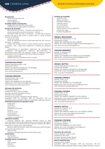 456 / JUDE%u021aUL ILFOV WWW.GHIDULPRIMARIILOR.ROEvenimente:Zilele comunei Afuma%u0163iZiua CopiluluiZiua %u00cenv%u0103%u0163%u0103toruluiFacilit%u00e3%u0163i oferite investitorilor:Taxele cele mai mici din jude%u0163ul IlfovUtilit%u0103%u0163i precum: ap%u0103, gaze %u015fi canalizareProiecte de investi%u0163ii:Sens giratoriu la moar%u0103 %u2013 ministerul transporturilorCentura par%u021bial%u0103 a comunei Afuma%u021bi l= 4,39 kmExtindere re%u021bea de ap%u0103 %u0219i canalizare %u2013 master planul pentru sectorul de ap%u0103 %u0219i ap%u0103 uzat%u0103 %u00een jude%u021bul Ilfov, %u00een dou%u0103 localit%u0103%u021bi Afuma%u021bi %u0219i G%u0103neasaConstruire cre%u0219%u0103Sta%u021bii de re%u00eenc%u0103rcare pentru vehiculele electrice din comuna Afuma%u021bi %u2013 4 instala%u021biiSistem ITS integrat Smart & Green Mobility pentru regiunea Bucure%u0219ti %u2013 Ilfov %u2013 informarea c%u0103l%u0103torilor %u00een sta%u021biile de transport publicModernizarea %u0219i extinderea sistemului de semaforizare inteligent%u0103 (managementul traficului Bucure%u0219ti-Ilfov) %u0219i prioritizarea vehiculelor de transport public %u00een vederea cre%u0219terii siguran%u021bei rutiere, fluidiz%u0103rii traficului %u0219i reducerii polu%u0103riiCadastru sistematic Modernizare %u0219i consolidare c%u0103min culturalCOMUNA BALOTE%u015eTIAdres%u0103: Calea Bucure%u015fti, nr. 89Cod po%u0219tal: 077017Telefon: 021-3511093, 3511092; Fax: 021-3521885; Adresa de e-mail: sediu@pblt.roURL: primariabalotesti.roCOMUNA BERCENIAdres%u0103: B-dul 1 Mai, nr. 233Cod po%u0219tal: 077020Telefon: 021-3651968; Fax: 021-3612703; Adresa de e-mail: registratura@primariaberceni.roURL: http://www.primariaberceni.roPersoane din primarie:Primar:George EneViceprimar:Costin Adrian Dr%u0103ganSecretar General:Gheorghe Haiducu%u00a0Contabil: Pop GeorgianaAdministrator public: Sebastian Daniel Geant%u0103Suprafa%u021ba:%u00a0 2733 ha; Intravilan:%u00a0 982 ha; Extravilan:%u00a0 1751 ha; Popula%u021bia:%u00a09200; Gospod%u0103rii:%u00a07270; Locuin%u021be:%u00a09189; Gr%u0103dini%u021be:%u00a06; %u0218coli:%u00a03; Activitati economice si specifice zonei:Construc%u021biiImobiliareAgricultur%u0103Cre%u0219terea animalelorComer%u021b Produse locale:CarmangerieProduse agricoleComer%u021b%u00a0cu am%u0103nuntul Obiective turistice:Singurul obiectiv din comuna Berceni inclus %u00een lista monumentelor istorice din judetul Ilfov ca monument de interes local este fosta curte boiereasc%u0103 de la Berceni, dat%u00e2nd din 1882 %u0219i cuprinz%u00e2nd ruinele unor case boiere%u015fti.Biserica ,,Sf%u00e2ntul Nicolae%u201d, acest ansamblu este clasificat drept monument de arhitectur%u0103 Oportunit%u0103%u021bi:Distan%u021ba apropiat%u0103%u00a0fa%u021b%u0103 de Municipiul Bucure%u0219tiEvenimente:Ziua EroilorT%u00e2rg de Cr%u0103ciunFacilit%u00e3%u0163i oferite investitorilor:GazeAp%u0103 curent%u0103InternetSalubritateProiecte de investi%u0163ii:Asfaltare str%u0103ziRe%u021bea canalizareExtindere re%u021bea ap%u0103Cas%u0103%u00a0de cultur%u0103Locuri de joac%u0103Proiecte de viitor Metrou pentru comuna BerceniConstruire cre%u0219%u0103Construire gr%u0103dini%u021b%u0103ORA%u0218UL BRAGADIRUAdres%u0103: %u015eos. Alexandriei, nr. 249Cod po%u0219tal: 077025Telefon: 021-4480795; Fax: 021-4480572; Adresa de e-mail: registratura@primariaorasbragadiru.roURL: www.primariaorasbragadiru.roCOMUNA BR%u0102NE%u015eTIAdres%u0103: I.C. Br%u0103tianu, 69Cod po%u0219tal: 077030Telefon: 021-3150983, 0371-304704; Fax: 021-3501258; Adresa de e-mail: primaria_branesti@yahoo.comURL: www.primaria-branesti.roORA%u0218UL BUFTEAAdres%u0103: Pia%u0163a Mihai Eminescu, Nr. 1Cod po%u0219tal: 070000Telefon: 031- 8241234, 8241231; Fax: 031-8241238; Adresa de e-mail: contact@primariabuftea.roURL: www.primariabuftea.roCOMUNA CERNICAAdres%u0103: Traian, nr.10Cod po%u0219tal: 077035Telefon: 021-3695308; Fax: 021-3695308; Adresa de e-mail: primaria_cernica@yahoo.comURL: http://cernica.judetulilfov.eu/COMUNA CHIAJNAAdres%u0103: P%u0103cii, nr. 75Cod po%u0219tal: 077040Telefon: 021-4361122, 4360067; Fax: 021-4361144; Adresa de e-mail: registratura@primariachiajna.rocontabilitate@primariachiajna.roURL: www.primariachiajna.roORA%u0218UL CHITILAAdres%u0103: Ion Olteanu, nr. 6Cod po%u0219tal: 077045Telefon: 021-4363709, 4363711; Fax: 021-4363710, 027915; Adresa de e-mail: primar@primariachitila.roURL: www.primariachitila.roCOMUNA CIOLPANIAdres%u0103: Str. %u015ecolii, Nr. 83Cod po%u0219tal: 077050Telefon: 021-2668045; Fax: 021-3715230; Adresa de e-mail: office@primariaciolpani.roURL: www.primariaciolpani.roPersoane din primarie:Primar:%u00a0Bogdan-Cristian%u00a0C%u0103lin%u00a0Viceprimar:%u00a0Ilie%u00a0Ioni%u021b%u0103%u00a0Secretar General: Andrei%u00a0StereaContabil: Alexandrina%u00a0DumitruSate %u00een administra%u021bie:Izvorani, piscu, LupariaSuprafa%u021ba:%u00a0 4187 ha; Intravilan:%u00a0 1872 ha; Extravilan:%u00a0 439 ha; Popula%u021bia:%u00a05239; Gospod%u0103rii:%u00a02303; Locuin%u021be:%u00a02585; Gr%u0103dini%u021be:%u00a04; %u0218coli:%u00a01;