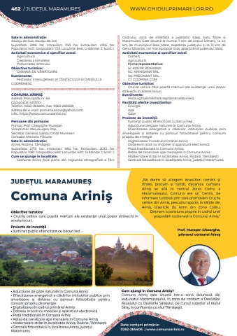462 / JUDE%u021aUL MARAMURE%u0218 WWW.GHIDULPRIMARIILOR.ROSate %u00een administra%u021bie:Asuaju de Sus, Asuaju de JosSuprafa%u021ba:%u00a0 5918 ha; Intravilan:%u00a0 1153 ha; Extravilan:%u00a0 4765 ha; Popula%u021bia:%u00a01401; Gospod%u0103rii:%u00a0723; Locuin%u021be:%u00a0846; Gr%u0103dini%u021be:%u00a02; %u0218coli:%u00a01; Activitati economice si specifice zonei:Agricultur%u0103Cre%u0219terea animalelorPrelucrarea lemnuluiObiective turistice:CABAN%u0102 DE V%u00c2N%u0102TOAREEvenimente:Festivalul interjude%u021bean al C%u00c2NTECULUI %u0218I DANSULUI CODRENESCCOMUNA ARINI%u015eAdres%u0103: Principal%u0103, nr. 65Cod po%u0219tal: 437010Telefon: 0262-265604; Fax: 0262-265658; Adresa de e-mail: primaria.arinis@yahoo.comURL: https://www.comunaarinis.ro/Persoane din primarie:Primar: Prof. Gheorghe Mure%u015fanViceprimar: Nelu Eugen PopSecretar General: Sandu Ghi%u021b%u0103 MunteanContabil: Mariana P%u0103curarSate %u00een administra%u021bie:Arini%u015f, Rodina, T%u0103m%u0103%u015fe%u015ftiSuprafa%u021ba:%u00a0 2713 ha; Intravilan:%u00a0 680 ha; Extravilan:%u00a0 2033 ha; Popula%u021bia:%u00a01081; Gospod%u0103rii:%u00a0650; Locuin%u021be:%u00a0620; Gr%u0103dini%u021be:%u00a01; %u0218coli:%u00a01; Cum se ajunge in localitate:Comuna Arini%u0219 face parte din regiunea etnografic%u0103 a %u021a%u0103rii Codrului, zon%u0103 de interfa%u021b%u0103 a jude%u021belor S%u0103laj, Satu Mare %u0219i Maramure%u0219. Este situat%u0103 la numai 7 km de ora%u0219ul Ulmeni, la 44 km de municipiul Baia Mare, re%u015fedin%u0163a jude%u0163ului %u015fi la 13 km de Cehu-Silvaniei, cel mai apropiat ora%u015f, apar%u0163in%u00e2nd jude%u021bului S%u0103laj.Activitati economice si specifice zonei:Comer%u021bAgricultur%u0103Firme reprezentative:Sc KOEPP ROMANIASC. ARINI%u0218ANA SRL SC. PREGNANT SRLCT CODRINA COMObiective turistice:Crucile celtice care poart%u0103 m%u0103rturii ale existen%u0163ei unui popor str%u0103vechi %u00een aceste locuri.Evenimente:Pia%u021b%u0103 agroalimentar%u0103 sapt%u0103m%u00e2nal%u0103(vineri)Facilit%u00e3%u0163i oferite investitorilor:EnergieAp%u0103GazeProiecte de investi%u0163ii:Iluminat public efiencitizat cu becuri ledAduc%u021biune de gaze naturale %u00een Comuna Arini%u0219Efiecitizarea energetic%u0103 a cl%u0103dirilor intitu%u021biilor publice prin anvelopare %u0219i dotarea cu panouri fotovoltaice pentru%u00a0 consum propriu de energieDigitalizarea %u00een cadrul prim%u0103riei Arini%u0219Dotarea %u00een %u0219coli cu mobilier %u0219i aparatur%u0103 electronic%u0103Pia%u021b%u0103 tradi%u021bional%u0103 %u00een Comuna Arini%u0219Re%u021bea de canalizare ape menajere %u00een Comuna Arini%u0219Modernizare str%u0103zi %u00een localitatea Arini%u0219, Rodina ,T%u0103m%u0103%u0219e%u0219tiCentral%u0103 fotovoltaic%u0103 %u00een localitatea Arini%u0219, jude%u021bul Maramure%u0219