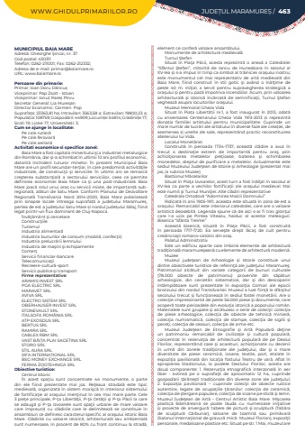 WWW.GHIDULPRIMARIILOR.RO JUDE%u021aUL MARAMURE%u0218 / 463MUNICIPIUL BAIA MAREAdres%u0103: Gheorghe %u015eincai, nr. 37Cod po%u0219tal: 430311Telefon: 0262-211001; Fax: 0262-212332; Adresa de e-mail: primar@baiamare.roURL: www.baiamare.roPersoane din primarie:Primar: Ioan Doru D%u0103ncu%u0219Viceprimar: Pap Zsolt - IstvanViceprimar: Ionu%u021b Rare%u0219 P%u00eervuSecretar General: Lia Mure%u0219anDirector Economic: Carmen%u00a0 PopSuprafa%u021ba:%u00a023363,81 ha; Intravilan:%u00a03563,58 a; Extravilan:%u00a019800,23 a; Popula%u021bia:%u00a0108759; Gospod%u0103rii:%u00a044909; Locuin%u021be:%u00a054814; Gr%u0103dini%u021be:%u00a017; %u0218coli:%u00a019; Licee:%u00a017; Universita%u021bi:%u00a03; Cum se ajunge in localitate:Pe cale rutier%u0103Pe cale feroviar%u0103Pe cale aerian%u0103Activitati economice si specifice zonei:Baia Mare a fost capitala mineritului %u015fi a industriei metalurgice din Rom%u00e2nia, dar %u015fi-a schimbat %u00een ultimii 10 ani profilul economic, datorit%u0103 %u00eenchiderii tuturor minelor. %u00cen prezent Municipiul Baia Mare are un profil secundar-ter%u0163iar, %u00een care predomin%u0103 activit%u0103%u0163ile industriale, de construc%u0163ii %u015fi serviciile. %u00cen ultimii ani se remarc%u0103 cre%u015fterea substan%u0163ial%u0103 a sectorului serviciilor, ceea ce permite definirea economiei Baia Mare ca %u015fi una post-industrial%u0103. Baia Mare joaca%u0306 rolul unui oras%u0326 cu servicii mixte, de important%u0326a%u0306 subregionala%u0306, ala%u0306turi de Satu Mare. Conform Planului de Dezvoltare Regionala%u0306 Transilvania Nord 2014-2020, Baia Mare polarizeaza%u0306prin sinapse locale %u00eentreaga suprafat%u0326a%u0306 a judet%u0326ului Maramures%u0326, partea de est a judet%u0326ului Satu Mare s%u0326i nordul judet%u0326ului Sa%u0306laj, fiind legat printr-un flux dominant de Cluj-Napoca.%u00cenv%u0103%u0163%u0103m%u00e2nt %u015fi cercetareConstruc%u0163iileTurismulIndustria alimentar%u0103Industria bunurilor de consum (mobil%u0103, confec%u0163ii)Industria prelucr%u0103rii lemnuluiIndustria de ma%u015fini %u015fi echipamenteComer%u0163Servicii%u00a0financiar-bancareTelecomunica%u0163iiRecreere-cultur%u0103-sportServicii publice %u015fi transportFirme reprezentative:ARAMIS INVEST SRLPGA ELECTRIC SRLMARAVET SRLAVIVA SRLELECTRO SISTEM SRLOBERHAUSER INVEST SRLSTONEVAULT SRLITALSOFA ROM%u00c2NIA SRLATP EXOSDUS SRLBERTUS SRL RAMIRA SRL CABLEX RBM SRLVAST B%u0102I%u021aA PLAI SACETINA SRLSTORO SRLSTIL AURA SRLSIFA INTERNATIONAL SRLBSG MONEY EXCHANGE SRL FERMA ZOOTEHNICA SRLObiective turistice:Centrul Istoric%u00cen acest spa%u0163iu sunt concentrate 44 monumente, o parte din ele fiind prezentate mai jos. Re%u0163eaua stradal%u0103 este tipic medieval%u0103, organizat%u0103 %u00een sistem mori%u015fc%u0103 %u00een interiorul sistemului de fortifica%u0163ie al ora%u015fului men%u0163inut %u00een cea mai mare parte. Cele 3 pie%u0163e principale, P-%u0163a Libert%u0103%u0163ii, P-%u0163a Cet%u0103%u0163ii %u015fi P-%u0163a P%u0103cii la care se adaug%u0103 %u015fi P-%u0163a Izvoarele sunt spa%u0163ii urbane de mare valoare care %u00eempreun%u0103 cu cl%u0103dirile care le delimiteaz%u0103 se constituie %u00een ansambluri ce definesc caracterul specific al ora%u015fului istoric Baia Mare. Cl%u0103dirile cu valoare istoric%u0103, arhitectural%u0103 sau ambiental%u0103 sunt numeroase, %u00een procent de 80% cu front continuu la strad%u0103, element ce confer%u0103 valoare ansamblului.Monumente de arhitectur%u0103 medieval%u0103Turnul %u015etefanSituat %u00een Pia%u0163a P%u0103cii, acesta reprezint%u0103 o anex%u0103 a Catedralei %u201cSf%u00e2ntul %u015etefan%u201d, ctitorit%u0103 de Iancu de Hunedoara %u00een secolul al XV-lea %u015fi s-a impus %u00een timp ca simbol al tr%u0103iniciei ora%u015fului nostru; este monumentul cel mai reprezentativ de art%u0103 medieval%u0103 din Baia Mare, fiind construit %u00een stil gotic %u015fi av%u00e2nd o %u00een%u0103l%u0163ime de peste 40 m. Ini%u0163ial, a servit pentru supravegherea strategic%u0103 a ora%u015fului %u015fi pentru paz%u0103 %u00eempotriva incendiilor. Acum, prin valoarea arhitectural%u0103 %u015fi istoric%u0103 %u00eenc%u0103rcat%u0103 de semnifica%u0163ii, Turnul %u015etefan vegheaz%u0103 asupra locuitorilor ora%u015fului.Muzeul Memorial Gheza VidaSituat %u00een Piat%u0326a Liberta%u0306t%u0326ii nr.1, a fost inaugurat %u00een 2013, odata%u0306cu aniversarea Centenarului Gheza Vida 1913-2013 s%u0326i reprezinta%u0306donat%u0326ia familiei artistului pentru municipalitate. Cuprinde un mare numa%u0306r de lucra%u0306ri ale artistului %u00een diverse faze ale creat%u0326iei, de asemenea s%u0326i unelte ale sale, reprezent%u00e2nd practic reconstituirea atelierului%u00a0lui%u00a0Vida.Localul Monet%u0103rieiConstruit%u0103 %u00een perioada 1734-1737, aceast%u0103 cl%u0103dire a avut %u00een trecut o destina%u0163ie extrem de important%u0103 pentru ora%u015f, prin achizi%u0163ionarea metalelor pre%u0163ioase, baterea %u015fi schimbarea monedelor, dreptul de purificare a metalelor. Actualmente este sediul Muzeului Jude%u0163ean de Istorie %u015fi Arheologie (prezentat mai jos, la rubrica Muzee).Bastionul M%u0103celarilorSituat %u00een Pia%u0163a Izvoarelor, acest turn a fost %u00een%u0103l%u0163at %u00een secolul al XV-lea ca parte a vechilor fortifica%u0163ii ale ora%u015fului medieval. Mai este numit %u015fi Turnul Muni%u0163iei. Alte cl%u0103diri reprezentativeCatedrala Ortodox%u0103 %u201cAdormirea Maicii Domnului%u201dRidicat%u0103 %u00een anii 1905-1911, aceasta este situat%u0103 %u00een zona de est a ora%u015fului. Remarcabil este interiorul catedralei, care are o valoare artistic%u0103 deosebit%u0103. Legenda spune c%u0103 de aici s-ar fi tras glon%u0163ul care l-a ucis pe Pintea Viteazu, haiduc al acestor meleaguri.Biserica %u201cSf%u00e2nta Treime%u201dAceast%u0103 biseric%u0103, situat%u0103 %u00een Pia%u0163a P%u0103cii, a fost construit%u0103 %u00een perioada 1717-1720. Ea serve%u015fte 