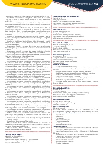 WWW.GHIDULPRIMARIILOR.RO JUDE%u021aUL MARAMURE%u0218 / 465Progresului nr. 54, 56, 58 %u0219i 60, respectiv str. Independen%u021bei nr. 24)Cre%u0219terea performan%u021bei energetice a blocurilor de locuin%u021be CF10 (str. Victoriei nr. 45, str. Victor Babe%u0219 nr. 31, Pia%u021ba Revolu%u021biei nr. 2, 3 %u0219i 4)Cre%u0219terea mobilit%u0103%u021bii urbane durabile %u00een Municipiul Baia Mare prin modernizarea parcului auto de transport public (5 troleibuze %u0219i 11 autobuze electrice)Implementarea sistemului ITS, a infrastructurii TIC %u0219i modernizarea sta%u021biilor de transport %u00een comun %u00een Municipiul Baia MareSmart Eco %u2013 Re%u021bea integrat%u0103 de acces la alimentare pentru vehicule electrice %u00een Municipiul Baia Mare (46 de sta%u021bii de %u00eenc%u0103rcare)Realizarea Coridorului de Mobilitate Urban%u0103 Durabil%u0103 %u2013 Zona Centrului Istoric (crearea traseelor pentru biciclete pe o lungime de 5,59 km)Realizarea Coridorului de Mobilitate Urban%u0103 Durabil%u0103 %u2013 Malul st%u00e2ng al r%u00e2ului S%u0103sar (crearea traseelor pentru biciclete pe o lungime de 6,63 km)Dezvoltarea Re%u021belei Integrate de Centre pentru Colectarea De%u0219eurilor prin Aport Voluntar %u00een Municipiul Baia Mare (crearea a 3 centre)Dezvoltarea re%u021belei integrate de insule ecologice digitale pentru managementul de%u0219eurilor %u00een Municipiul Baia Mare%u00cenfiin%u021barea Centrului Integrat de Colectare Selectiv%u0103 prin Aport Voluntar %u2013 Aglomerarea Urban%u0103 Baia MareModernizarea Pie%u021bei Revolu%u021biei%u00cenfiin%u021barea Pie%u021bei Universit%u0103%u021bii %u00een Municipiul Baia MareCre%u0219terea performan%u021bei energetice a unit%u0103%u021bilor de %u00eenv%u0103%u021b%u0103m%u00e2nt %u00een Municipiul Baia Mare %u2013 Gr%u0103dini%u021ba cu Program Prelungit nr. 28Cre%u0219terea performan%u021bei energetice a unit%u0103%u021bilor de %u00eenv%u0103%u021b%u0103m%u00e2nt %u00een Municipiul Baia Mare %u2013 Liceul Teoretic %u201eEmil Racovi%u021b%u0103%u201dCre%u0219terea performan%u021bei energetice a unit%u0103%u021bilor de %u00eenv%u0103%u021b%u0103m%u00e2nt %u00een Municipiul Baia Mare %u2013 %u0218coala Gimnazial%u0103 %u201eGeorge Co%u0219buc%u201dCre%u0219terea performan%u021bei energetice a unit%u0103%u021bilor de %u00eenv%u0103%u021b%u0103m%u00e2nt %u00een Municipiul Baia Mare %u2013 Colegiul Tehnic %u201eAurel Vlaicu%u201dCre%u0219terea performan%u021bei energetice a unit%u0103%u021bilor de %u00eenv%u0103%u021b%u0103m%u00e2nt %u00een Municipiul Baia Mare %u2013 Colegiul Tehnic %u201eGeorge Bari%u021biu%u201dCre%u0219terea performan%u021bei energetice a unit%u0103%u021bilor de %u00eenv%u0103%u021b%u0103m%u00e2nt %u00een Municipiul Baia Mare %u2013 Colegiul Tehnic %u201eC. D. Neni%u021bescu%u201dCre%u0219terea performan%u021bei energetice a unit%u0103%u021bilor de %u00eenv%u0103%u021b%u0103m%u00e2nt %u00een Municipiul Baia Mare %u2013 Gr%u0103dini%u021ba cu Program Prelungit %u201eMihai Eminescu%u201dCre%u0219terea performan%u021bei energetice a unit%u0103%u021bilor de %u00eenv%u0103%u021b%u0103m%u00e2nt %u00een Municipiul Baia Mare %u2013 Gr%u0103dini%u021ba cu Program Prelungit %u201eFloare de Col%u021b%u201dCre%u0219terea performan%u021bei energetice a unit%u0103%u021bilor de %u00eenv%u0103%u021b%u0103m%u00e2nt %u00een Municipiul Baia Mare %u2013 Colegiul Tehnic %u201eC. D. Neni%u021bescu%u201d (internat, cantin%u0103)Cre%u0219terea performan%u021bei energetice a unit%u0103%u021bilor de %u00eenv%u0103%u021b%u0103m%u00e2nt %u00een Municipiul Baia Mare %u2013 Seminarul Teologic Liceal Ortodox %u201eSf. Ierarh Iosif M%u0103rturisitorul%u201d %u2013 Corp BCre%u0219terea performan%u021bei energetice a unit%u0103%u021bilor de %u00eenv%u0103%u021b%u0103m%u00e2nt %u00een Municipiul Baia Mare %u2013 Seminarul Teologic Liceal Ortodox %u201eSf. Ierarh Iosif M%u0103rturisitorul%u201d %u2013 Corp ACre%u0219terea performan%u021bei energetice a unit%u0103%u021bilor de %u00eenv%u0103%u021b%u0103m%u00e2nt %u00een Municipiul Baia Mare %u2013 %u0218coala Gimnazial%u0103 %u201eLucian Blaga%u201dCre%u0219terea performan%u021bei energetice a unit%u0103%u021bilor de %u00eenv%u0103%u021b%u0103m%u00e2nt %u00een Municipiul Baia Mare %u2013 Colegiul Tehnic %u201eAnghel Saligny%u201dDotare cu mobilier %u0219i echipamente digitale a unit%u0103%u021bilor de %u00eenv%u0103%u021b%u0103m%u00e2nt preuniversitar %u2013 Ecosistem Digital de Educa%u021bie %u0219i Formare %u00een Municipiul Baia MareRestaurarea %u0219i reabilitarea Casei Pocol %u0219i amenajarea acesteia ca Centru CulturalReabilitarea Cinematografului DaciaModernizarea bulevardelor Independen%u021bei %u0219i Decebal %u0219i crearea unor trasee dedicate cu prioritate transportului public %u00een comun %u0219i pistelor pentru biciclete Modernizarea str%u0103zii Victoriei, tronson cuprins %u00eentre bulevardele Independen%u021bei %u0219i DecebalORA%u0218UL BAIA SPRIEAdres%u0103: P-%u0163a Libert%u0103%u0163ii, nr. 4Cod po%u0219tal: 435100Telefon: 0262-262303, 260000; Fax: 0262-260059; Adresa de e-mail: primaria@baiasprie.roURL: www.baiasprie.roCOMUNA B%u0102I%u0162A DE SUB CODRUAdres%u0103: nr. 19Cod po%u0219tal: 437020Telefon: 0262-268487; Fax: 0262-268407; Adresa de e-mail: primaria_baita@yahoo.comURL: www.baitadesubcodru.roCOMUNA B%u0102IU%u0162Adres%u0103: Principal%u0103, nr. 52Cod po%u0219tal: 437025Telefon: 0262-380012; Fax: 0362-802254; Adresa de e-mail: primariabaiut@yahoo.comURL: www.comunabaiut.roCOMUNA B%u0102SE%u0218TIAdres%u0103: Str. Principal%u0103, nr. 133Cod po%u0219tal: 437030Telefon: 0262-268509; Adresa de e-mail: primaria_basesti@yahoo.comURL: www.basestimm.roPersoane din primarie:Primar:Ioan%u00a0C%u0103l%u0103uz%u00a0Viceprimar: Marian Alexandru PopSecretar General:%u00a0Florian Pop%u00a0Contabil: Marius Cristian T%u0103m%u0103%u0219an%u00a0Popula%u021bia:%u00a01288; Proiecte de investi%u0163ii:Digitalizare prim%u0103rie %u2013 aprobatInstalare sistem de supraveghere video %u00ee