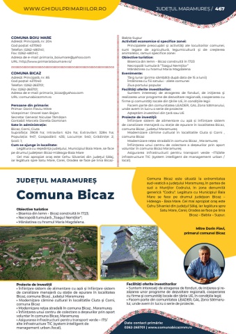 WWW.GHIDULPRIMARIILOR.RO JUDE%u021aUL MARAMURE%u0218 / 467COMUNA BOIU MAREAdres%u0103: Principal%u0103, nr. 204Cod po%u0219tal: 437060Telefon: 0262-480141; Fax: 0262-480141; Adresa de e-mail: primaria_boiumare@yahoo.comURL: http://www.primariaboiumare.ro/COMUNA BICAZAdres%u0103: Principal%u0103, nr. 85Cod po%u0219tal: 437040Telefon: 0262-265701; Fax: 0262-265701; Adresa de e-mail: primaria_bicaz@yahoo.comURL: comunabicazmm.roPersoane din primarie:Primar: Dorin Flaviu MitreViceprimar: Onorel Ioan BojanSecretar General: Niculae T%u0103m%u0103%u0219anContabil: Marcela Dorelia DominanSate %u00een administra%u021bie:Bicaz, Corni, CiutaSuprafa%u021ba:%u00a0 3908 ha; Intravilan:%u00a0 624 ha; Extravilan:%u00a0 3284 ha; Popula%u021bia:%u00a0 947; Gospod%u0103rii:%u00a0 435; Locuin%u021be:%u00a0 540; Gr%u0103dini%u021be:%u00a0 2; %u0218coli:%u00a01; Cum se ajunge in localitate:Leg%u0103tura cu re%u015fedin%u0163a jude%u0163ului, Municipiul Baia Mare, se face pe drumul jude%u0163ean Bicaz-Hideaga-Baia Mare Cel mai apropiat ora%u015f este Cehu Silvaniei din jude%u0163ul S%u0103laj, iar leg%u0103tura spre Satu Mare, Carei, Oradea se face pe linia BicazBabta-SupurActivitati economice si specifice zonei:Principalele preocup%u0103ri %u015fi activit%u0103%u0163i ale locuitorilor comunei, sunt legate de agricultur%u0103, legumicultur%u0103 %u015fi de cre%u015fterea animalelor, ramuri specifice zoneiObiective turistice:Biserica din lemn - Bicaz construit%u0103 %u00een 1723Necropol%u0103 tumular%u0103 %u201cToagul Nem%u0163ilor%u201dM%u0103n%u0103stirea cu hramul Maria MagdalenaEvenimente:T%u00e2rg lunar (prima s%u00e2mb%u0103t%u0103 dup%u0103 data de 15 a lunii)%u00cent%u00e2lnirea cu fiii satului - zilele comuneiZiua portului popularFacilit%u00e3%u0163i oferite investitorilor:Suntem interesa%u0163i de atragerea de fonduri, de ini%u0163ierea %u015fi realizarea unor programe de dezvoltare regional%u0103, cooperarea cu firme %u015fi comunit%u0103%u0163i locale din %u0163%u0103rile UE, %u00een condi%u0163iile legiiFacem parte din comunitatea LEADER, GAL Zona S%u0103tmarului, unde avem %u00een lucru o serie de proiecteA%u015ftept%u0103m investitori din %u0163ar%u0103 sau UEProiecte de investi%u0163ii:%u00cenfiin%u021bare sistem de alimentare cu ap%u0103%u00a0 %u0219i %u00eenfiin%u021bare sistem de canalizare menajer%u0103%u00a0cu sta%u021bie de epurare %u00een localitatea Bicaz, comuna Bicaz , jude%u021bul Maramure%u0219Modernizare c%u0103mine cultural %u00een localitatile Ciuta %u0219i Corni , comuna BicazModernizare re%u021bea stradal%u0103%u00a0%u00een comuna Bicaz , Maramure%u0219%u00cenfiin%u021barea unui centru de colectare a de%u0219eurilor prin aport voluntar %u00een comuna Bicaz Maramure%u0219 Asigurarea infrastructurii pentru transport verde %u2013ITS/alte infrastructure TIC (system intelligent de management urban /local).