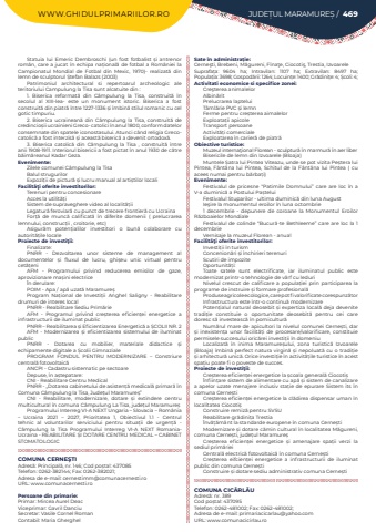WWW.GHIDULPRIMARIILOR.RO JUDE%u021aUL MARAMURE%u0218 / 469 Statuia lui Emeric Dembroschi (un fost fotbalist %u0219i antrenor rom%u00e2n, care a jucat %u00een echipa na%u021bional%u0103 de fotbal a Rom%u00e2niei la Campionatul Mondial de Fotbal din Mexic, 1970)- realizat%u0103 din lemn de sculptorul %u0218tefan Balazs (2003)Patrimoniul architectural si repertoarul archeologic ale teritoriului Campulung la Tisa sunt alcatuite din :1. Biserica reformat%u0103 din C%u00e2mpulung la Tisa, construit%u0103 %u00een secolul al XIII-lea- este un monument istoric. Biserica a fost construit%u0103 din piatr%u0103 %u00eentre 1227-1336 %u0219i %u00eembin%u0103 stilul romanic cu cel gotic timpuriu.2. Biserica ucrainean%u0103 din C%u00e2mpulung la Tisa, construit%u0103 de credincio%u0219ii ucrainieni Greco- catolici %u00een anul 1800, conform datelor consemnate din spatele iconostasului. Atunci c%u00e2nd religia Grecocatolic%u0103 a fost interzis%u0103 %u0219i aceast%u0103 biseric%u0103 a devenit ortodox%u0103.3. Biserica catolic%u0103 din C%u00e2mpulung la Tisa , construit%u0103 %u00eentre anii 1908-1911. Interiorul bisericii a fost pictat %u00een anul 1930 de c%u0103tre b%u0103im%u0103reanul Kadar Geza.Evenimente:Zilele comunei C%u00e2mpulung la TisaBalul strugurilor Expozi%u021bii de pictur%u0103 %u0219i lucru manual al arti%u0219tilor localiFacilit%u00e3%u0163i oferite investitorilor:Terenuri pentru concesionareAcces la utilit%u0103%u021biSistem de supraveghere video al localit%u0103%u021biiLegatur%u0103 feroviar%u0103 cu punct de trecere frontier%u0103 cu UcrainaFor%u021b%u0103 de munc%u0103 calificat%u0103 %u00een diferite domenii ( prelucrarea lemnului, construc%u021bii , croitorie, etc) Asigur%u0103m poten%u021bialilor investitori o bun%u0103 colaborare cu autorit%u0103%u021bile localeProiecte de investi%u0163ii:Finalizate:PNRR - Dezvoltarea unor sisteme de management al documentelor %u0219i fluxul de lucru, ghi%u0219eu unic virtual pentru cet%u0103%u021beniAFM - Programului privind reducerea emisilor de gaze, aprovizionare ma%u0219ini electrice%u00cen derulare:POIM - Apa / ap%u0103%u00a0uzat%u0103%u00a0Maramure%u0219Program Na%u021bional de Investi%u021bii Anghel Saligny - Reabilitare drumuri de interes localPNRR - Reabilitare Sediu Prim%u0103rieAFM - Programul privind cre%u0219terea eficien%u021bei energetice a infrastructurii de iluminat publicPNRR %u2013 Reabilitarea %u0219i Eficientizarea Energetic%u0103 a %u0218COLII NR. 2AFM - Modernizarea %u0219i eficientizarea sistemului de iluminat publicPNRR - Dotarea cu mobilier, materiale didactice %u0219i echipamente digitale a %u0218colii GimnazialePROGRAM FONDUL PENTRU MODERNIZARE %u2013 Constriure central%u0103 fotovoltaic%u0103ANCPI - Cadastru sistematic pe sectoareDepuse, %u00een a%u0219tepatare:CNI - Reabilitare Centru MedicalPNRR - %u201eDotarea cabinetului de asisten%u021b%u0103 medical%u0103 primar%u0103 %u00een Comuna C%u00e2mpulung la Tisa, Jude%u021bul Maramure%u0219%u201dCNI - Reabilitare, modernizare, dotare %u0219i extindere centru multicultural %u00een comuna C%u00e2mpulung La Tisa, jude%u021bul Maramure%u0219 Programului Interreg VI-A NEXT Ungaria %u2013 Slovacia %u2013 Rom%u00e2nia %u2013 Ucraina 2021 %u2013 2027, Prioritatea 1, Obiectivul 1.1 - Centrul tehnic al voluntarilor serviciului pentru situa%u021bii de urgen%u021b%u0103 - C%u00e2mpulung la Tisa Programului Interreg VI-A NEXT RomaniaUcraina - REABILITARE %u0218I DOTARE CENTRU MEDICAL %u2013 CABINET STOMATOLOGICCOMUNA CERNE%u015eTIAdres%u0103: Principal%u0103, nr. 146; Cod po%u0219tal: 437085Telefon: 0262-382144; Fax: 0262-382021; Adresa de e-mail: cernestimm@comunacernesti.roURL: www.comunacernesti.roPersoane din primarie:Primar: Mircea Aurel DeacViceprimar: Gavril DanciuSecretar: Vasile Cornel RomanContabil: Maria GherghelSate %u00een administra%u021bie:Cerne%u015fti, Brebeni, M%u0103gureni, F%u00eena%u0163e, Ciocoti%u015f, Trestia, IzvoareleSuprafa%u021ba:%u00a0 9604 ha; Intravilan:%u00a0 1107 ha; Extravilan:%u00a0 8497 ha; Popula%u021bia:%u00a03698; Gospod%u0103rii:%u00a01264; Locuin%u021be:%u00a01400; Gr%u0103dini%u021be:%u00a04; %u0218coli:%u00a04; Activitati economice si specifice zonei:Cre%u015fterea animalelorAlbin%u0103ritPrelucrarea lapteluiT%u00e2ml%u0103rie PVC %u0219i lemnFerme pentru cre%u0219terea aimalelorExploata%u021bii apicoleTransport persoaneActivit%u0103%u021bi comercialeExploatarea %u00een carier%u0103 de piatr%u0103Obiective turistice:Muzeul interna%u0163ional Florean - sculptur%u0103 %u00een marmur%u0103 %u00een aer liberBisericile de lemn din Izvoarele (Bloaja)Muntele %u0218atra lui Pintea Viteazu, unde se pot vizita Pe%u0219tera lui Pintea, F%u00e2nt%u00e2na lui Pintea, Schitul de la F%u00e2nt%u00e2na lui Pintea ( cu acees numai pentru b%u0103rba%u021bi)Evenimente:Festivalul de pricesne%u00a0 %u201cPatimile Domnului%u201d care are loc %u00een a V-a duminic%u0103 a Postului Pa%u0219teluiFestivalul Stuparilor - ultima duminic%u0103 din luna AugustIe%u015fire la monumentul eroilor %u00een luna octombrie1 decembrie - depunere de coroane la Monumentul Eroilor R%u0103zboaielor MondialeFestivalul de colinde %u201cBucur%u0103-te Bethleeme%u201d care are loc la 1 decembrieVernisaje la muzeul Florean - anualFacilit%u00e3%u0163i oferite investitorilor:Investi%u021bii %u00een turismConcenion%u0103ri %u0219i %u00eenchirieri terenuriScutiri de impoziteOportunit%u0103%u021bi:Toate satele sunt electrificate, iar iluminatul public este modernizat printr-o tehnologie de v%u00e2rf cu leduriNivelul crescut de calificare a popula%u021biei prin participarea la programe de instruire %u0219i formare profesional%u0103Produse agricole ecologice, care pot fi valorificate corespunz%u0103torInfrastructura este %u00eentr-o continu%u0103 modernizarePoten%u021bialul natural deosebit %u0219i expertiza local%u0103 deja devenite tradi%u021bie constituie o oportunitate deosebit%u0103 pentru cei care doresc s%u0103 investeasc%u0103 %u00een pomicultur%u0103Num%u0103rul mare de apiculto