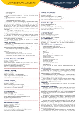 WWW.GHIDULPRIMARIILOR.RO JUDE%u021aUL MARAMURE%u0218 / 471Biserica reformat%u0103Izvorul VajdaMonumentul eroilor c%u0103zu%u021bi %u00een Primul %u0219i Al Doilea R%u0103zboi Mondial Mormintele eroilor %u00een cimitirul reformatEvenimente:1. Festivitatea de comemorare Pet%u0151fi%u00cen fiecare an, %u00een prima duminic%u0103 a lunii septembrie se %u0163ine la Colt%u0103u Festivitatea de comemorare Pet%u0151fi. Regiunea cu oaspe%u0163ii sosi%u0163i din %u0163inuturile %u00eendep%u0103rtate comemoreaz%u0103 luna de miere petrecut%u0103 aici de c%u0103tre so%u0163ii Pet%u0151fi. Comemorarea %u00eencepe cu o slujb%u0103 religioas%u0103, apoi cu depunerea coroanelor la statuia Pet%u0151fiSzendrey din parc, %u015fi %u00een final urmeaz%u0103 un program cultural-artistic %u00een aer liber.2. Zilele Teleki %u2013 are loc %u00een luna mai3. La 15 martie se organizeaz%u0103 o s%u0103rb%u0103toare %u00een memoria eroilor c%u0103zu%u021bi %u00een revolu%u021bia din 18484. Festivitatea p%u0103str%u0103torii datinilor str%u0103vechi %u2013 con%u021bine activit%u0103%u021bi de %u00eempletituri din p%u0103nu%u0219i de porumb, %u00eempletirea obiectelor din paie, %u021besutul maual al covoarelor, ol%u0103rit, lucru manual cu m%u0103rgele, pictur%u0103, jocuri tradi%u021bionale, %u0219i altele 5. Festivitatea por%u021bilor deschise la muzeu %u2013 cu activit%u0103%u021bi interactive cu publicul la muzeuProiecte de investi%u0163ii:Extinderea %u0219i reabilitarea infrastructurii destinat%u0103 culturii, cultelor %u0219i sportuluiDezvoltarea infrastructurii de ap%u0103 %u0219i ap%u0103 uzat%u0103, construirea unei sta%u021bii de epurare %u0219i tratare a apelor uzateAsfaltarea drumurilor, consolidarea pode%u021belorDezvoltarea serviciilor medicale %u0219i de s%u0103n%u0103tate oferite cet%u0103%u021benilorPrograme de incluziune social%u0103Dezvoltarea %u0219i modernizarea infrastucturii sociale Crearea unui complex de agreement, parc de aventur%u0103COMUNA COPALNIC M%u0102N%u0102%u015eTURAdres%u0103: Principal%u0103, nr. 225ACod po%u0219tal: 437100Telefon: 0262-497003, 497499(ev.persoanelor); Fax: 0262-497455; Adresa de e-mail: copalnicmanastur@yahoo.comccm@primariacopalnicmanastur.roURL: www.primariacopalnicmanastur.roCOMUNA COROIENIAdres%u0103: Principal%u0103, nr. 176Cod po%u0219tal: 437126Telefon: 0262-389311; Fax: 0262-389301; Adresa de e-mail: coroieniprimaria@yahoo.roURL: http://www.comunacoroieni.ro/COMUNA CUP%u015eENIAdres%u0103: Principal%u0103, nr. 32Cod po%u0219tal: 437130Telefon: 0262-383021; Fax: 0262-383125; Adresa de e-mail: primariacupseni@yahoo.comURL: http://www.primaria-cupseni.ro/COMUNA DESE%u015eTIAdres%u0103: Principal%u0103, nr.190Cod po%u0219tal: 437135Telefon: 0262-372601; Fax: 0262-372601; Adresa de e-mail: primar@primariadesestimm.ro secretar@primariadesestimm.roURL: https://primariadesestimm.ro/ORA%u0218UL DRAGOMIRE%u015eTIAdres%u0103: 1 Decembrie 1918, nr. 151Cod po%u0219tal: 437140Telefon: 0262-337007, 337361; Fax: 0262- 337361; Adresa de e-mail: primaria.dragomiresti@yahoo.comURL: www.dragomiresti-maramures.roCOMUNA DUMBR%u0102VI%u0162AAdres%u0103: Principal%u0103, nr. 225Cod po%u0219tal: 437145Telefon: 0262-299001; Fax: 0262-299688; Adresa de e-mail: primariadumbravita@yahoo.comURL: www.primariadumbravitamm.roCOMUNA F%u0102RCA%u015eAAdres%u0103: Independen%u0163ei, nr. 59Cod po%u0219tal: 437155Telefon: 0262-266001; Fax: 0262-266003; Adresa de e-mail: primaria@farcasa-mm.roURL: www.farcasa-mm.roPersoane din primarie:Primar: Ioan%u00a0StegeranViceprimar: Marcel Daniel Gre%u021bie%u0219Secretar General: Rodica%u00a0Toma%u00a0Contabil: Adelu%u0163a - Dorina%u00a0Bu%u015fecanSate %u00een administra%u021bie:F%u0103rca%u015fa, S%u00e2rbi, T%u0103maia, Buze%u015ftiSuprafa%u021ba:%u00a0 4934 ha; Intravilan:%u00a0 1473 ha; Extravilan:%u00a0 3462 ha; Popula%u021bia:%u00a0 4123; Gospod%u0103rii:%u00a0 1620; Locuin%u021be:%u00a0 1509; Gr%u0103dini%u021be:%u00a0 2; %u0218coli:%u00a01; Licee:%u00a01; Activitati economice si specifice zonei:Produc%u0163ie echipamente electriceTransport intern %u0219i interna%u0163ional de m%u0103rfuriPrelucrarea lemnuluiComer%u021bServiciiAgricultur%u0103 Firme reprezentative:SC EATON ELECTRO PRODUC%u021aIE SRLSC HAGERO SRLSC TRUCK SPEED SRLSC RIDORAIL ROM%u00c2NIA SRLSC MARAL STIL SRLSC VVM PECO SRLSC QUALITY CONSTRUCT SRLProduse locale: Sucuri naturale de fructe, gemuri, diverse sortimente de br%u00e2nz%u0103, uleiuri Obiective turistice:Biserica de lemn %u201eSfin%u021bii Arhangheli Mihail %u0219i Gavril%u201d din Buze%u0219ti, dat%u00e2nd din 1799, monument istoric inclus %u00een Lista monumentelor istorice de valoare na%u021bional%u0103, MM-II-m-A-04533, restaurant %u00een vederea includerii %u00een circuitul turisticCimitirele evreie%u0219ti din localit%u0103%u021bile F%u0103rca%u0219a, T%u0103maia %u0219i Buze%u0219ti au fost puse %u00een valoare de c%u0103tre autorit%u0103%u021bile locale %u0219i reprezint%u0103 obiective ce pot fi vizitate de c%u0103tre turi%u0219ti Monumentele ridicate %u00een localit%u0103%u021bile F%u0103rca%u0219a %u0219i T%u0103maia pentru cinstirea eroilor c%u0103zu%u021bi %u00een Primul %u0219i Al doilea r%u0103zboi Mondial au fost reabilitate prin grija autorit%u0103%u021bilor localeEvenimente:Festivalul de colinde %u201cDeschide u%u015fa, cre%u015ftine%u201d , desf%u0103%u0219urat %u00een luna decembrieFacilit%u00e3%u0163i oferite investitorilor:Accesul la utilit%u0103%u021bi, emiterea certificatelor de urbanism %u0219i a autoriza%u021biilor de construire la nivel local, existen%u021ba la nivelul institu%u021biei a persoanelor preg%u0103tite %u00een identificarea surselor de finan%u021bare, inclusiv pentru beneficiarii priva%u021bi, apoi implementarea proiectelor din fonduri locale, guvernamentale sau europene Oportunit%u0103%u021bi:Localizarea comunei F%u0103rca%u0219a, din punct de vedere al reliefului, dar %u0219i raportat la distan%u021ba relativ sc%u0103zut%u0103 fa%u021b%u0103 de municipiul re%u0219edin%u021b%u0103 d