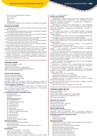 WWW.GHIDULPRIMARIILOR.RO JUDE%u021aUL MARAMURE%u0218 / 475Drum acces spre satele din comun%u0103Curent electricGaz metanAp%u0103Oportunit%u0103%u021bi:Posibilitatea realiz%u0103rii unor investi%u021bii %u00een domeniul activit%u0103%u021bilor economice principaleProiecte de investi%u0163ii:Modernizare str%u0103zi de interes local %u00een comuna Mire%u0219u Mare/proiect %u00een derulareAmenajare spa%u021bii de joac%u0103 pentru copii %u00een localitatea Luc%u0103ce%u0219ti, comuna Mire%u0219u Mare/ proiect %u00een derulareAmenajare spa%u021bii de joac%u0103 pentru copii %u00een localitatea Tulghie%u0219, comuna Mire%u0219u Mare/ proiect %u00een derulareAmenajare spa%u021bii de joac%u0103 pentru copii %u00een localitatea D%u0103ne%u0219tii Chioarului, comuna Mire%u0219u Mare/ proiect %u00een derulareAmenajare spa%u021bii de joac%u0103 pentru copii %u00een localitatea Reme%u021bi pe Some%u0219, comuna Mire%u0219u Mare/ proiect %u00een derulareAmenajare spa%u021bii de joac%u0103 pentru copii %u00een localitatea Iad%u0103ra, comuna Mire%u0219u Mare/ proiect %u00een derulareRe%u021bea de canalizare menajer%u0103 %u0219i racorduri de canalizare %u00een localit%u0103%u021bile Mire%u0219u Mare, Iad%u0103ra, Reme%u021bi pe Some%u0219 %u0219i Tulghie%u0219, comuna Mire%u0219u Mare, jude%u021bul Maramure%u0219/ proiect %u00een derulareCentru de colectare selectiv%u0103 a de%u0219eurilor prin aport voluntar %u00een Comuna Miresu Mare, Jude%u021bul Maramures/proiect %u00een derulare PNRR- C15-Dotarea cu mobilier, materiale didactice %u0219i echipamente digitale a unit%u0103%u021bilor de %u00eenv%u0103%u021b%u0103m%u00e2nt preuniversitar %u0219i a unit%u0103%u021bilor conexe/proiect %u00een derulareCOMUNA MOISEIAdres%u0103: Principal%u0103, nr. 1300Cod po%u0219tal: 437195Telefon: 0262-347601; Fax: 0262-347133; Adresa de e-mail: contact@primariamoisei.roURL: www.primariamoisei.roPersoane din primarie:Primar: Grigore Tomoiag%u0103Viceprimar: Matei Tomoiag%u0103Secretar General: Vasile HojdaContabil: Vlonga MafteiSuprafa%u021ba:%u00a0 11300 ha; Intravilan:%u00a0 1018 ha; Extravilan:%u00a0 3899 ha; Popula%u021bia:%u00a09300; Gospod%u0103rii:%u00a04800; Locuin%u021be:%u00a04800; Gr%u0103dini%u021be:%u00a03; %u0218coli:%u00a03; Cum se ajunge in localitate:%u00cen comuna Moisei se poate ajunge doar cu transport privat sau %u00een comun prin cele doua artere principale ce traverseaz%u0103 comuna noastr%u0103, DN17 %u015fi DN18. Coordonate: 47%u00b039%u203214%u2032%u2032N 24%u00b033%u20192%u201dEActivitati economice si specifice zonei:Activit%u0103%u0163i turismExploatarea lemnuluiComer%u021bFirme reprezentative: SC ATLANTIS SRLSC DURLISCAU LIBRA SRLSC LUNCA GI. SRLSC LUCASION SRLSC ECO-TIM SRLSC NATSIS SRLSC JEEVES PROD CO SRLS.C. GBH FLO AREDAMENTI SRLSC ATLANTIS SRLSC LUCASION SRLSC ECO-TIM SRLProduse locale:Produse de panifica%u021bie %u0219i p%u00e2ineObiective turistice:Monumentul eroilor de la MoiseiM%u00e2n%u0103stirea MoiseiParcul Na%u021bional Mun%u021bii Rodnei, Vf.Pietrosul ( 2303 m )Cascada M%u0103guraEvenimente:1 Iunie %u2013 Ziua copilului %u2013 Luna IunieZilele comunei Moisei %u2013 Luna AugustHramul M%u00e2n%u0103stirii Moisei %u2013 Luna August Festivalul Na%u021bional de Colinde %u0219i Obiceiuri de Iarn%u0103 %u201cIOAN HOREA%u201d %u2013 Luna DecembrieProiecte de investi%u0163ii:%u201dReabilitare %u0219i dotare %u0219coala gimnazial%u0103 %u201cDragos Vod%u0103%u201d din localitatea Moisei, jude%u021bul Maramure%u015f%u201d - prin %u201cprogramul privind cre%u0219terea eficien%u021bei energetice %u0219i gestionarea inteligent%u0103%u00a0 a energiei %u00een cl%u0103dirile publice%u201d%u201cReabilitare %u0219i dotare %u0219coala gimnazial%u0103 nr. 1 din localitatea Moisei, jude%u021bul Maramures%u201d - prin %u201cprogramul privind cre%u015fterea eficien%u021bei energetice %u0219i gestionarea inteligent%u0103%u00a0 a energiei %u00een cl%u0103dirile publice%u201d%u201cPod peste r%u00e2ul Viseu %u00een zona Valea Ursoaiei, localitatea Moisei, jude%u021bul Maramures%u201d - prin programul na%u0163ional de investi%u021bii %u201cAnghel Saligny%u201d%u201cExtindere re%u021bea de ap%u0103 %u00een comuna Moisei, jude%u021bul Maramure%u015f - prin programul national de investitii %u201cAnghel Saligny%u201d%u201cExtindere re%u0163ea de canalizare %u015fi sta%u0163ie de epurare %u00een comuna Moisei, jude%u0163ul Maramure%u015f%u201d - prin programul na%u021bional de investi%u021bii %u201cAnghel Saligny%u201d%u201cReabilitare drumuri %u00een comuna Moisei%u201d - prin programul na%u021bional de investi%u021bii %u201cAnghel Saligny%u201d%u201cModernizarea sistemului de iluminat public %u00een comuna Moisei%u201d - prin programul %u201ccre%u015fterea eficien%u0163ei energetice infrastructurii de iluminat public%u201d %u201cSta%u021bii de re%u00eenc%u0103rcare pentru vehiculele electrice %u00een comuna Moisei, jude%u021bul Maramure%u0219%u00a0%u201c - prin %u201cProgramul privind reducerea emisiilor de gaze cu efect de ser%u0103%u00a0%u00een transporturi, prin promovarea infrastructurii pentru vehicule de transport rutier nepoluant din punct de vedere energetic: sta%u021bii de de re%u00eenc%u0103rcare pentru vehicule electrice %u00een localit%u0103%u021bi%u201dSistem inteligent de management local %u00een Comuna Moisei, judetul Maramure%u0219%u00a0- prin PNRRElaborarea %u00een format GIS a documentelor de amenajare a teritoriului %u0219i planificare urban%u0103: Plan Urbanistic General a Comunei Moisei, Jude%u021bul Maramure%u015f - prin PNRRDotarea cu mobilier, materiale didactice %u015fi echipamente digitale a unit%u0103%u021bilor de %u00eenv%u0103%u0163%u0103m%u00e2nt preuniversitar %u015fi a unit%u0103%u0163ilor conexe - prin PNRRReabilitare drum DC1 - prin PNDL1Drumuri de Interes Local - prin PNDL1Reabilitare %u015fi modernizare Dispensar Uman - prin CNIRefacere drumuri %u015fi consolid%u0103ri, ziduri de sprijin %u00een zonele afectate de calamit%u0103%u0163i %u2013 prin CNIReconversia %u0218colii