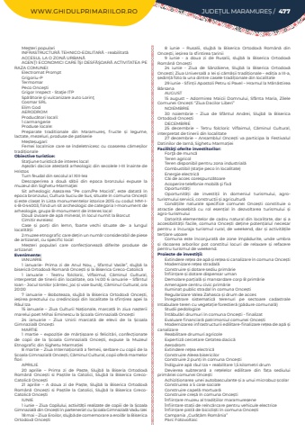 WWW.GHIDULPRIMARIILOR.RO JUDE%u021aUL MARAMURE%u0218 / 477Me%u015fteri populariINFRASTRUCTUR%u0102 TEHNICO-EDILITAR%u0102 - reabilitat%u0103ACCESUL LA O ZON%u0102 URBAN%u0102AGEN%u0162I ECONOMICI CARE %u00ce%u015eI DESF%u0102%u015eOAR%u0102 ACTIVITATEA PE RAZA COMUNEI:Electromat PromptGrigoriu-PTermomarPeco Once%u015ftiGrigor Inspect - Sta%u0163ie ITPSp%u0103l%u0103torie %u015fi vulcanizare auto Lorin%u0163Cosmar SRLElim GodAERODROMProduc%u0103tori locali:1 carmangerieProduse locale:Preparate traditionale din Maramure%u0219, fructe %u0219i legume, lactate, mezeluri, produse de patiserieMe%u0219te%u0219ugari: Femei localnice care se %u00eendeletnicesc cu coaserea c%u0103me%u0219ilor tradi%u021bionaleObiective turistice:Sta%u0163iune turistic%u0103 de interes localA%u015fez%u0103ri dacice atestat%u0103 arheologic din secolele I-III %u00eenainte de HristosTurn feudal din secolul al XIII-leaDescoperirea a dou%u0103 s%u0103bii din epoca bronzului expuse la muzeul din Sighetu-Marma%u0163ieiSit arheologic A%u0219ezarea %u201cPe corn/Pe Mocir%u0103%u201d, este datat%u0103 %u00een epoca bronzului, Cultura Suciu de Sus, situate %u00een comuna Once%u0219ti %u0219i este clasat %u00een Lista monumentelor istorice 2015 cu codul: MM-Is-B-044003, fiind un sit archeologic de categoria I-monument de arheologie, grupa B-monument de interes localDou%u0103 izvoare de ap%u0103 mineral, %u00een locul numit la BorcutCimitir evreiescCase %u0219i por%u021bi din lemn, foarte vechi situate de- a lungul localit%u0103%u021bii2 muzee etnografic care de%u021bin un num%u0103r considerabil de piese de artizanat, cu specific localMe%u0219teri populari care confec%u021bioneaz%u0103 diferite produse de artizanatEvenimente:IANUARIE1 ianuarie- Prima zi de Anul Nou, %u201e Sfantul Vasile%u201d, slujb%u0103 la biseric%u0103 Ortodox%u0103 Roman%u0103 Once%u0219ti %u0219i la Biserica Greco-Catolic%u01031 ianuarie - Teatru folcloric, Viflaimul, C%u0103minul Cultural, interpretat de tinerii din localitate, ora 14:00 6 ianuarie %u2013 Sf%u00e2ntul Ioan - Jocul Ionilor (c%u00e2ntec, joc %u0219i voie bun%u0103), C%u0103minul Cultural, ora 20:007 ianuarie %u2013 Boboteaza, slujb%u0103 la Biserica Ortodox%u0103 Once%u0219ti, ie%u0219irea preotului cu credincio%u0219ii din localitate la sfin%u021birea apei la R%u00e2ul Iza15 ianuarie %u2013 Ziua Culturii Na%u021bionale, marcat%u0103 %u00een ziua na%u0219terii marelui poet Mihai Eminescu la %u0218coala Gimnazial%u0103 Once%u0219ti24 ianuarie %u2013 Ziua Unirii marcat%u0103 de elevii de la %u0218coala Gimnazial%u0103 Once%u0219tiMARTIE1 martie %u2013 expozi%u021bie de m%u0103r%u021bi%u0219oare %u0219i felicit%u0103ri, confec%u021bionate de copii de la %u0218coala Gimnazial%u0103 Once%u0219ti, expuse la Muzeul Etnografic din Sighetu Marma%u021biei8 martie %u2013 Ziua Interna%u021bional%u0103 a femeii, serbare cu copii de la %u0218coala Gimnazial%u0103 Once%u0219ti, C%u0103minul Cultural, copii ofer%u0103 mamelor floriAPRILIE20 aprilie %u2013 Prima zi de Pa%u0219te, Slujb%u0103 la Biseria Ortodox%u0103 Rom%u00e2n%u0103 Once%u0219ti si Pa%u0219tile la Catolici, Slujb%u0103 la Biserica GrecoCatolic%u0103 Once%u0219ti 21 aprilie %u2013 A doua zi de Pa%u0219te, Slujb%u0103 la Biserica Ortodox%u0103 Rom%u00e2n%u0103 Once%u0219ti si Pa%u0219tile la Catolici, Slujb%u0103 la Biserica GrecoCatolic%u0103 Once%u0219tiIUNIE1 iunie %u2013 Ziua Copilului, activit%u0103%u021bii realizate de copiii de la %u0218coala Gimnazial%u0103 din Once%u0219ti %u00een parteneriat cu %u0218coala Gimnazial%u0103 Vadu Izei18 mai %u2013 Ziua Eroilor, slujb%u0103 de comemorare a eroil%u0103r la Biserica Ortodox%u0103 Once%u0219ti8 iunie %u2013 Rusalii, slujb%u0103 la Biserica Ortodox%u0103 Rom%u00e2n%u0103 din Once%u0219ti, ie%u0219irea la sfintirea %u021barinii9 iunie - a doua zi de Rusalii, slujb%u0103 la Biserica Ortodox%u0103 Rom%u00e2n%u0103 Once%u0219ti24 iunie - Ziua de S%u00e2nz%u00e2iene, Slujb%u0103 la Biserica Ortodox%u0103 Once%u0219ti; Ziua Universal%u0103 a Iei %u0219i c%u0103m%u0103%u0219ii tradi%u021bionale %u2013 edi%u021bia a III-a, %u0219edin%u021b%u0103 foto la una dintre casele tradi%u021bionale din localitate29 iunie - Sfin%u021bii Apostoli Petru si Pavel %u2013 Hramul la M%u0103n%u0103stirea B%u00e2rsanaAUGUST15 august %u2013 Adormirea Maicii Domnului, Sf%u00e2nta Maria, Zilele Comunei Once%u0219ti %u201cZiua Dacilor Liberi%u201dNOIEMBRIE30 noiembrie %u2013 Ziua de Sf%u00e2ntul Andrei, Slujb%u0103 la Biserica Ortodox%u0103 Once%u0219tiDECEMBRIE25 decembrie %u2013 Tetru folcloric Viflaimul, C%u0103minul Cultural, interpretat de tinerii din localitate 27 decembrie %u2013 Ansamblul Once%u0219ti va participa la Festivalul Datinilor de Iarn%u0103, Sighetu Marma%u021bieiFacilit%u00e3%u0163i oferite investitorilor:For%u0163%u0103 de munc%u0103Teren agricolTeren disponibil pentru zona industrial%u0103Combustibil (sta%u0163ie peco %u00een localitate)Energie electric%u0103C%u0103i de acces corespunz%u0103toareAcoperire telefonie mobil%u0103 %u015fi fix%u0103Oportunit%u0103%u021biOportunit%u0103%u021bi de investi%u021bii %u00een domeniul turismului, agroturismului servicii, construc%u021bii %u0219i agricultur%u0103Condi%u021biile naturale specifice comunei Once%u0219ti constituie o atrac%u021bie deosebit%u0103 cu rol esen%u021bial %u00een dezvoltarea turismului %u0219i agro-turismuluiDatorit%u0103 elementelor de cadru natural din localitate, dar %u0219i a accesibilit%u0103%u021bii facile, comuna Once%u0219ti de%u021bine poten%u021bialul necesar pentru a %u00eencuraja turismul rural, de weekend, dar %u0219i activit%u0103%u021bile ter%u021biare u%u0219oare Comuna este %u00eenconjurat%u0103 de zone %u00eemp%u0103durite, unde umbra %u0219i r%u0103coarea arborilor pot constitui locuri de relaxare %u0219i refacere pentru turismul de weekend.Proiecte de investi%u0163ii:Extindere re%u021bea de ap%u0103 %u0219i re%u021bea si canalizare %u00een comuna Once%u0219tiModernizare re%u021bea stradal%u0103Construire %u0219i dota