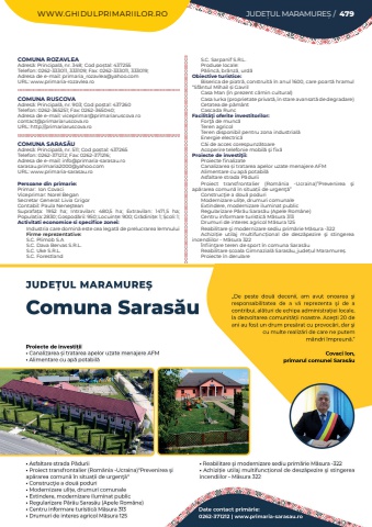 WWW.GHIDULPRIMARIILOR.RO JUDE%u021aUL MARAMURE%u0218 / 479COMUNA ROZAVLEAAdres%u0103: Principal%u0103, nr. 348; Cod po%u0219tal: 437255Telefon: 0262-333011, 333109; Fax: 0262-333011, 333019; Adresa de e-mail: primaria_rozavlea@yahoo.comURL: www.primaria-rozavlea.roCOMUNA RUSCOVAAdres%u0103: Principal%u0103, nr. 903; Cod po%u0219tal: 437260Telefon: 0262-365251; Fax: 0262-365040; Adresa de e-mail: viceprimar@primariaruscova.rocontact@primariaruscova.ro URL: http://primariaruscova.roCOMUNA SARAS%u0102UAdres%u0103: Principal%u0103, nr. 511; Cod po%u0219tal: 437265Telefon: 0262-371212; Fax: 0262-371216; Adresa de e-mail: info@primaria-sarasau.rosarasau.primaria2000@yahoo.comURL: www.primaria-sarasau.roPersoane din primarie:Primar: %u00a0Ion CovaciViceprimar: Norel BeganSecretar General: Livia GrigorContabil: Paula Nene%u015fteanSuprafa%u021ba:%u00a0 1952 ha; Intravilan:%u00a0 480,5 ha; Extravilan:%u00a0 1471,5 ha; Popula%u021bia:%u00a02830; Gospod%u0103rii:%u00a0950; Locuin%u021be:%u00a0900; Gr%u0103dini%u021be:%u00a01; %u0218coli:%u00a01; Activitati economice si specifice zonei:Industria care domin%u0103 este cea legat%u0103 de prelucrarea lemnuluiFirme reprezentative:S.C. Plimob S.AS.C. Dava Bervas S.R.L.S.C. Uke S.R.L.S.C. ForestlandS.C. Sarpanif S.R.L.Produse locale: P%u0103linc%u0103, br%u00e2nz%u0103, urd%u0103Obiective turistice:Biserica de piatr%u0103, construit%u0103 %u00een anul 1600, care poart%u0103 hramul %u201cSf%u00e2ntul Mihail %u0219i GavrilCasa Man (%u00een prezent c%u0103min cultural)Casa Iurka (proprietate privat%u0103, %u00een stare avansat%u0103 de degradare)Cetatea de p%u0103m%u00e2nt Cascada RuncFacilit%u00e3%u0163i oferite investitorilor:For%u0163%u0103 de munc%u0103Teren agricolTeren disponibil pentru zona industrial%u0103Energie electric%u0103C%u0103i de acces corespunz%u0103toare Acoperire telefonie mobil%u0103 %u015fi fix%u0103Proiecte de investi%u0163ii:Proiecte finalizateCanalizarea %u0219i tratarea apelor uzate menajere AFMAlimentare cu ap%u0103 potabil%u0103Asfaltare strada P%u0103duriiProiect transfrontalier (Rom%u00e2nia -Ucraina)%u201dPrevenirea %u015fi ap%u0103rarea comun%u0103 %u00een situa%u021bii de urgen%u0163%u0103%u201dConstruc%u0163ie a dou%u0103 poduriModernizare uli%u021be, drumuri comunaleExtindere, modernizare iluminat publicRegularizare P%u00e2r%u00e2u Saras%u0103u (Apele Rom%u00e2ne)Centru informare turistic%u0103 M%u0103sura 313Drumuri de interes agricol M%u0103sura 125Reabilitare %u015fi modernizare sediu prim%u0103rie M%u0103sura -322Achizi%u021bie utilaj multifunc%u021bional de desz%u0103pezire %u015fi stingerea incendiilor - M%u0103sura 322%u00cenfiin%u0163are teren de sport %u00een comuna Saras%u0103uReabilitare %u0219coala Gimnazial%u0103%u00a0Saras%u0103u, jude%u021bul Maramure%u0219.Proiecte %u00een derulare