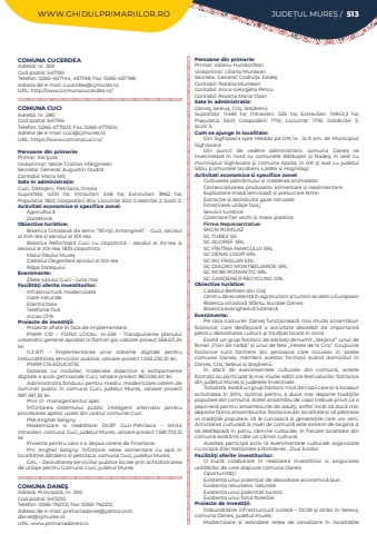 WWW.GHIDULPRIMARIILOR.RO JUDE%u021aUL MURE%u0218 / 513COMUNA CUCERDEAAdres%u0103: nr. 329Cod po%u0219tal: 547190Telefon: 0265-457144, 457198; Fax: 0265-457198; Adresa de e-mail: cucerdea@cjmures.roURL: http://www.comunacucerdea.ro/COMUNA CUCIAdres%u0103: nr. 280Cod po%u0219tal: 547195Telefon: 0265-477503; Fax: 0265-477504; Adresa de e-mail: cuci@cjmures.roURL: https://www.comunacuci.ro/Persoane din primarie:Primar:%u00a0Ilie %u015eutaViceprimar: Vasile Cristian M%u0103rgineanSecretar General: Augustin Dudil%u0103%u00a0Contabil: Maria M%u00ee%u0163Sate %u00een administra%u021bie:Cuci, D%u0103t%u0103%u015feni, Petrilaca, OrosiaSuprafa%u021ba:%u00a0 4210 ha; Intravilan:%u00a0 248 ha; Extravilan:%u00a0 3962 ha; Popula%u021bia:%u00a01822; Gospod%u0103rii:%u00a0814; Locuin%u021be:%u00a0822; Gr%u0103dini%u021be:%u00a02; %u0218coli:%u00a02; Activitati economice si specifice zonei:Agricultur%u0103ZootehnieObiective turistice:Biserica Ortodox%u0103 de lemn %u201cSfin%u0163ii Arhangheli%u201d - Cuci, secolul al XVII-lea %u0219i secolul al XIX-leaBiserica Reformat%u0103 Cuci cu clopotni%u021b%u0103 - secolul al XV-lea %u0219i secolul al XIX-lea, 1835 clopotni%u021ba%u00a0Malul R%u00e2ului Mure%u015fCastelul Degenfeld secolul al%u00a0XIX-leaR%u00e2pa Date%u015fuluiEvenimente:Zilele satului Cuci - luna maiFacilit%u00e3%u0163i oferite investitorilor:Infrastructur%u0103 modernizat%u0103Gaze naturaleElectricitateTelefonie fix%u0103Acces CFRProiecte de investi%u0163ii:Proiecte aflate %u00een faza de implementare:PNRR C10 %u2013 FOND LOCAL: I4-559 - Transpunerea planului urbanistic general aprobat %u00een format gis, valoare proiect 556.511,24 leiI1.2-671 %u2013 %u00cemplementarea unor sisteme digitale pentru %u00eembun%u0103t%u0103%u021birea serviciilor publice, valoare proiect 1.053.230,31 lei.PNRR C15 EDUCA%u021aIE:Dotarea cu mobilier, materiale didactice %u0219i echipamente digitale a %u0219colii gimnaziale Cuci, valoare proiect 861.036,40 lei.Administra%u021bia fondului pentru mediu: modernizare sistem de iluminat public %u00een comuna Cuci, jude%u021bul Mure%u0219, valoare proiect 997.491,33 leiPnrr c1- managementul apei:%u00cenfiin%u021barea sistemului public inteligent alternativ pentru procesarea apelor uzate din cadrul comunei CuciPNI Anghel Saligny:Modernizare %u0219i reabilitare DC87 Cuci-Petrilaca %u2013 limita intravilan, comuna Cuci, jude%u021bul Mure%u0219, valoare proiect 1.581.732,12 leiProiecte pentru care s-a depus cerere de finan%u021bare:Pni Anghel Saligny: %u00cenfiin%u021bare re%u021bea alimentare cu ap%u0103 %u00een localit%u0103%u021bile d%u0103t%u0103%u0219eni %u0219i petrilaca, comuna Cuci, jude%u021bul Mure%u0219;GAL %u2013 Dezvoltarea serviciilor publice locale prin achizi%u021bionarea de utilaje pentru Comuna Cuci, jude%u021bul%u00a0Mure%u0219COMUNA DANE%u015eAdres%u0103: Principal%u0103, nr. 390Cod po%u0219tal: 547200Telefon: 0265-762112; Fax: 0265-762212; Adresa de e-mail: primariadanes@yahoo.comdanes@cjmures.roURL: www.primariadanes.roPersoane din primarie:Primar: Valeriu HundorfeanViceprimar: Liliana MunteanSecretar General: Codru%u0163a Jolde%u015fContabil: Rozalia MunteanContabil: Anca-Georgeta PetcuContabil: Roxana Maria O%u0219anSate %u00een administra%u021bie:Dane%u015f, Seleu%u015f, Cri%u015f, Stej%u0103reniiSuprafa%u021ba:%u00a0 11469 ha; Intravilan:%u00a0 525 ha; Extravilan:%u00a0 10943,2 ha; Popula%u021bia:%u00a0 5501; Gospod%u0103rii:%u00a0 1716; Locuin%u021be:%u00a0 1716; Gr%u0103dini%u021be:%u00a0 3; %u0218coli:%u00a03; Cum se ajunge in localitate:Din Sighi%u0219oara spre Media%u0219 pe DN 14 , la 9 km. de Municipiul Sighi%u0219oaraDin punct de vedere administrativ comuna Dane%u015f se %u00eenvecineaz%u0103 %u00een nord cu comunele B%u0103l%u0103u%u015feri %u015fi Nade%u015f, %u00een vest cu municipiul Sighisoara %u015fi comuna Apold, %u00een est %u015fi sud cu jude%u0163ul Sibiu (comunele Iacobeni, Laslea %u0219i Hoghilag)Activitati economice si specifice zonei:Cultivarea p%u0103m%u00e2ntului %u0219i cre%u0219terea animalelor Comercializarea produselor alimentare %u0219i nealimentareExploatare mas%u0103 lemnoas%u0103 %u0219i prelucrare lemnExtrac%u021bie %u0219i distribu%u021bie gaze naturale%u00centre%u021binere utilaje forajServicii turisticeColectare fier vechi %u0219i mase plasticeFirme Reprezentative:SNGN ROMGAZSC TUBEX SASC AGOREF SRLSC F%u00ceNT%u00ceNA MARCULUI SRLSC DENIS COOP SRLSC RO FRISLAN SRLSC DIAGRO MONTBELIARDE SRLSC MOBI ROMANTIC SRL SC GARDENER RECYCLING SRLObiective turistice:Castelul Bethlen din Cri%u015fCentru de excelen%u021b%u0103 %u00een agroturism %u0219i turism ecvestru EuropeanBiserica ortodox%u0103 Sf%u00e2ntu Nicolae Dane%u0219 Biserica evanghelic%u0103 luteran%u0103Evenimente:Pe raza comunei Dane%u015f func%u0163ioneaz%u0103 mai multe ansambluri folclorice, care desf%u0103%u015foar%u0103 o activitate deosebit de important%u0103 pentru dezvoltarea culturii %u015fi tradi%u0163iei locale %u00een zon%u0103.Exist%u0103 un grup folcloric de b%u0103rba%u0163i denumit %u201eStejarul%u201d ,unul de femei %u201eFlori de nalb%u0103%u201d %u0219i unul de fete %u201eFetele de la Cri%u0219%u201d. Grupurile folclorice sunt formate din persoane care locuiesc %u00een satele comunei Dane%u0219, membrii acestor forma%u021bii av%u00e2nd domiciliul %u00een Dane%u0219, Cri%u0219, Seleu%u0219 %u0219i Stej%u0103renii.%u00cen afar%u0103 de evenimentele culturale din comun%u0103, aceste forma%u021bii au participat la mai multe edi%u021bii ale festivalurilor folclorice din jude%u021bul Mure%u0219 %u0219i jude%u021bele %u00eenvecinate.Totodat%u0103, exist%u0103 un grup folcloric mixt de copii care %u0219i-a %u00eenceput activitatea %u00een 2014, tocmai pentru a duce mai departe tradi%u0163iile populare din comun%u0103. Acest ansamblu de copii trebuie privit ca o pepinier%u0103 pentru ansamblurile de adul%u0163i, astfel %u00eenc%u00e2t s%u0103 duc%u0103 mai departe faima ansamblurilor folclorice din localitate %u0219i s%u0103 p%u0103streze vii tradi%u0163ii