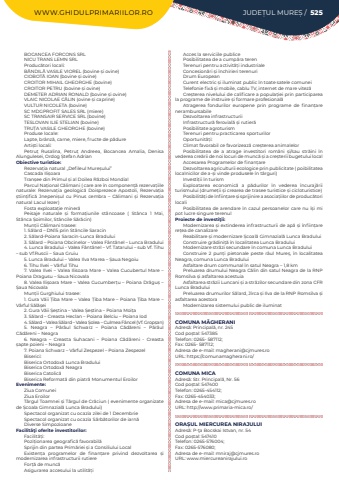 WWW.GHIDULPRIMARIILOR.RO JUDE%u021aUL MURE%u0218 / 525BOCANCEA FORCONS SRLNICU TRANS LEMN SRLProduc%u0103tori locali:B%u00c2NDIL%u0102 VASILE VIOREL (bovine %u0219i ovine)CIOBOT%u0102 IOAN (bovine %u0219i ovine)CROITOR MIHAIL GHEORGHE (bovine)CROITOR PETRU (bovine %u0219i ovine)DEMETER ADRIAN RONALD (bovine %u0219i ovine)VLAIC NICOLAE C%u0102LIN (ovine %u0219i caprine)VULTUR NICOLETA (bovine)SC MDGPROFIT SALES SRL (miere)SC TRANSAIR SERVICE SRL (bovine)TESLOVAN ILIE STELIAN (bovine)TRU%u021aA VASILE GHEORGHE (bovine)Produse locale:Lapte, br%u00e2nz%u0103, carne, miere, fructe de p%u0103dureArti%u0219ti locali: Petru%u021b Rusalina, Petru%u021b Andreea, Bocancea Amalia, Denisa Alungulesei, Ordog %u0218tefan AdrianObiective turistice:Rezerva%u021bia natural %u201eDefileul Mure%u0219ului%u201dCascada Ili%u0219oaraTran%u0219ee din Primul %u0219i al Doilea R%u0103zboi MondialParcul Na%u021bional C%u0103limani ( care are %u00een componen%u021b%u0103 rezerva%u021biile naturale: Rezerva%u021bia geologic%u0103 Doisprezece Apostoli, Rezerva%u021bia %u0219tiin%u021bific%u0103 Jnepeni%u0219ul cu Pinus cembra %u2013 C%u0103limani %u0219i Rezerva%u021bia natural Lacul Iezer)Fosta exploata%u021bie miner%u0103Peisaje naturale %u0219i forma%u021biunile st%u00e2ncoase ( St%u00e2nca 1 Mai, St%u00e2nca %u0218oimilor, St%u00e2ncile S%u0103r%u0103cin)Mun%u021bii C%u0103limani trasee:1. S%u0103lard %u2013 DN15 prin St%u00e2ncile Saracin2. S%u0103lard-Poiana Saracin-Lunca Bradului3. S%u0103lard %u2013 Poiana Obcinelor %u2013 Valea F%u00e2nt%u00e2nel %u2013 Lunca Bradului4. Lunca Bradului - Valea F%u00e2nt%u00e2nel %u2013 Vf. Tatarului %u2013 sub Vf. Tihu %u2013 sub Vf.Ruscii %u2013 Saua Gruiu5. Lunca Bradului %u2013 Valea Ilva Marea %u2013 %u0218aua Negoiu6. Tihu Ilvei %u2013 V%u00e2rful Tihu7. Valea Ilvei %u2013 Valea Ilisoara Mare %u2013 Valea Cucubertul Mare %u2013 Poiana Dragusu %u2013 Saua Nicovala8. Valea Ili%u0219oara Mare %u2013 Valea Cucumber%u021bu %u2013 Poiana Dr%u0103gu%u0219 %u2013 %u0218aua NicovalaMun%u021bii Gurghiului trasee:1. Gura V%u0103ii %u021aiba Mare %u2013 Valea %u021aiba Mare %u2013 Poiana %u021aiba Mare %u2013 V%u00e2rful S%u0103l%u0103%u0219ei2. Gura V%u0103ii %u0218e%u0219tina %u2013 Valea %u0218e%u0219tina %u2013 Poiana Moi%u021ba3. S%u0103lard %u2013 Creasta Heclan %u2013 Poiana Belciu %u2013 Poiana Iod4. S%u0103lard %u2013 Valea S%u0103lard %u2013 Valea %u0218olea %u2013 Culmea F%u00e2ncel (Vf. Grop%u0219an)5. Neagra %u2013 P%u00e2r%u00e2ul Schwarz %u2013 Poiana C%u0103d%u0103reni %u2013 P%u00e2r%u00e2ul C%u0103d%u0103reni %u2013 Neagra6. Neagra %u2013 Creasta Suhacani %u2013 Poiana C%u0103d%u0103reni - Creasta %u0219apte poieni %u2013 Neagra7. Poiana Schwarz %u2013 V%u00e2rful Zespezel %u2013 Poiana ZespezelBiserici:Biserica Ortodox%u0103 Lunca BraduluiBiserica Ortodox%u0103 NeagraBiserica Catolic%u0103Biserica Reformat%u0103 din piatr%u0103%u00a0Monumentul EroilorEvenimente:Ziua ComuneiZiua EroilorT%u00e2rgul Toamnei %u0219i T%u00e2rgul de Cr%u0103ciun ( evenimente organizate de %u0218coala Gimnazial%u0103 Lunca Bradului)Spectacol organizat cu ocazia zilei de 1 DecembrieSpectacol organizat cu ocazia S%u0103rb%u0103torilor de iarn%u0103 Diverse SimpozioaneFacilit%u00e3%u0163i oferite investitorilor:Facilit%u0103%u021bi:Pozi%u021bionarea geografic%u0103 favorabil%u0103Sprijin din partea Prim%u0103riei %u0219i a Consiliului LocalExisten%u021ba programelor de finan%u021bare privind dezvoltarea %u0219i modernizarea infrastructurii rutiereFor%u021b%u0103 de munc%u0103Asigurarea accesului la utilit%u0103%u021biAcces la serviciile publicePosibilitatea de a cump%u0103ra terenTerenuri pentru activit%u0103%u021bi industrialeConcesion%u0103ri %u0219i %u00eenchirieri terenuriDrum EuropeanCurent electric %u0219i iluminat public %u00een toate satele comuneiTelefonie fix%u0103 %u0219i mobile, cablu TV, internet de mare vitez%u0103Cre%u0219terea nivelului de calificare a popula%u021biei prin participarea la programe de instruire %u0219i formare profesional%u0103Atragerea fondurilor europene prin programe de finan%u021bare nerambursabileDezvoltarea infrastructuriiInfrastructur%u0103 ferovial%u0103 %u0219i rutier%u0103Posibilitate agroturismTerenuri pentru practicarea sporturilorOportunit%u0103%u021bi:Climat favorabil ce favorizeaz%u0103 cre%u0219terea animalelorPosibilitatea de a atrage investitori rom%u00e2ni %u0219i/sau str%u0103ini %u00een vederea cre%u0103rii de noi locuri de munc%u0103 %u0219i a cre%u0219terii bugetului localAccesarea Programelor de finan%u021bareDezvoltarea agriculturii ecologice prin publicitate ( poibilitatea localnicilor de a-%u0219i vinde produsele %u00een t%u00e2rguri)Investi%u021bii %u00een turismExploatarea economic%u0103 a p%u0103durilor %u00een vederea %u00eencuraj%u0103rii turismului (drume%u021bii %u0219i crearea de trasee turistice %u0219i cicloturistice)Posibilit%u0103%u021bi de %u00eenfiin%u021bare %u0219i sprijinire a asocia%u021biilor de produc%u0103tori locali Posibilitatea de arendare %u00een cazul persoanelor care nu %u00ee%u0219i mi pot lucre singure terenulProiecte de investi%u0163ii:Modernizarea %u0219i extinderea infrastructurii de ap%u0103 %u0219i %u00eenfiin%u021bare re%u021bea de canalizareReabilitare %u0219i modernizare %u0218coal%u0103 Gimnazial%u0103 Lunca BraduluiConstruire gr%u0103dini%u021b%u0103 %u00een localitatea Lunca BraduluiModernizare str%u0103zi secundare %u00een comuna Lunca BraduluiConstruire 2 pun%u021bi pietonale peste r%u00e2ul Mure%u0219, %u00een localitatea Neagra, comuna Lunca BraduluiAsfaltare drum communal %u00een satul Neagra %u2013 1,8 kmPreluarea drumului Neagra C%u0103lin din satul Neagra de la RNP Romsilva %u0219i asfaltarea acestuiaAsfaltarea str%u0103zii Luncani %u0219i a str%u0103zilor secundare din zona CFR Lunca BraduluiPreluarea drumurilor S%u0103lard, J%u00eerca %u0219i Ilva de la RNP Romsilva %u0219i asfaltarea acestora Modernizarea sistemului public de iluminatCOMUNA M%u0102GHERANIAdres%u0103: Principal%u0103