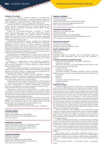 554 / JUDE%u021aUL NEAM%u021a WWW.GHIDULPRIMARIILOR.ROProiecte de investi%u0163ii:Dotarea cu mobilier, materiale didactice %u0219i echipamente digitale a unit%u0103%u021bii de %u00eenv%u0103%u021b%u0103m%u00e2nt %u2013 %u0219coala gimnazial%u0103 %u201cConstantin Virgil Gheorghiu%u201d, comuna%u00a0R%u0103zboieni, jude%u021bul Neam%u021b- 613.013 lei prin F-PNRR-dotari-2023-3033 %u00een stadiul de implementareAchizi%u021bia de dot%u0103ri %u0219i pardoseal%u0103%u00a0 sportiv%u0103%u00a0 de exterior pentru terenul de sport multifunc%u021bional din comuna R%u0103zboieni prin Agen%u021bia pentru Finan%u021barea Investitiilor Rurale (AFIR)- proiect finalizat- 99.227,80 leiLucr%u0103ri de consolidare-restaurare %u0219i punere %u00een valoare %u201cmonumentul eroilor c%u0103zu%u021bi %u00een lupta de la Valea Alb%u0103%u201d valoare total%u0103 eligibil%u0103 367.332,04 prin agentia pentru finan%u021barea investi%u021biilor rurale (AFIR). Acest proiect este finalizat! Interven%u021bia asupra patrimoniului istoric local arat%u0103 concret durabilitatea dintre popula%u021bia actual%u0103 %u0219i viitorAchizi%u021bionare echipament pentru activit%u0103%u021bi de %u00eentre%u021binerea mediului %u0219i a spa%u021biilor verzi %u00een cadrul UAT R%u0103zboieni- Programul Opera%u021bional pentru Pescuit %u0219i Afaceri Maritime 2014-2020 (POPAM) care avea ca %u0219i indicator de rezultat %u0219i sustenabilitate, angajarea de personal, din mediul defavorizat, practic prin acest program pe l%u00e2ng%u0103 finan%u021barea c%u00e2%u0219tigat%u0103, putem spune c%u0103 s-a oferit o perspectiv%u0103 popula%u021biei autohtone la un loc de munc%u0103! Proiect finalizat, Valoarea investitiei fiind de 260.510 leiAchizi%u021bionarea de echipamente %u0219i dot%u0103ri pentru SVSU din cadrul UAT R%u0103zboieni- prin Agen%u021bia pentru Finan%u021barea Investi%u021biilor Rurale (AFIR), valoarea eligibil%u0103 fiind de 24.064,94 euro. Proiect finalizat.Extindere %u0219i modernizare %u0218coala General%u0103%u00a0 Constantin Virgil Gheorghiu- Valoare total%u0103%u00a0 a investi%u021biei 1.688.074.66 lei prin Ministerul Dezvolt%u0103rii, Lucr%u0103rilor Publice %u0219i Administra%u021biei. Proiectul este finalizat.Cre%u0219terea eficien%u021bei energetice a infrastructurii de iluminat public %u00een comuna R%u0103zboieni, jude%u021bul Neam%u021b%u00a0finan%u021bat prin Agen%u021bia Fondului de Mediu, av%u00e2nd ca valoare total%u0103 de 1.025.832,78 lei. Acest proiect este stadiul de implementare.Modernizare drumuri s%u0103te%u0219ti comuna R%u0103zboieni, jude%u021bul Neam%u021b%u00a0, un proiect finan%u021bat prin Programul Na%u021bional de Investi%u021bii %u201cAnghel Saligny%u201d, in valoare de 7.990.022,64 f%u0103r%u0103 TVA, 10.328.526,1 lei cu TVA. Acest proiect tocmai se deruleaz%u0103.Proiecte pe care le dorim s%u0103%u00a0le implement%u0103m %u00een viitorul apropiat:Construirea unei capacit%u0103%u021bi de producere a energiei electrice din surse regenerabile %u00een vederea compens%u0103rii consumului propriu al u.a.t. R%u0103zboieni, %u00een comuna R%u0103zboieni, jude%u021bul Neam%u021b%u201d %u2013 %u00eencercarea finan%u021b%u0103rii prin ministerul energieiDezvoltarea infrastructurii educa%u021bionale %u00een cadrul %u0218colii Gimnaziale Constantin Virgil Gheorghiu, prin construire %u0219i dotare sal%u0103 de sport- prin POR Nord-est 2021-2027 PRIORITATEA 6 -Parte component%u0103%u00a0a ADI AquaNeam%u021b, parteneriat pentru dezvoltarea %u0219i creearea sistemului de distribu%u021bie a apei%u00cenfiin%u021bare sistem de distribu%u021bie gaze naturale de interes public jude%u021bean %u00een comunele %u0218tefan cel Mare, Dragomire%u0219ti, R%u0103zboieni, Bode%u0219ti Girov, Dobreni %u0219i G%u00e2rcina din Jude%u021bul Neam%u021b- Faza de proiect al%u0103turi de componen%u021bii Adi Metropolitan GAZ%u00cenfiin%u021bare sistem distribu%u021bie ap%u0103-canal Modernizarea Caminului Cultural %u201cSpiru Haret%u201d- R%u0103zboieniCOMUNA REDIUCod po%u0219tal: 617380Telefon: 0233-299020; Fax: 0233-299021; Adresa de e-mail: primaria_rediu@yahoo.comURL: www.rediu.roMUNICIPIUL ROMANAdres%u0103: Pia%u0163a Roman Vod%u0103, nr. 1; Cod po%u0219tal: 611022Telefon: 0233-741119, 741651; Fax: 0233-741604; Adresa de e-mail: primaria@primariaroman.roURL: www.primariaroman.roCOMUNA ROM%u00c2NIAdres%u0103: str. PrincipalaCod po%u0219tal: 617385Telefon: 0233-768925; Fax: 0233-768925; Adresa de e-mail: primaria@comunaromani.roURL: www.comunaromani.roORA%u0218UL ROZNOVAdres%u0103: Tineretului, nr. 663Cod po%u0219tal: 617390Telefon: 0233-665471; Fax: 0233-665435, 665241; Adresa de e-mail: roznov@primariaroznov.roURL: www.primariaroznov.roCOMUNA RUGINOASAAdres%u0103: Str. Principal%u0103, Nr. 569CCod po%u0219tal: 617183Telefon: 0233-761290; Fax: 0233-761288; Adresa de e-mail: primariaruginoasa2013@yahoo.comURL: http://primariaruginoasa.ro/Persoane din primarie:Primar: Miluc%u00a0Grigora%u0219Viceprimar: Costel%u00a0 Asaftei%u00a0Secretar General:%u00a0Dan Stelian%u00a0Tanas%u0103Contabil: Stelian G%u0103buroiSate %u00een administra%u021bie:Ruginoasa,Bozienii de SusSuprafa%u021ba:%u00a0 3030 ha; Intravilan:%u00a0 493 ha; Extravilan:%u00a0 2527 ha; Popula%u021bia:%u00a0 1925; Gospod%u0103rii:%u00a0 825; Locuin%u021be:%u00a0 948; Gr%u0103dini%u021be:%u00a0 1; %u0218coli:%u00a01; Activitati economice si specifice zonei:Agricultura de subzisten%u021b%u0103 - Gospod%u0103rii individualeCre%u015fterea animalelorAgricultura intensiv%u0103 - activitate desf%u0103%u015furat%u0103 pe raza comunei de un num%u0103r de 9 societ%u0103%u0163i agricoleConfec%u021bii textileComer%u021bul cu am%u0103nuntulCultivarea plantelor:%u00a0 cerealelor, plantelor tehnice, plantelor leguminoase %u015fi a plantelor produc%u0103toare de semin%u0163e oleagenoaseConstruc%u021biiBrut%u0103rieCablu TVTransport materiale de construc%u021biiConfec%u021bii metaliceService auto Obiective turistice:a. Biserica %u201cSf%u00e2ntul Nicolae%u201d - Ruginoasa - a f