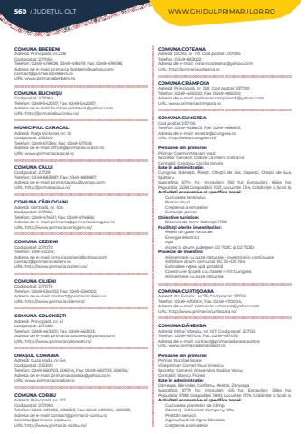 560 / JUDE%u021aUL OLT WWW.GHIDULPRIMARIILOR.ROCOMUNA BREBENIAdres%u0103: Principal%u0103, nr.228Cod po%u0219tal: 237055Telefon: 0249-419008, 0349-418419; Fax: 0249-419038; Adresa de e-mail: primaria_brebeni@yahoo.comcontact@primariabrebeni.roURL: www.primariabrebeni.roCOMUNA BUCINI%u015eUCod po%u0219tal: 237060Telefon: 0249-542057; Fax: 0249-542057; Adresa de e-mail: bucinisuprimaria@yahoo.comURL: http://primariabucinisu.ro/MUNICIPIUL CARACALAdres%u0103: Pia%u0163a Victoriei, nr. 10Cod po%u0219tal: 235200Telefon: 0249-511384; Fax: 0249-517518; Adresa de e-mail: office@primariacaracal.roURL: www.primariacaracal.roCOMUNA C%u0102LUICod po%u0219tal: 237291Telefon: 0349-883987; Fax: 0349-883987; Adresa de e-mail: primariacalui@yahoo.comURL: http://primariacalui.ro/COMUNA C%u00c2RLOGANIAdres%u0103: Central%u0103, nr. 104Cod po%u0219tal: 237065Telefon: 0249-474611; Fax: 0249-474666; Adresa de e-mail: primaria@primariacarlogani.roURL: http://www.primariacarlogani.ro/COMUNA CEZIENICod po%u0219tal: 237070Telefon: 349-412214; Adresa de e-mail: rimariacezieni@yahoo.comcontact@primariacezieni.ro URL: http://www.primariacezieni.ro/COMUNA CILIENICod po%u0219tal: 237075Telefon: 0249-534002; Fax: 0249-534002; Adresa de e-mail: contact@primariacilieni.roURL: http://www.primariacilieni.ro/COMUNA COLONE%u015eTIAdres%u0103: Principal%u0103, nr. 61Cod po%u0219tal: 237080Telefon: 0249-463001; Fax: 0249-463103; Adresa de e-mail: primaria.colonesti@yahoo.comURL: http://www.primariacolonesti.ro/ORA%u0218UL CORABIAAdres%u0103: Cuza Vod%u0103, nr. 54Cod po%u0219tal: 235300Telefon: 0249-560703, 506154; Fax: 0249-560703, 506154; Adresa de e-mail: primariacorabia@yahoo.comURL: www.primariacorabia.roCOMUNA CORBUAdres%u0103: Principal%u0103, nr. 217Cod po%u0219tal: 237090Telefon: 0249-481006, 480923; Fax: 0249-481006, 480923; Adresa de e-mail: contact@primaria-corbu.rosecretar@primaria-corbu.roURL: http://www.primaria-corbu.ro/COMUNA COTEANAAdres%u0103: DC 92, nr. 119; Cod po%u0219tal: 237095Telefon: 0349-883022; Adresa de e-mail: rimariacoteana@yahoo.comURL: http://primariacoteana.roCOMUNA CR%u00c2MPOIAAdres%u0103: Principal%u0103, nr. 128; Cod po%u0219tal: 237100Telefon: 0249-485020; Fax: 0249-485020; Adresa de e-mail: primariacrampoiaolt@yahoo.comURL: www.primariacrimpoia.roCOMUNA CUNGREACod po%u0219tal: 237105Telefon: 0249-468603; Fax: 0249-468603; Adresa de e-mail: ecretar@cungrea.roURL: http://www.cungrea.ro/Persoane din primarie:Primar: Cosmin Marian VladSecretar General: Dobre Carmen CristianaContabil: Condoiu Cecilia IonelaSate %u00een administra%u021bie:Cungrea, Ib%u0103ne%u015fti, Mie%u015fti, Ote%u015ftii de Jos, Cepe%u015fti, Ote%u015ftii de Sus, Sp%u0103taruSuprafa%u021ba:%u00a0 6714 ha; Intravilan:%u00a0 150 ha; Extravilan:%u00a0 6564 ha; Popula%u021bia:%u00a02538; Gospod%u0103rii:%u00a01013; Locuin%u021be:%u00a01314; Gr%u0103dini%u021be:%u00a04; %u0218coli:%u00a06; Activitati economice si specifice zonei:Cultivarea terenuluiPomicultur%u0103Cre%u015fterea animalelorExtrac%u0163ie petrol%u00a0Obiective turistice:Biserica de lemn Ib%u0103ne%u015fti 1785Facilit%u00e3%u0163i oferite investitorilor:Re%u0163ea de gaze naturaleEnergie electric%u0103Ap%u0103Acces la drum jude%u0163ean DJ 703C %u015fi DJ 703DProiecte de investi%u0163ii:Alimentare cu gaze naturale - investi%u0163ie %u00een continuareAsfaltare drum comunal DC 35+DC 194Extindere re%u0163ea ap%u0103 potabil%u0103Construire %u015ecoal%u0103 cu clasele I-VIII CungreaAlimentare cu gaze naturaleCOMUNA CURTI%u015eOARAAdres%u0103: str. Eroilor . nr.75; Cod po%u0219tal: 237115Telefon: 0249-470004; Fax: 0249-470004; Adresa de e-mail: primariacurtisoara@yahoo.comURL: http://www.primariacurtisoara.ro/COMUNA D%u0102NEASAAdres%u0103: Mihai Viteazu, nr. 157; Cod po%u0219tal: 237125Telefon: 0249-467016; Fax: 0249-467016; Adresa de e-mail: contact@primariadaneasaolt.roURL: www.primariadaneasaolt.roPersoane din primarie:Primar: Nicolae SoareViceprimar: Cornel Paul IonescuSecretar General: Alexandra Rodica VoicuContabil: Stanca FloreaSate %u00een administra%u021bie:D%u0103neasa, Berindei, Cioflanu, Pestra, Z%u0103noagaSuprafa%u021ba:%u00a0 5779 ha; Intravilan:%u00a0 415 ha; Extravilan:%u00a0 5364 ha; Popula%u021bia:%u00a05789; Gospod%u0103rii:%u00a01800; Locuin%u021be:%u00a01574; Gr%u0103dini%u021be:%u00a05; %u0218coli:%u00a04; Activitati economice si specifice zonei:Cultivarea plantelor de c%u00e2mpComer%u0163 - SC Select Company SRLPrest%u0103ri serviciiAgricultur%u0103 SC Agro D%u0103neasaCre%u015fterea animalelor