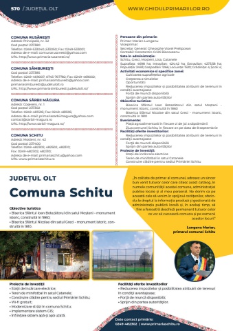 570 / JUDE%u021aUL OLT WWW.GHIDULPRIMARIILOR.ROCOMUNA RUS%u0102NE%u015eTIAdres%u0103: Principal%u0103, nr. 42Cod po%u0219tal: 237380Telefon: 0249-533040.,533050; Fax: 0249-533001; Adresa de e-mail: comunarusanesti@yahoo.comURL: http://www.primariarusanesti.ro/COMUNA S%u00c2MBURE%u015eTICod po%u0219tal: 237385Telefon: 0249-469007, 0745-767782; Fax: 0249-469002; Adresa de e-mail: primariasimburesti@yahoo.comprimariasimburesti@judetulolt.roURL: http://www.primariasimburesti.judetulolt.ro/COMUNA S%u00c2RBII M%u0102GURAAdres%u0103: Co%u0219ereni, nr. 1Cod po%u0219tal: 237302Telefon: 0249-481595; Fax: 0249-481595; Adresa de e-mail: primariasarbiimagura@yahoo.comcontact@sarbii-magura.roURL: http://www.sarbii-magura.ro/COMUNA SCHITUAdres%u0103: Mosteni, nr. 42Cod po%u0219tal: 237400Telefon: 0249-482302, 482502, 482310; Fax: 0249-482302, 482310; Adresa de e-mail: primariaschitu@yahoo.comURL: www.primariaschitu.roPersoane din primarie:Primar: Marian LunganuViceprimar:%u00a0Secretar General: Gheorghe Viorel PrelipceanContabil: Constantin Cristi BiscoveanuSate %u00een administra%u021bie:Schitu, Greci, Mo%u0219teni, Lisa, CataneleSuprafa%u021ba:%u00a0 4698 ha; Intravilan:%u00a0 424,42 ha; Extravilan:%u00a0 4273,58 ha; Popula%u021bia:%u00a02493; Gospod%u0103rii:%u00a01266; Locuin%u021be:%u00a01520; Gr%u0103dini%u021be:%u00a04; %u0218coli:%u00a04; Activitati economice si specifice zonei:Cultivarea suprafe%u021belor agricoleCre%u015fterea animalelorOportunit%u0103%u021biReducerea impozitelor %u0219i posibilitatea atribuirii de terenuri %u00een condi%u021bii avantajoaseFor%u021b%u0103 de munc%u0103 disponibil%u0103Sprijin din partea autorit%u0103%u021bilorObiective turistice:Biserica Sf%u00e2ntul Ioan Botez%u0103torul din satul Mo%u0219teni - monument istoric, construit%u0103 %u00een 1860Biserica Sf%u00e2ntul Nicolae din satul Greci - monument istoric, construit%u0103 %u00een 1810Evenimente:Pia%u021b%u0103 agroalimentar%u0103 %u00een fiecare zi de joi a s%u0103pt%u0103m%u00e2niiZiua comunei Schitu %u00een fiecare an pe data de 8 septembrieFacilit%u00e3%u0163i oferite investitorilor:Reducerea impozitelor %u015fi posibilitatea atribuirii de terenuri %u00een condi%u0163ii avantajoaseFor%u0163%u0103 de munc%u0103 disponibil%u0103 Sprijin din partea autorit%u0103%u0163ilorProiecte de investi%u0163ii:Sta%u021bii de %u00eenc%u0103rcare electriceTeren de minifotbal %u00een satul CataneleConstruire cl%u0103dire pentru sediul Prim%u0103riei Schitu