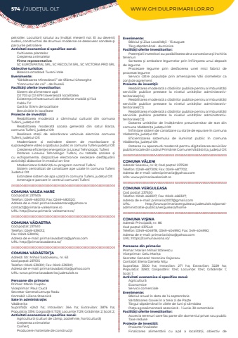 574 / JUDE%u021aUL OLT WWW.GHIDULPRIMARIILOR.ROpetrolier. Locuitorii satului au %u00eenv%u0103%u0163at meserii noi. Ei au devenit sudori, constructori de drumuri moderne ce deservesc sondele %u015fi parcurile petroliereActivitati economice si specifice zonei:Cultivarea plantelorCre%u015fterea animalelorFirme reprezentative:SC EUROSPATIAL SRL, SC RECOLTA SRL, SC VICTORIA PRD SRLObiective turistice:Biserica ortodox%u0103 Tureni-ValeEvenimente:%u201cS%u0103rb%u0103toarea M%u00eenec%u0103torii%u201d de Sf%u00e2ntul Gheorghe%u201cConcursul de cai%u201d - de RusaliiFacilit%u00e3%u0163i oferite investitorilor:Sistem de alimentare ap%u0103DJ 703 %u015fi DJ 679 traverseaz%u0103 localitateaExisten%u0163a infrastructurii de telefonie mobil%u0103 %u015fi fix%u0103Cablu TVGar%u0103 la 15 km de localitateBenzin%u0103rie %u00een localitateProiecte de investi%u0163ii:Reabilitarea moderat%u0103 a c%u0103minului cultural din comuna Tufeni, jude%u021bul OltReabilitarea moderat%u0103 %u0219coala general%u0103 din satul Barza, comuna Tufeni, jude%u021bul OltRealizare sta%u021bii de re%u00eenc%u0103rcare vehicule electrice comuna Tufeni, judetul OltModernizare %u0219i extindere sistem de monitorizare %u015fi supraveghere video a spa%u021biului public in comuna Tufeni jude%u021bul OltCre%u0219terea eficien%u021bei energetice la Liceul Tehnologic TufeniDotarea Liceului Tehnologic Tufeni, cu tablete %u0219colare %u0219i cu echipamente, dispozitive electronice necesare desf%u0103%u015fur%u0103rii activit%u0103%u0163ii didactice %u00een mediul on-lineModernizare Gr%u0103dini%u021b%u0103 cu program normal TufeniSistem centralizat de canalizare ape uzate %u00een comuna Tufeni Judetul OltExtindere sistem de apa uzat%u0103 %u00een comuna Tufeni, jude%u021bul OltAmenajare parcare %u00een centrul comunei TufeniCOMUNA VALEA MARECod po%u0219tal: 237505Telefon: 0249-480310; Fax: 0249-480320; Adresa de e-mail: primariavaleamare@yahoo.rocontact@primaria-valeamare.roURL: http://www.primaria-valeamare.ro/COMUNA V%u0102DASTRACod po%u0219tal: 237510Telefon: 0249-539012; Fax: 0249-539016; Adresa de e-mail: primariavadastra@yahoo.comURL: http://primariavadastra.ro/COMUNA V%u0102D%u0102STRI%u0162AAdres%u0103: Str. Mihail Sadoveanu, nr. 63Cod po%u0219tal: 237515Telefon: 0249-539301; Fax: 0249-539301; Adresa de e-mail: primariavadastrita@yahoo.comURL: www.primariavadastrita.judetulolt.roPersoane din primarie:Primar: Marin Ciupitu%u00a0Viceprimar:%u00a0Paul Ciuc%u0103%u00a0Secretar General:Lenu%u0163a RaduContabil: Liliana Stoenic%u0103%u00a0Sate %u00een administra%u021bie:V%u0103d%u0103stri%u0163aSuprafa%u021ba:%u00a0 4240 ha; Intravilan:%u00a0 364 ha; Extravilan:%u00a0 3876 ha; Popula%u021bia:%u00a03316; Gospod%u0103rii:%u00a01129; Locuin%u021be:%u00a01129; Gr%u0103dini%u021be:%u00a02; %u0218coli:%u00a02; Activitati economice si specifice zonei:Agricultur%u0103 (culturi de c%u00e2mp, zootehnie, horticultur%u0103)Cre%u015fterea animalelorComer%u0163Producere materiale de construc%u0163ii%u00a0Evenimente:B%u00e2lciul %u015fi Ziua Localit%u0103%u0163ii - 15 augustT%u00e2rg s%u0103pt%u0103m%u00e2nal - duminicaFacilit%u00e3%u0163i oferite investitorilor:Poten%u0163iali investitori au posibilitatea de a concesiona %u015fi %u00eenchiria terenuriSortarea %u015fi ambalare legumelor prin %u00eenfiin%u0163area unui depozit de legumeProcesare legume prin desfacerea unei mici fabrici de procesat legumeServicii c%u0103tre popula%u0163ie prin amenajarea V%u0103ii cismelelor ca zon%u0103 de agrementProiecte de investi%u0163ii:Reabilitarea moderat%u0103 a cl%u0103dirilor publice pentru a %u00eembun%u0103t%u0103%u021bi serviciile publice prestate la nivelul unit%u0103%u021bilor administrativteritoriale(C4)Reabilitarea moderat%u0103 a cl%u0103dirilor publice pentru a %u00eembun%u0103t%u0103%u021bi serviciile publice prestate la nivelul unit%u0103%u021bilor administrativteritoriale(C1)Reabilitarea moderat%u0103 a cl%u0103dirilor publice pentru a %u00eembun%u0103t%u0103%u021bi serviciile publice prestate la nivelul unit%u0103%u021bilor administrativteritoriale(C2)Dotarea unit%u0103%u021bilor de %u00eenv%u0103%u021b%u0103m%u00e2nt preuniversitar de stat din comuna V%u0103d%u0103stri%u021ba jude%u021bul Olt%u00cenfiin%u021bare sistem de canalizare cu sta%u021bie de epurare %u00een comuna V%u0103dastri%u021ba, jude%u021bul OltEficientizarea sistemului de iluminat public %u00een comuna V%u0103d%u0103stri%u021ba, jude%u021bul OltDotarea cu aparatur%u0103%u00a0modern%u0103%u00a0pentru digitalizarea serviciilor publice locale din cadrul Prim%u0103riei Comunei V%u0103d%u0103stri%u021ba, jude%u021bul%u00a0OltCOMUNA V%u0102LENIAdres%u0103: Soarelui, nr. 8; Cod po%u0219tal: 237520Telefon: 0249-487309; Fax: 0249-487702; Adresa de e-mail: valeniprimaria@yahoo.comURL: www.primariavaleniolt.roCOMUNA VERGULEASACod po%u0219tal: 237530Telefon: 0249-468327; Fax: 0249-468327; Adresa de e-mail: primaria2007@gmail.com URL: http://www.primariaverguleasa.judetulolt.ro/portaladministratie-publica/verguleasa/homeCOMUNA VI%u015eINAAdres%u0103: Principal%u0103, nr. 86Cod po%u0219tal: 237540Telefon: 0349-404978, 0349-404990; Fax: 349-404990; Adresa de e-mail: primariavisina@yahoo.comURL: https://comunavisina.ro/Persoane din primarie:Primar:%u00a0Marian Mihail St%u0103nescuViceprimar: Gelu Mari%u021baSecretar General: Veronica CojocaruContabil: Elena Daniela Ni%u0163uSuprafa%u021ba:%u00a0 3500 ha; Intravilan:%u00a0 271 ha; Extravilan:%u00a0 3229 ha; Popula%u021bia:%u00a0 3280; Gospod%u0103rii:%u00a0 1041; Locuin%u021be:%u00a0 1041; Gr%u0103dini%u021be:%u00a0 1; %u0218coli:%u00a01; Activitati economice si specifice zonei:Agricultur%u0103EconomiceServicii comercialeEvenimente:B%u00e2lciul anual %u00een data de 14 septembrieS%u0103rb%u0103toarea Goviei %u00een a treia zi de Pa%u015fteT%u00e2rgul s%u0103pt%u0103m%u00e2nal %u00een zilele de luni %u015fi s%u00e2mb%u0103taPia%u0163a agroalimentar%u0103 sezonier%u0103 - 1 iunie-30 octombrieFacilit%u00e3%u0163i oferite investitorilor:Acces l