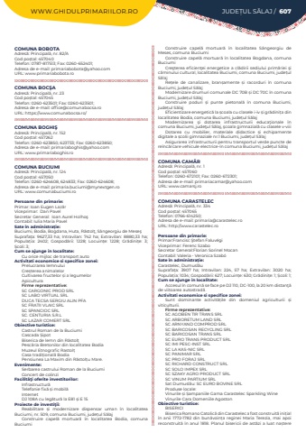WWW.GHIDULPRIMARIILOR.RO JUDE%u021aUL S%u0102LAJ / 607COMUNA BOBOTAAdres%u0103: Principal%u0103, nr. 82/ACod po%u0219tal: 457040Telefon: 0787-817513; Fax: 0260-652401; Adresa de e-mail: primariabobota@yahoo.comURL: www.primariabobota.roCOMUNA BOC%u015eAAdres%u0103: Principal%u0103, nr. 23Cod po%u0219tal: 457045Telefon: 0260-623501; Fax: 0260-623501; Adresa de e-mail: office@comunabocsa.roURL: https://www.comunabocsa.ro/COMUNA BOGHI%u015eAdres%u0103: Principal%u0103, nr. 152Cod po%u0219tal: 457262Telefon: 0260-623850, 623733; Fax: 0260-623850; Adresa de e-mail: primariaboghis@yahoo.comURL: www.primariaboghis.roCOMUNA BUCIUMIAdres%u0103: Principal%u0103, nr. 124Cod po%u0219tal: 457050Telefon: 0260-624608, 624833; Fax: 0260-624608; Adresa de e-mail: primaria.buciumi@mynextgen.roURL: www.comunabuciumi.roPersoane din primarie:Primar: Ioan Eugen Laz%u0103rViceprimar: %u00a0Dan PavelSecretar General: %u00a0Ioan Aurel Holho%u015fContabil: Iulia Maria PavelSate %u00een administra%u021bie:Buciumi, Bodia, Bogdana, Huta, R%u0103stol%u0163, S%u00e2ngeorgiu de Mese%u015fSuprafa%u021ba:%u00a0 9627,33 ha; Intravilan:%u00a0 742 ha; Extravilan:%u00a0 8880,33 ha; Popula%u021bia:%u00a0 2402; Gospod%u0103rii:%u00a0 1228; Locuin%u021be:%u00a0 1228; Gr%u0103dini%u021be:%u00a0 3; %u0218coli:%u00a03; Cum se ajunge in localitate:Cu orice mijloc de transport autoActivitati economice si specifice zonei:Prelucrarea lemnuluiCre%u0219terea animalelorCultivarea fructelor %u0219i a legumelorApiculturaFirme reprezentative:SC CARGONIC PROD SRLSC LABO VIRTUAL SRLDUCA TECSA SERGIU ALIN PFASC FRATII VLAIC SRLSC SPANCIOC SRLSC. CENTURIA S.R.L SC LAZAR COMERT SRLObiective turistice:Castrul Roman de la BuciumiCascada %u0218ipotBiserica de lemn din R%u0103stol%u021bPesc%u0103ria Bretonilor din localitatea BodiaMuzeul Etnografic Rastol%u021bCasa tradi%u021bional%u0103%u00a0Bodia Pensiunea La Maxim din R%u0103stol%u021bu Mare.Evenimente:Serbarea castrului Roman de la Buciumi Concert de colinziFacilit%u00e3%u0163i oferite investitorilor:Infrastructur%u0103Telefonie fix%u0103 %u0219i mobil%u0103InternetDJ 108A cu leg%u0103tur%u0103 la E81 %u0219i E 15Proiecte de investi%u0163ii:Reabilitare %u0219i modernizare dispensar uman %u00een localitatea Buciumi, nr. 509, comuna Buciumi, jude%u021bul S%u0103lajConstruire capel%u0103%u00a0 mortuar%u0103%u00a0 %u00een localitatea Bodia, comuna BuciumiConstruire capel%u0103 mortuar%u0103 %u00een localitatea S%u00e2ngeorgiu de Meses, comuna BuciumiConstruire capel%u0103 mortuar%u0103 %u00een localitatea Bogdana, comuna BuciumiCre%u015fterea eficien%u0163ei energetice a cl%u0103dirii sediului prim%u0103riei %u015fi c%u0103minului cultural, localitatea Buciumi, comuna Buciumi, jude%u021bul S%u0103lajRe%u021bele de canalizare, bran%u0219amente %u0219i racorduri %u00een comuna Buciumi, jude%u021bul S%u0103lajModernizare drumuri comunale DC 70B %u0219i DC 70C %u00een comuna Buciumi, jude%u021bul S%u0103lajConstruire poduri %u0219i punte pietonal%u0103 %u00een comuna Buciumi, jude%u021bul S%u0103lajEficientizare energetic%u0103 la %u0219coala cu clasele i-iv %u0219i gr%u0103dini%u021ba din localitatea Bodia, comuna Buciumi, jude%u021bul S%u0103lajModernizarea %u015fi dotarea infrastructurii educa%u0163ionale %u00een comuna Buciumi, jude%u0163ul S%u0103laj, %u015fcoala gimnazial%u0103 cu clasele v-viiiDotarea cu mobilier, materiale didactice %u0219i echipamente digitale a %u0219colii gimnaziale nr.1 Buciumi, jude%u021bul S%u0103lajAsigurarea infrastructurii pentru transportul verde puncte de re%u00eenc%u0103rcare vehicule electrice-%u00een comuna Buciumi, jude%u021bul S%u0103lajCOMUNA CAM%u0102RAdres%u0103: Principal%u0103, nr. 1Cod po%u0219tal: 457060Telefon: 0260-672101; Fax: 0260-672301; Adresa de e-mail: primariacamar@yahoo.comURL: www.camarsj.roCOMUNA CARASTELECAdres%u0103: Principal%u0103, nr. 334Cod po%u0219tal: 457065Telefon: 0766-614250; Adresa de e-mail: primaria@carastelec.roURL: http://www.carastelec.roPersoane din primarie:Primar:Francisc %u015etefan Faluv%u00e9gi%u00a0Viceprimar: Ferenc Szabo%u00a0Secretar General:Florian Sorinel MocanContabil: Valeria - Veronica Szab%u00f3%u00a0Sate %u00een administra%u021bie:Carastelec, Dumusl%u0103uSuprafa%u021ba:%u00a0 3907 ha; Intravilan:%u00a0 224, 57 ha; Extravilan:%u00a0 3020 ha; Popula%u021bia:%u00a01034; Gospod%u0103rii:%u00a0627; Locuin%u021be:%u00a0630; Gr%u0103dini%u021be:%u00a01; %u0218coli:%u00a01; Cum se ajunge in localitate:Accesul %u00een comun%u0103 se face pe DJ 110, DC-100, la 20 km distan%u0163%u0103 de viitoarea autostrad%u0103.Activitati economice si specifice zonei:Sunt dominante activit%u0103%u021bile din domeniul agriculturii %u0219i viticulturii.Firme reprezentative:SC AGOBEN TIR TRANS SRLSC ARBORETUM LAND SRLSC ARNYAND COMPROD SRLSC BARICOSAN RECYCLING SRLSC BARICOSAN TRANS SRLSC EURO TRANS PRODUCT SRLSC IMI PESC-INST SRLSC LA KAS-NIC SRLSC PANIMAR SRLSC PRO FORAJ SRLSC RICHARD CONSTRUCT SRLSC SOLO IMPEX SRLSC SZAKY AGRO PRODUCT SRLSC VINUM PARTIUM SRLSat Dumusl%u0103u: SC EURO BOVINE SRLProduse locale:Vinurile %u0219i %u0218ampaniile Gama Carastelec Sparkling Wine Vinurile Cara Domeniile AgostonObiective turistice:BISERICIBiserica Romano Catolic%u0103 din Carastelec a fost construit%u0103 ini%u021bial %u00een anii 1772-1782 din bun%u0103voin%u021ba reginei Maria Terezia, mai apoi reconstruit%u0103 %u00een anul 1818. Planul bisericii de ast%u0103zi a luat na%u0219tere