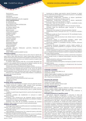 616 / JUDE%u021aUL S%u0102LAJ WWW.GHIDULPRIMARIILOR.ROPomiculturaCre%u0219terea animalelorApiculturaIndustria Panifica%u021bieiIndustria prelucr%u0103rii uleiurilor vegetaleFirme reprezentative:SC ORTOS SRLSC SANDANA SRLIMD HORTICULTURE SYSTEMS SRLCRISCURAGE SRLSC CRINUL BAGUT SRL.Produc%u0103tori locali:BOHA IULIANCHIS MARIUS VASILEGAVRILAS OVIDIUFERENT GAVRILSAV ONISIMGUDEA MARIA VIORICACOLCER LAVINIUVARGA CIPRIANBAGUT IOANDOMOKOS BALLASDOMOKOS VASILEKRETZ NORBERT.Produse locale:LEGUME, FRUCTE, PRODUSE LACTATE, PRODUSE DE PANIFICATIE, S%u0102PUNMe%u0219te%u0219ugari: RADA TORJE VIORICA,GABOR ALINAObiective turistice:Traseul Valea Ragului Poiana Stirciu este situat la ie%u0219irea din satul Stirciu spre satul Buciumi. Acest traseu este cunoscut %u00een istorie fiind cea mai facil%u0103%u00a0trecere spre podi%u0219ul Transilvaniei, motiv pentru care armatele rom%u00e2ne %u0219i-au instalat o parte a trupelor sale %u00een vecin%u0103tate, la Buciumi..%u00cen prezent Valea Ragului este de o frumuse%u021be deosebit%u0103, de o parte %u0219i de cealalt%u0103%u00a0fiind %u00eenconjurat%u0103%u00a0de dealuri gola%u0219e sau de dealuri acoperite de p%u0103duri de foioase %u0219i conifere.F%u00eentana leacurilor %u0219i M%u0103n%u0103stirea din Poiana StirciuDeasemenia %u00een Poiana ar fi fost o m%u0103n%u0103stire numit%u0103%u00a0m%u0103n%u0103stirea Meses,aceasta fiind atestat%u0103%u00a0documntar %u00een sec. XI-XII. Pe vechea loca%u021bie sa construit o bisericu%u021b%u0103%u00a0de lemn iar %u00een apropiere este un izvor binef%u0103c%u0103tor numit %u201cF%u00e2nt%u00e2na Leacurilor%u201d sau %u201cIzvorul Ingerulu.Pescaria %u201cLA IC%u201d Seredeiu. SC VISUL MEU PONITA - Cresc%u0103ctoria de Capre de la Hurez (Ponita)Evenimente:Hramu bisericilor din comun%u0103Zilele comunei %u00een prima duminic%u0103%u00a0din luna IulieAlergare pe MesesZiua EroilorFacilit%u00e3%u0163i oferite investitorilor:Accesul rutier facil dinspre %u0219i %u00eenspre comuna datorit%u0103%u00a0situ%u0103rii pe traseul drumului jude%u021bean 108G aceasta fiind principala arter%u0103%u00a0de circula%u021bie rutier%u0103%u00a0de pe teritoriul comunei.Comuna prezint%u0103%u00a0 o serie de caracteristici de cadru natural, sociale %u0219i culturale %u0219i de infrastructur%u0103, care ar putea favoriza turismulTradi%u021bie %u00een%u00a0practicarea legumiculturii, pomiculturii,agriculturii %u0219i zootehnieiExisten%u021ba unit%u0103%u021bilor de %u00eenv%u0103%u021b%u0103m%u00e2nt %u00een comun%u0103%u00a0 %u0219i cadre didactice titulareExisten%u021ba unei infrastructuri de s%u0103n%u0103tate pentru locuitorii comunei deservite de un medic de familie %u0219i un asistent medicalExisten%u021ba unui cabinet stomatologicExisten%u021ba unei case de tip familial, finan%u021bat%u0103%u00a0 de consiliul Jude%u021bean S%u0103laj, unde sunt caza%u021bi 12 copii institu%u021bionaliza%u021biProiecte de investi%u0163ii:Amenajare teren sportiv multifunc%u021bional %u00een localitatea Horoatu Crasnei, UAT Horoatu CrasneiAmenajare teren sportiv multifunc%u021bional %u00een localitatea Stirciu, UAT Horoatu Crasnei%u00cembun%u0103t%u0103%u021birea infracstructurii TIC, sistemice pentru educa%u021bie la %u0219colile din Comuna Horoatu CrasneiExtindere modernizare %u0219i dotare dispensar uman %u00een localitatea Horoatu Crasnei, comuna Horoatu Crasnei, Jude%u021bul S%u0103laj%u00cenfin%u021bare trei parcuri de joac%u0103%u00a0%u00een localit%u0103%u021biile Horoatu Crasnei, Stirciu , HurezConstruire %u0219i dotare cas%u0103%u00a0 pentru servicii funerare cu spa%u021bii tehnice aferente premerg%u0103tor ceremoniei funerare %u00een localitatea Stirciu, Comuna Horotau CrasneiReabilitare, modernizare, extindere %u0219i dotare a%u0219ez%u0103m%u00e2nt Cultural sat Stirciu,comuna Horoatu CrasneiReabilitare, modernizare, extindere %u0219i dotare a%u0219ez%u0103m%u00e2nt Cultural sat Hurez ,comuna Horoatu CrasneiExtindere re%u021bea de alimentare cu ap%u0103%u00a0 %u00een localitatile Hurez, Seredeiu, Comuna Horoatu CrasneiRe%u021bea de canalizare menajer%u0103%u00a0%u00een Comuna Horoatu Crasnei%u00cenfin%u021bare re%u021bea de distribu%u021bie gaze naturale %u00een Comuna Horoatu CrasneiConstruire Cinci poduri %u00een Comuna Horoatu CrasneiModernizare Drum Comunal DC 70 C %u00een Comuna Horoatu CrasneiRealizare pode%u021b%u00a0pe Drum Comunal DC 79, localitatea Hurez, Comuna Horoatu CrasneiModernizare re%u021bele de drumuri de interes local %u00een Comuna Horoatru CrasneiConstruire poduri %u00een localitateea Seredeiu, peste valea Seredenca %u0219i %u00een localitatea Stirciu, peste valea SatuluiConstruire Capel%u0103%u00a0 %u00een Localitatea Horoatu Crasnei, Comuna Horoatu CrasneiCre%u0219terea Eficien%u021bei Energetice, pentru cl%u0103diri publice la obiectivul de investi%u021bie gr%u0103dini%u021ba cu program normal, Comuna Horoatu CrasneiModernizare Drumuri Comunale %u00een Comuna Horoatu CrasneiProiect reabilitare moderata %u0219i cre%u0219tere a eficien%u021bei energetice pentru cl%u0103diea primariei Horoatu Crasnei %u00een vederea %u00eembun%u0103t%u0103%u021birii serviciile publice prestateProiect reabilitare moderat%u0103%u00a0%u0219i cre%u0219tere a eficien%u021bei energetice pentru %u0219coala Hurez %u00een vederea %u00eembun%u0103t%u0103%u021birii serviciilor publice prestateDigi Rural pentru comuna Horoatu CrasneiCentru Comunitar IntegratAsigurarea Infrastructurii pentru transportul verde %u00een Comuna Horoatu CrasneiCresterea eficien%u021bei energetice a infrastructurii de iluminat public %u00een Comuna Horoatu CrasneiCOMUNA ILEANDAAdres%u0103: Str. 1 Decembrie 1918, Nr. 43Cod po%u0219tal: 457190Telefon: 0260-648607, 648996; Fax: 0260-648607; Adresa de e-mail: prim.ileanda@gmail.comURL: http://comunaileanda.roPersoane din primarie:Primar: D%u0103nu%u021b Ioan PopViceprimar: Eugen C%u0103l%u0103ceanSecretar General: Valerian Marius Laz%u0103rContabil: Cristina Paula PopSate %u00een administra%u021bie:Ileanda, Podi%u015fu, Rogn