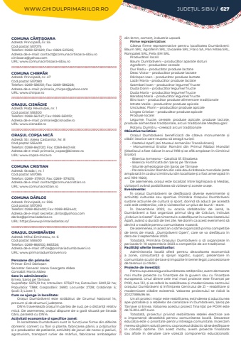 WWW.GHIDULPRIMARIILOR.RO JUDE%u021aUL SIBIU / 627COMUNA C%u00c2R%u0162I%u015eOARAAdres%u0103: Principal%u0103, nr. 55Cod po%u0219tal: 557075Telefon: 0269-521620; Fax: 0269-521505; Adresa de e-mail: contact@comunacirtisoara-sibiu.rocirtisoara@yahoo.comURL: www.comunacirtisoara-sibiu.roCOMUNA CHIRP%u0102RAdres%u0103: Principal%u0103, nr. 47Cod po%u0219tal: 557080Telefon: 0269-586101; Fax: 0269-586228; Adresa de e-mail: primaria_chirpar@yahoo.comURL: www.chirpar.roORA%u0218UL CISN%u0102DIEAdres%u0103: Pia%u0163a Revolu%u0163iei, nr. 1Cod po%u0219tal: 555300Telefon: 0269-561147; Fax: 0269-561012; Adresa de e-mail: primarie@cisnadie.roURL: www.cisnadie.roORA%u0218UL COP%u015eA MIC%u0102Adres%u0103: Str. Aleea Castanilor, Nr. 8Cod po%u0219tal: 555400Telefon: 0269-840120; Fax: 0269-840149; Adresa de e-mail: primaria_copsa@birotec.roURL: www.copsa-mica.roCOMUNA CRISTIANAdres%u0103: Strada I, nr. 1Cod po%u0219tal: 557085Telefon: 0269- 579101; Fax: 0269- 579215; Adresa de e-mail: contact@comunacristian.roURL: www.comunacristian.roCOMUNA D%u00c2RLOSAdres%u0103: Principal%u0103, nr. 596Cod po%u0219tal: 557090Telefon: 0269-852400; Fax: 0269-852440; Adresa de e-mail: secretar_dirlos@yahoo.comdarlos@primariadarlos.roURL: https://www.primariadarlos.ro/ORA%u0218UL DUMBR%u0102VENIAdres%u0103: Mihai Eminescu, nr. 6Cod po%u0219tal: 555500Telefon: 0269-866100, 865326; Adresa de e-mail: office@primariadumbraveni.roURL: www.primariadumbraveni.roPersoane din primarie:Primar: Emil%u00a0D%u00e2rlo%u0219anSecretar General: Ioana Georgeta AldeaContabil: Maria%u00a0AldeaSate %u00een administra%u021bie:Ernea, %u015earo%u015f pe T%u00e2rnavaSuprafa%u021ba:%u00a05575,19 ha; Intravilan:%u00a0573,67 ha; Extravilan:%u00a05001,52 ha; Popula%u021bia:%u00a0 7388; Gospod%u0103rii:%u00a0 2690; Locuin%u021be:%u00a0 2728; Gr%u0103dini%u021be:%u00a0 5; %u0218coli:%u00a03; Licee:%u00a01; Cum se ajunge in localitate:Ora%u0219ul Dumbr%u0103veni este str%u0103b%u0103tut de%u00a0 Drumul Na%u021bional 14, precum %u0219i de drumuri jude%u021bene. DN14%u00a0traverseaz%u0103 ora%u0219ul %u00een partea de sud, pe o distan%u021b%u0103 relativ mic%u0103. De asemenea, ora%u0219ul dispune de o gar%u0103 situat%u0103 pe Strada G%u0103rii, paralel%u0103 cu DN14.Activitati economice si specifice zonei:%u00cen localitatea Dumbr%u0103veni sunt %u00een func%u021biune firme din diferite domenii: comer%u021b cu flori %u0219i plante, fabricarea p%u00e2inii, a pr%u0103jiturilor %u0219i a produselor de patiserie, activit%u0103%u021bi de jocuri de noroc %u0219i pariuri, agroturism, transport rutier de m%u0103rfuri, fabricarea ambalajelor din lemn, comer%u021b, industrie u%u0219oar%u0103.Firme reprezentative:C%u00e2teva firme reprezentative pentru localitatea Dumbr%u0103veni: Baum SRL; Agroferm SRL; Izvoarele SRL; Flaro SA, Pan Mitea SRL, Rompalet SRL; Felix EM SRL Produc%u0103tori locali:Baum Dumbr%u0103veni %u2013 produc%u0103tor aparate sloturiAgroferm %u2013 produc%u0103tor cerealeDur Radu %u2013 produc%u0103tor produse lactateDeac Victor %u2013 produc%u0103tor produse lactateD%u00e2rlo%u0219an Ioan %u2013 produc%u0103tor produse lactateLaz%u0103r Maria - produc%u0103tor produse lactateSzambati Ioan %u2013 produc%u0103tor legume/ fructeDuda Dorin %u2013 produc%u0103tor legume/ fructe Duda Maria %u2013 produc%u0103tor legume/ fructeBaraba%u0219 Maria %u2013 produc%u0103tor legume/ fructeBiro Ioan %u2013 produc%u0103tor produse alimentare tradi%u021bionaleIstrate Vasile %u2013 produc%u0103tor produse apicoleUnciuleac Florin %u2013 produc%u0103tor produse apicoleLingea Cristian %u2013 produc%u0103tor produse apicoleProduse locale:Legume, fructe, cereale, produse apicole, produse lactate, produse alimentare tradi%u021bionale, arcuri tradi%u021bionale Me%u0219te%u0219ugari: Rotariu Dumitru %u2013creeaz%u0103 arcuri tradi%u021bionaleObiective turistice:Ora%u0219ul Dumbr%u0103veni beneficiaz%u0103 de c%u00e2teva monumente %u0219i cl%u0103diri istorice care reu%u0219esc s%u0103 atrag%u0103 turi%u0219ti:-%u00a0Castelul Apafi (azi Muzeul Armenilor Transilv%u0103neni)-%u00a0 Monumentul Eroilor Rom%u00e2ni din Primul R%u0103zboi Mondial (Obeliscul a fost ridicat %u00een anul 1918 %u0219i se afl%u0103 amplasat %u00een Cimitirul Eroilor)-%u00a0Biserica Armeano %u2013 Catolic%u0103 Sf. Elisabeta-%u00a0Biserica Fortificat%u0103 din %u0218aro%u0219 pe T%u00e2rnave-%u00a0Siturile arheologice din %u0218aro%u0219 pe T%u00e2rnave-%u00a0Parcela Eroilor Rom%u00e2ni din cele dou%u0103 r%u0103zboaie mondiale%u00a0(este amplasat%u0103 %u00een cadrul cimitirului din localitate %u0219i a fost amenajat%u0103 %u00een anii 1919-1920). De asemenea, ora%u0219ul este localizat %u00eentre Sighi%u0219oara %u0219i Media%u0219, vizitatorii av%u00e2nd posibilitatea s%u0103 viziteze %u0219i aceste ora%u0219e.Evenimente:%u00cen ora%u0219ul Dumbr%u0103veni se desf%u0103%u0219oar%u0103 diverse evenimente %u0219i activit%u0103%u021bi culturale sau sportive. Prim%u0103ria Ora%u0219ului Dumbr%u0103veni sus%u021bine ac%u021biunile de cultur%u0103 %u0219i sport, dorind s%u0103 aduc%u0103 pe aceast%u0103 cale at%u00e2t cet%u0103%u021benilor, c%u00e2t %u0219i vizitatorilor un plus de bun%u0103 %u2013 stare.%u00cen Decembrie 2022, cu ocazia s%u0103rb%u0103torilor de iarn%u0103, la Dumbr%u0103veni a fost organizat primul t%u00e2rg de Cr%u0103ciun, intitulat ,,Cr%u0103ciun la Castel%u201d. Evenimentul s-a desf%u0103%u0219urat %u00een curtea Castelului Apafi, av%u00e2nd o durat%u0103 de trei zile. Ne dorim ca acest eveniment s%u0103 devin%u0103 o tradi%u021bie pentru comunitatea noastr%u0103.De asemenea, %u00een acest an o s%u0103 fie organizat%u0103 prima competi%u021bie de tenis de mas%u0103, ,,Dumbr%u0103veni Open%u201d, care se va desf%u0103%u0219ura %u00een data de 2 septembrie 2023. Totodat%u0103, Prim%u0103ria Ora%u0219ului Dumbr%u0103veni o s%u0103 organizeze %u00een perioada 9- 10 septembrie 2023 o competi%u021bie de arc tradi%u021bional.Facilit%u00e3%u0163i oferite investitorilor:Administra%u021