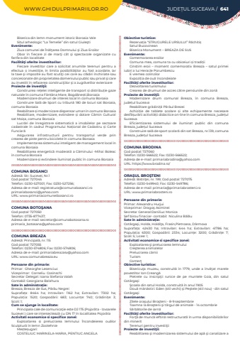 WWW.GHIDULPRIMARIILOR.RO JUDE%u021aUL SUCEAVA / 641Biserica din lemn monument istoric Boroaia ValeSitul arheologic %u201cLa Temelie%u201d din satul Giule%u015ftiEvenimente:Ziua comunei de %u00cen%u0103l%u0163area Domnului %u015fi Ziua EroilorObor %u00een fiecare zi de mar%u0163i%u00a0 c%u00e2t %u015fi spectacole organizate cu fanfara din localitateFacilit%u00e3%u0163i oferite investitorilor:Fiecare investitor care a solicitat anumite terenuri pentru a efectua o investi%u0163ie, %u00een limita posibilit%u0103%u0163ilor au fost acordate, iar la taxe %u015fi impozite au fost scuti%u0163i cei care au cl%u0103diri %u00eenchiriate sau concesionate din proprietatea domeniului public sau privat %u015fi care au investit %u00een refacerea construc%u0163iilor %u015fi a zugr%u0103velilor exterioareProiecte de investi%u0163ii:Construirea re%u021belei inteligente de transport %u0219i distribu%u021bie gaze naturale %u00een comuna F%u00e2nt%u00e2na Mare, Bogd%u0103ne%u0219ti,BoroaiaModernizare drumuri de interes local %u00een comuna BoroaiaConstruire Sal%u0103 de Sport cu tribun%u0103%u00a0180 de locuri sat Boroaia, comuna BoroaiaReabilitare %u0219i modernizare dispensar uman %u00een comuna BoroaiaReabilitare, modernizare, extindere %u0219i dotare C%u0103min Cultural sat Moi%u0219a, comuna BoroaiaLucr%u0103ri de %u00eenregistrare sistematic%u0103 a imobilelor pe sectoare cadastrale %u00een cadrul Programului Na%u021bional de Cadastru %u0219i Carte Funciar%u0103Asigurarea infrastructurii pentru transportul verde prin crearea de piste pentru biciclete %u00een comuna BoroaiaImplementarea sistemului inteligent de management local %u00een comuna BoroaiaReabilitarea energetic%u0103 moderat%u0103 a C%u0103minului -Mihai Boleac %u00een comuna BoroaiaModernizare %u0219i extindere iluminat public %u00een comuna BoroaiaCOMUNA BOSANCIAdres%u0103: Str. Sucevei, Nr.1Cod po%u0219tal: 727045Telefon: 0230-527001; Fax: 0230-527256; Adresa de e-mail: registratura@comunabosanci.roprimariabosanci@yahoo.comURL: www.primariacomuneibosanci.roCOMUNA BOTO%u015eANACod po%u0219tal: 727050Telefon: 0735-877437; Adresa de e-mail: secretar@comunabotosana.roprimaria_botosana@yahoo.comCOMUNA BREAZAAdres%u0103: Principal%u0103, nr. 115Cod po%u0219tal: 727055Telefon: 0230-574806; Fax: 0230-574806; Adresa de e-mail: primariabreazasv@yahoo.comURL: www.comunabreaza.euPersoane din primarie:Primar:%u00a0 Gheorghe%u00a0Lesenciuc%u00a0Viceprimar:%u00a0 Corneliu%u00a0%u00a0Cosinschi%u00a0Secretar Delegat: Ioana Stefania ValahContabil: Georgiana%u00a0BalahuraSate %u00een administra%u021bie:Breaza, Breaza de Sus, P%u00e2r%u00e2u NegreiSuprafa%u021ba:%u00a0 8464 ha; Intravilan:%u00a0 1162 ha; Extravilan:%u00a0 7302 ha; Popula%u021bia:%u00a0 1520; Gospod%u0103rii:%u00a0 683; Locuin%u021be:%u00a0 740; Gr%u0103dini%u021be:%u00a0 3; %u0218coli:%u00a01; Cum se ajunge in localitate:Principala cale de comunica%u0163ie este DJ 175 (Pojor%u00e2ta - Izvoarele Sucevei ) care se intersecteaz%u0103 cu DN 17 %u00een localitatea Pojor%u00e2taActivitati economice si specifice zonei:Exploatarea %u0219i prelucrarea lemnului %u00cencondeierea ou%u0103lor Sculptur%u0103 %u00een lemn ZootehnieMe%u0219te%u0219ugari: COSTELIUC MARINELA-MARIA, PENTIUC ANGELAObiective turistice:Rezerva%u021bia %u201cSTRUGURELE URSULUI%u201d R%u0103chiti%u0219Satul BucovineanBiserica Monument %u2013 BREAZA DE SUSEvenimente:Comemorarea eroilorComuna mea, comuna ta cu obiceiuri %u0219i tradi%u021biiCinstim eroii %u2013 moment comemorativ Breaza %u2013 satul primei iubiri a lui Heracle PorumbescuE vremea colinzilor Expozi%u021bia de ou%u0103 %u00eencondeiateFacilit%u00e3%u0163i oferite investitorilor:Dezvoltarea turismului Crearea de drumuri de acces c%u0103tre pensiunile din zon%u0103Proiecte de investi%u0163ii:Modernizare drum comunal Breaza, %u00een comuna Breaza, jude%u021bul SuceavaReabilitare gr%u0103dini%u021b%u0103 P%u00e2r%u00e2ul BrezeiAchizi%u021bie de tablete %u0219colare %u0219i alte echipamente necesare desf%u0103%u0219ur%u0103rii activit%u0103%u021bii didactice on-line %u00een comuna Breaza, jude%u021bul SuceavaEficientizarea sistemului de iluminat public din comuna Breaza, jude%u021bul SuceavaConstruire sal%u0103%u00a0de sport %u0219colar%u0103 din sat Breaza, nr.139, comuna Breaza, jude%u021bul SuceavaCOMUNA BRODINACod po%u0219tal: 727060Telefon: 0230-566522; Fax: 0230-566522; Adresa de e-mail: primariabrodina@yahoo.comURL: https://www.brodina.ro/ORA%u0218UL BRO%u015eTENIAdres%u0103: Bistri%u0163ei, nr. 199; Cod po%u0219tal: 727075Telefon: 0230-549940; Fax: 0230-549786; Adresa de e-mail: primaria@primariabrosteni.roURL: www.primariabrosteni.roPersoane din primarie:Primar:%u00a0Alexandru Hurjui%u00a0Viceprimar: Drago%u015f%u00a0AsimineiSecretar General:Daniliuc Monica%u00a0%u0218ef birou finaciar- contabil:%u00a0%u00a0Niculina B%u0103l%u0103u%u00a0Sate %u00een administra%u021bie:Cot%u00e2rga%u015fi, Holda, Holdi%u0163a, Frasin,Pietroasa, D%u00e2rmoxaSuprafa%u021ba:%u00a0 42430 ha; Intravilan:%u00a0 644 ha; Extravilan:%u00a0 41786 ha; Popula%u021bia:%u00a0 6300; Gospod%u0103rii:%u00a0 2334; Locuin%u021be:%u00a0 3200; Gr%u0103dini%u021be:%u00a0 7; %u0218coli:%u00a05; Licee:%u00a01; Activitati economice si specifice zonei:Exploatarea %u015fi prelucrarea lemnuluiCre%u015fterea animalelorPrelucrarea c%u0103rniiTurismComer%u0163Obiective turistice:Bisericu%u0163a muzeu, construit%u0103 %u00een 1779, unde a %u00eenv%u0103%u0163at marele povestitor Ion Creang%u0103Pietrele cu inscrip%u0163ii runice de pe muntele Goia, din satul Cot%u00e2rga%u015fi%u015ecoala din satul Holda, construit%u0103 %u00een anul 1905Dou%u0103 m%u0103n%u0103stiri: Eden (stil vechi) %u015fi Pe%u015ftele (stil nou) - din satul Cot%u00e2rga%u015fiEvenimente:Zilele ora%u015fului Bro%u015fteni - 8-9 septembrieToamna la Bro%u015fteni %u015fi t%u00e2rgul de animale - 14 octombrieS%u0103rb%u0103torile de iarn%u0103Facilit%u00e3%u0163i oferite investitorilor:For%u0163%u0103 de munc%u0103 ieftin%u0103 restructurat%u0103 %u