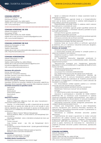 652 / JUDE%u021aUL SUCEAVA WWW.GHIDULPRIMARIILOR.ROCOMUNA H%u00c2RTOPAdres%u0103: Principal%u0103, nr. 128Cod po%u0219tal: 727449Telefon: 0230-545111; Fax: 0230-545111; Adresa de e-mail: primariahartop@yahoo.comURL: comunahartop.roCOMUNA HORODNIC DE JOSAdres%u0103: Principal%u0103, nr. 115Cod po%u0219tal: 727301Telefon: 0230-415110; Fax: 0230-415260; Adresa de e-mail: primaria_horodnicdejos@yahoo.comURL: www.horodnicdejos.roCOMUNA HORODNIC DE SUSAdres%u0103: str.Principala .nr. 1434Cod po%u0219tal: 727305Telefon: 0330131290; Adresa de e-mail: comunahorodnicdesus@yahoo.comURL: http://horodnicdesus.ro/COMUNA HORODNICENIAdres%u0103: F%u0103lticenilor, nr. 475Cod po%u0219tal: 727310Telefon: 0230-545736; Fax: 0230-573642; Adresa de e-mail: primariahorodniceni@yahoo.comhorodniceni@prefecturasuceava.roURL: www.comunahorodnicenisv.roPersoane din primarie:Primar: Neculai FloreaViceprimar: Constantin Neam%u0163uSecretar General: Luiza Maria MitrofanContabil: Ovidiu CimbruSate %u00een administra%u021bie:Horodniceni, Bote%u015fti, Br%u0103d%u0103%u0163el, Rotop%u0103ne%u015fti,%u00a0Mih%u0103ie%u015ftiSuprafa%u021ba:%u00a05707,56 ha; Intravilan:%u00a01046,80 ha; Extravilan:%u00a04660,76 ha; Popula%u021bia:%u00a03345; Gospod%u0103rii:%u00a01250; Locuin%u021be:%u00a01250; Gr%u0103dini%u021be:%u00a06; %u0218coli:%u00a06; Activitati economice si specifice zonei:Agricultur%u0103ZootehniePomicultur%u0103Prelucrarea lapteluiPiscicultur%u0103Comer%u0163Obiective turistice:Turism religios:Biserica Pogor%u00e2rea Sf%u00e2ntului Duh din satul Horodniceni - monument istoric (anul 1538)%u00a0Zvoni%u0163a - %u00een curtea bisericii se afl%u0103 o clopotni%u0163%u0103 de tip zvoni%u0163%u0103 format%u0103 dintr-un perete din st%u00e2lpi de zid cu trei arcade %u00een care at%u00e2rn%u0103 clopotele. Ea a fost construit%u0103 %u00een secolul al XIX-lea av%u00e2nd codul SV-II-m-A-05558.02 %u015fi se %u00eent%u00e2lne%u015fte foarte rar %u00een arhitectura rom%u00e2neasc%u0103Biserica %u201cSf%u00e2nta Treime%u201d 1856 sat Rotop%u0103ne%u015ftiStatuia Moldova, 1856, %u00een curtea bisericii, sat Rotop%u0103ne%u015fti (SVIV-m-B-05714)M%u0103n%u0103stirea Br%u0103d%u0103%u021bel - este o m%u0103n%u0103stire ortodox%u0103 de maici, pe stil vechi -1947Turism cultural:%u00a0Casa Nicolae Istrati -%u00a0 sec. XIX, sat Rotop%u0103ne%u015fti (SV-IIm-B-05634)Fondul documentar Nicolae Istrati - %u015ecoala general%u0103 Mih%u0103ie%u015ftiTurism ambiental:%u00a0Salba de iazuri Mih%u0103ie%u0219ti-F%u0103lticeni (pescuit sportiv)%u00a0Peisajul rural al comunei HorodniceniEvenimente:Serbare c%u00e2mpeneasc%u0103 - 15 augustHramuri %u00een toate satele comuneiFacilit%u00e3%u0163i oferite investitorilor:Impozite %u015fi taxe locale la nivelul minim legalSprijin %u015fi colaborare eficient%u0103 %u00een rela%u0163ia autoritate local%u0103 %u015fi poten%u0163iali investitori%u00a0Existen%u0163a asocia%u0163iilor agricole locale %u015fi a %u00eentreprinz%u0103torilor locali care %u00ee%u015fi doresc parteneriate %u00een vederea retehnologiz%u0103rii %u015fi %u00eembun%u0103t%u0103%u0163irii valorific%u0103rii produselor%u00a0Disponibilitatea autorit%u0103%u0163ii locale %u00een vederea cre%u0103rii cadrului favorabil pentru investi%u0163iile din zon%u0103%u00a0Practicarea activit%u0103%u0163ilor agricole gra%u0163ie suprafe%u0163ei extinse de teren agricol comasat cu o fertilitate ridicat%u0103 %u015fi pretabil la lucrul cu ma%u015fini performante%u00a0%u00cenfiin%u0163are ferme agricole, zootehnice%u00a0Extinderea planta%u0163iilor pomicole%u00a0Crearea centrelor de procesare %u015fi valorificare produse agricole%u00a0%u00cenfiin%u0163area centrelor de sacrificare animaleExisten%u0163a acumul%u0103rilor de ap%u0103 (iazuri) cu poten%u0163ial psicicolPosibilitatea amenaj%u0103rii fermelor piscicoleExisten%u0163a for%u0163ei de munc%u0103 ieftine %u015fi calificate: agricultur%u0103 %u015fi zotehnie, c%u00e2t %u015fi %u00een domeniul industrial-construc%u0163ii (dulgheri, t%u00e2mplari, l%u0103c%u0103tu%u015fi, strungari)Proiecte de investi%u0163ii:Infrastructur%u0103 pentru educa%u021bie:I.1. Continuarea lucr%u0103rilor de investi%u0163ii %u00een unita%u0163ile %u015fcolare cu obiective %u00eencepute %u00een anii anteriori:Reabilitare %u0218coal%u0103 cu clasele I-VIII HorodniceniMediul %u00eenconjur%u0103tor:II.1. %u00cemp%u0103durirea terenurilor degradate constituite %u00een perimetre de ameliorare zona HORODNICENI-HARA %u2013JIDOGINA, implementare proiect:%u201cReconstruc%u021bie ecologic%u0103 prin %u00eemp%u0103durirea terenurilor degradate %u00een comuna Horodniceni, %u00een suprafa%u021ba de 38,39 ha%u201d prin Fondul de MediuInfrastructur%u0103 public%u0103 de interes local:III.1. Amenajarea teritoriului:Actualizare PUG COMUNA HORODNICENIIII.2. Modernizarea drumurilor de interes local clasificate:Refacerea %u0219i modernizarea infrastructurii afectate de inunda%u021biile din 2010 %u00een comuna Horodniceni, jude%u0163ul%u00a0 Suceava prin FEADR m%u0103sura 322 subm%u0103sura d) %u201cInvestitii privind lucrari de refacere si modernizare a infrastructurii rutiere afectate de inundatii in anul 2010%u201d.III.3. %u00cembun%u0103t%u0103%u0163irea calit%u0103%u0163ii spa%u0163iilor publice %u015fi a centrelor civice de comun%u0103, infrastructura cultural%u0103:Modernizarea sediului prim%u0103riei comunei HorodniceniReabilitarea %u201dC%u0103minului Cultural%u201d din sat Bote%u0219tiEnergieV.1. Valorificarea surselor de energie regenerabile:Asocierea %u00een participa%u021biune a societ%u0103%u021bii SC WIND ENERGY EXPERTISE SRL cu Consiliulul Local Horodniceni %u00een vederea construirii Ansamblu energetic neconven%u021bional - parc eolian cu sta%u021bie de transformare %u0219i racord electric %u00een comuna Horodniceni pe o suprafa%u0163%u0103 de 360 ha cu o putere instalat%u0103 de 51 MWDezvoltarea economiei sociale /integrarea persoanelor din categorii devaforizate pe pia%u021ba muncii%u00a0Crearea unei %u00eentreprinderi soc