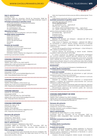 WWW.GHIDULPRIMARIILOR.RO JUDE%u021aUL TELEORMAN / 671Sate %u00een administra%u021bie:Cr%u00e2ngu, SecaraSuprafa%u021ba:%u00a0 3762 ha; Intravilan:%u00a0 234,32 ha; Extravilan:%u00a0 3528 ha; Popula%u021bia:%u00a01458; Gospod%u0103rii:%u00a0665; Locuin%u021be:%u00a0935; Gr%u0103dini%u021be:%u00a01; %u0218coli:%u00a01; Activitati economice si specifice zonei:Cultivarea cerealelor %u0219i cre%u0219terea animalelorFirme reprezentative:SC.CAPATINA COMPANY SRL SC. AGRODANLIV SRLIF DAN GABRIELA MONICA%u00a0Obiective turistice:M%u0103n%u0103stirea Sf%u00e2ntul Galaction, comuna Cr%u00e2nguFacilit%u00e3%u0163i oferite investitorilor:Re%u021bea ap%u0103 potabil%u0103Dispensar umanDispensar veterinarCentru de permanen%u021b%u0103FarmaciePo%u0219t%u0103Proiecte de investi%u0163ii:Extindere iluminat publicModernizare drumuri de interes localReabilitare re%u021bea de ap%u0103%u00cenfiin%u021bare canalizare%u00cenfiin%u021bare Centru Medical de diagnostic %u0219i imagistic%u0103%u00a0 pentru screening %u0219i preven%u021bie a bolilorCOMUNA CREVENICUCod po%u0219tal: 147105Telefon: 0247-450171; Fax: 0247-450171; Adresa de e-mail: primariacrevenicu@gmail.comprimariacrevenicu@yahoo.comCOMUNA DIDE%u015eTICod po%u0219tal: 147110Adresa de e-mail: primariadidesti@yahoo.comURL: https://didesti.teleorman.org/COMUNA DOBROTE%u015eTICod po%u0219tal: 147115Telefon: 0730-559555-s, 0722-514341-vp; Adresa de e-mail: primariadobrotesti@yahoo.comURL: http://comunadobrotesti.ro/COMUNA DRACEAAdres%u0103: str, Principala .nr. 375Cod po%u0219tal: 147101Telefon: 0347-807230; Fax: 0347-807230; Adresa de e-mail: primariadracea@yahoo.comURL: https://primaria-dracea.ro/COMUNA DR%u0102C%u015eENEIAdres%u0103: Str. G%u0103rii, nr. 18Cod po%u0219tal: 147120Telefon: 0723-287502; Adresa de e-mail: dracsenei_tr@yahoo.comURL: https://comdracseneitr.ro/Persoane din primarie:Primar:%u00a0 Marin%u00a0Popescu%u00a0Viceprimar:%u00a0 Nelu%u0163 StroeSecretar General:%u00a0 Florian%u00a0%u00a0Calot%u0103%u00a0Contabil: Nicoleta%u00a0P%u0103duraru%u00a0Sate %u00een administra%u021bie:Dr%u0103c%u015fenei, Dr%u0103c%u015fani, Odobeasca, Satu VechiSuprafa%u021ba:%u00a0 3808 ha; Intravilan:%u00a0 170 ha; Extravilan:%u00a0 3371 ha; Popula%u021bia:%u00a0 1550; Gospod%u0103rii:%u00a0 1334; Locuin%u021be:%u00a0 1295; Gr%u0103dini%u021be:%u00a0 2; %u0218coli:%u00a01; Cum se ajunge in localitate:Comuna Dr%u0103c%u015fenei este tranzitat%u0103 de Drumul Jude%u021bean 612. Cel mai apropiat ora%u015f, Ro%u015fiori de Vede este situat la 17 km, iar Alexandria se afl%u0103 la 45 km.Cele mai importante c%u0103i de acces se afl%u0103 la o distan%u0163%u0103 de: 17 km DN, 1 km Calea ferat%u0103 industrial%u0103, 123 km autostrada, 61 km Port.Activitati economice si specifice zonei:Activit%u0103%u021bi agricole %u0219i de comer%u021bFirme reprezentative:S.C. AGROANCA S.R.L. %u2013 agricultur%u0103PRUTUL SA %u2013 agricultur%u0103S.C. MEDIA GRUP INTERNATIONAL S.R.L. %u2013 agricultur%u0103S.C. UNITE FOREVER GRUP S.R.L. %u2013 fabricarea preparatelor pentru hrana animalelor de ferm%u0103EFTIMIADI SRL %u2013 agricultur%u0103Produse locale: Produse agricole%u00a0Obiective turistice:Biserica %u201cSf. Nicolae%u201d, sat Dr%u0103c%u015fani %u2013 dateaz%u0103 din 1871 %u015fi se localizeaz%u0103 %u00een centrul satuluiCasa Anton R. Popescu, sat Dr%u0103c%u015fani %u2013 dateaz%u0103 din 1895 %u015fi se localizeaz%u0103 %u00een centrul satului; %u015ecoala %u201cEleonora %u015fi Nicolae Vladoianu%u201d, sat Dr%u0103c%u015fani %u2013 dateaz%u0103 din 1894 %u015fi se localizeaz%u0103 %u00een centrul satuluiMuzeul de etnografie %u015fi folclor sat Dr%u0103c%u015fani %u2013 a fost %u00eenfiin%u021bat %u00een 1971, av%u00e2nd ca profil istoria local%u0103Expune obiecte de etnografie %u0219i istorie local%u0103. Cl%u0103direa muzeului a fost construit%u0103 %u00een anul 1926. %u00cen cadrul muzeului se reg%u0103sesc: descoperirile arheologice din comuna Dr%u0103c%u0219ani, obiecte agricole, obiecte de uz casnic, diverse tablouri %u0219i icoane, costume populare, arme vechi, monede vechi, obiecte de uz casnic. %u00cen curtea muzeului se g%u0103se%u0219te %u0219i Monumentul Eroilor c%u0103zu%u021bi %u00een urma conflictului celui De-al Doilea R%u0103zboi Mondial. Pe corpul monumentului se eviden%u021biaz%u0103 numele tuturor eroilor.Evenimente:24 Iunie %u2013 Ziua Comunei Dr%u0103c%u0219enei %u0219i Sarb%u0103toarea IeiFacilit%u00e3%u0163i oferite investitorilor:Impozite %u0219i taxe locale reduse %u0219i sprijin din partea prim%u0103rieiProiecte de investi%u0163ii:Extindere sistem centralizat de alimentare cu ap%u0103 comuna Dr%u0103c%u0219enei jude%u021bul Teleorman %u0219i bran%u0219areConstruire centru de colectare prin aport voluntar %u00een comuna Dr%u0103c%u0219enei, jude%u021bul TeleormanDotarea cu mobilier, material didactice %u0219i echipamente digitale a unit%u0103%u021bilor de %u00eenv%u0103%u021b%u0103m%u00e2nt preuniversitar din comuna Dr%u0103c%u0219enei, jude%u021bul Teleorman%u00cenfiin%u021bare de sistemele individuale adecvate (SIA) de colectare %u0219i epurare a apelor uzate %u00een comuna Dr%u0103c%u0219enei, jude%u021bul TeleormanEficientizarea sistemului de iluminat public din Comuna Dr%u0103c%u0219enei, jude%u021bul TeleormanCOMUNA DR%u0102G%u0102NE%u015eTI DE VEDECod po%u0219tal: 147130Telefon: 0347-404840; Fax: 0347-404840; Adresa de e-mail: primariadraganestidevede@yahoo.comURL: http://primariadraganestidevede.ro/Persoane din primarie:Primar: Marius%u00a0StanciuViceprimar: Cornel Florin SlujitoruSecretar General: Laura Loredana%u00a0StegaruContabil: ExternalizatSate %u00een administra%u021bie:Dr%u0103g%u0103ne%u015fti de Vede, M%u0103gura cu Liliac, V%u0103c%u0103re%u015ftiSuprafa%u021ba:%u00a0 3149 ha; Intravilan:%u00a0 112 ha; Extravilan:%u00a0 3037 ha; Popula%u021bia:%u00a0 2323; Gospod%u0103rii:%u00a0 860; Locuin%u021be:%u00a0 900; Gr%u0103dini%u021be:%u00a0 2; %u0218coli:%u00a03; Activitati economice si specifice zonei:Agricultur%u0103 Comer%u0163