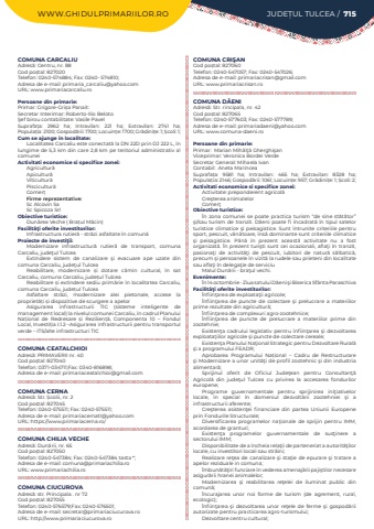 WWW.GHIDULPRIMARIILOR.RO JUDE%u021aUL TULCEA / 715COMUNA CARCALIUAdres%u0103: Centru, nr. 88Cod po%u0219tal: 827020Telefon: 0240-574884; Fax: 0240- 574810; Adresa de e-mail: primaria_carcaliu@yahoo.comURL: www.primariacarcaliu.roPersoane din primarie:Primar: Grigore-Gri%u0219a Panait:%u00a0Secretar Interimar:%u00a0Roberto-Ilio Beloto%u015eef birou contabilitate: Vasile Pavel%u00a0 %u00a0%u00a0Suprafa%u021ba:%u00a0 2962 ha; Intravilan:%u00a0 221 ha; Extravilan:%u00a0 2741 ha; Popula%u021bia:%u00a02100; Gospod%u0103rii:%u00a01700; Locuin%u021be:%u00a01700; Gr%u0103dini%u021be:%u00a01; %u0218coli:%u00a01; Cum se ajunge in localitate:Localitatea Carcaliu este conectat%u0103 la DN 22D prin DJ 222 L, %u00een lungime de 5,3 km din care 2,8 km pe teritoriul administrativ al comuneiActivitati economice si specifice zonei:Agricultur%u0103Apicultur%u0103Viticultur%u0103Piscicultur%u0103Comer%u021bFirme reprezentative:Sc Alcovin SaSc Spicoza SrlObiective turistice:Dun%u0103rea Veche ( Bra%u021bul M%u0103cin)Facilit%u00e3%u0163i oferite investitorilor:Infrastructura rutier%u0103%u00a0- str%u0103zi asfaltate %u00een comun%u0103Proiecte de investi%u0163ii:Modernizare infrastructur%u0103 rutier%u0103 de transport, comuna Carcaliu, jude%u0163ul TulceaExtindere sistem de canalizare %u015fi evacuare ape uzate din comuna Carcaliu, jude%u0163ul TulceaReabilitare, modernizare %u0219i dotare c%u0103min cultural, %u00een sat Carcaliu, comuna Carcaliu, jude%u021bul TulceaReabilitare %u0219i extindere sediu prim%u0103rie %u00een localitatea Carcaliu, comuna Carcaliu, jude%u021bul TulceaAsfaltare str%u0103zi, modernizare alei pietonale, accese la propriet%u0103%u021bi %u0219i dispozitive de scurgere a apelorAsigurarea infrastructurii TIC (sisteme inteligente de management local) la nivelul comunei Carcaliu, %u00een cadrul Planului Na%u021bional de Redresare %u0219i Rezilien%u021b%u0103, Componenta 10 %u2013 Fondul Local, Investi%u021bia I.1.2 %u2013Asigurarea infrastructurii pentru transportul verde %u2013 ITS/alte infrastructuri TICCOMUNA CEATALCHIOIAdres%u0103: PRIMAVERII nr. 40Cod po%u0219tal: 827040Telefon: 0371-034711;Fax: 0340-816898; Adresa de e-mail: primariaceatalchioi@gmail.comCOMUNA CERNAAdres%u0103: Str. %u0218colii, nr. 2Cod po%u0219tal: 827045Telefon: 0240-575511; Fax: 0240-575511; Adresa de e-mail: primariacernatl@yahoo.comURL: https://www.primariacerna.ro/COMUNA CHILIA VECHEAdres%u0103: Dun%u0103rii, nr. 65Cod po%u0219tal: 827050Telefon: 0240-547384; Fax: 0240-547384 tasta *; Adresa de e-mail: comuna@primariachilia.roURL: www.primariachilia.roCOMUNA CIUCUROVAAdres%u0103: str. Principala . nr 72Cod po%u0219tal: 827055Telefon: 0240-576579;Fax: 0240-576501; Adresa de e-mail: secretar@primariaciucurova.roURL: http://www.primariaciucurova.roCOMUNA CRI%u015eANCod po%u0219tal: 827060Telefon: 0240-547057; Fax: 0240-547026; Adresa de e-mail: primariacrisan@gmail.comURL: www.primariacrisan.roCOMUNA D%u0102ENIAdres%u0103: Str. rincipala, nr. 42Cod po%u0219tal: 827065Telefon: 0240-577603; Fax: 0240-577789; Adresa de e-mail: primariadaeni@yahoo.comURL: www.comuna-daeni.roPersoane din primarie:Primar:%u00a0 Marian Mih%u0103i%u0163%u0103%u00a0Gherghi%u015fanViceprimar: Veronica%u00a0Bordei VerdeSecretar General: Mihaela%u00a0IvanContabil:%u00a0 Aneta%u00a0MarinceaSuprafa%u021ba:%u00a0 9581 ha; Intravilan:%u00a0 465 ha; Extravilan:%u00a0 8328 ha; Popula%u021bia:%u00a02146; Gospod%u0103rii:%u00a01061; Locuin%u021be:%u00a0957; Gr%u0103dini%u021be:%u00a01; %u0218coli:%u00a02; Activitati economice si specifice zonei:Activitate: preponderent agricol%u0103Cre%u015fterea animalelorComer%u0163%u00a0Obiective turistice:%u00cen zona comunei se poate practica turism %u201cde sine st%u0103t%u0103tor%u201d %u015fi/sau turism de tranzit. D%u0103eni poate fi %u00eencadrat%u0103 %u00een tipul satelor turistice climatice %u015fi peisagistice. Sunt %u00eentrunite criteriile pentru sport, pescuit, v%u00e2n%u0103toare, %u00eens%u0103 dominante sunt criteriile climatice %u015fi peisagistice. P%u00e2n%u0103 %u00een prezent aceast%u0103 activitate nu a fost organizat%u0103. %u00cen prezent turi%u015fti sunt cei ocazionali, afla%u0163i %u00een tranzit, pasiona%u0163i de activit%u0103%u0163i de pescuit, iubitori de natur%u0103 s%u0103lbatic%u0103, precum %u015fi persoanele %u00een vizit%u0103 la rudele sau prieteni din localitate sau afla%u0163i %u00een delega%u0163ie de serviciuMalul Dun%u0103rii - bra%u0163ul vechi.Evenimente:%u00cen 14 octombrie - Ziua satului D%u0103eni %u015fi Biserica Sf%u00e2nta%u00a0ParaschivaFacilit%u00e3%u0163i oferite investitorilor:%u00cenfiin%u0163area de exploata%u0163ii agricole;%u00cenfiin%u0163area de puncte de colectare %u015fi prelucrare a materiilor prime rezultate din agricultur%u0103;%u00cenfiin%u0163area de complexuri agro-zootehnice;%u00cenfiin%u0163area de puncte de prelucrare a materiilor prime din zootehnie;Existen%u0163a cadrului legislativ pentru %u00eenfiin%u0163area %u015fi dezvoltarea exploata%u0163iilor agricole %u015fi puncte de colectare cereale;Existen%u0163a Planului Na%u0163ional Strategic pentru Dezvoltare Rural%u0103 %u015fi a programului FEADR;Aprobarea Programului Na%u021bional %u2013 Cadru de Restructurare %u015fi Modernizare a unor unit%u0103%u0163i de profil zootehnic %u015fi din industria alimentar%u0103;Sprijinul oferit de Oficiul Jude%u0163ean pentru Consultan%u0163%u0103 Agricol%u0103 din jude%u0163ul Tulcea cu privirea la accesarea fondurilor europene;Programe guvernamentale pentru sprijinirea ini%u0163iativelor locale, %u00een special %u00een domeniul dezvolt%u0103rii zootehniei %u015fi a infrastructurii aferente;Cre%u015fterea asisten%u0163ei financiare din partea Uniunii Europene prin Fondurile Structurale;Diversificarea programelor na%u0163ionale de sprijin pentru IMM, acordarea de granturi;Existen%u0163a programelor guvernamentale de sus%u0163inere a sectorului IMM;Disponibilitate de a %u00eencheia rela%u0163ii de parteneriat a autorit%u0103%u0163ilor locale, cu inves