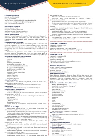 70 / JUDE%u021aUL ARGE%u0218 WWW.GHIDULPRIMARIILOR.ROCOMUNA CO%u015eE%u015eTI Adres%u0103: Str. Principal%u0103Cod po%u0219tal: 117295Telefon: 0248-230038, 230099; Fax: 0248-230038; Adresa de e-mail: primarie@cosesti.cjarges.roURL: http://comunacosesti.ro/Persoane din primarie:Primar: Nicolae Pan%u0103Viceprimar: Gheorghe DimaSecretar General : Adrian MazilescuContabil: Adriana Anca DiaconescuSate %u00een administra%u021bie:Co%u015fe%u015fti, Petre%u015fti, Jupane%u015fti, Pacioiu, Priseaca, Leice%u015fti, L%u0103pu%u015faniSuprafa%u021ba:%u00a0 6200 ha; Intravilan:%u00a0 820 ha; Extravilan:%u00a0 5380 ha; Popula%u021bia:%u00a0 5142; Gospod%u0103rii:%u00a0 2208; Locuin%u021be:%u00a0 2825; Gr%u0103dini%u021be:%u00a0 8; %u0218coli:%u00a03; Cum se ajunge in localitate:Comuna este str%u0103batut%u0103%u00a0pe malul st%u00e2ng al R%u00e2ului Doamnei de %u0219oseaua Jude%u021bean%u0103%u00a0DJ 731, care o leag%u0103%u00a0spre Nord de Comunele Pietro%u0219ani, Domne%u0219ti (unde se intersecteaz%u0103%u00a0 DN 73C), Corbi %u0219i Nuc%u0219oara, %u0219i spre Sud de Comuna D%u0103rm%u0103ne%u0219ti (unde se termin%u0103%u00a0%u00een DN 73).De asemenea , pe malul drept al R%u00e2ului Doamnei trece prin comun%u0103%u00a0 %u0219oseaua jude%u021bean%u0103%u00a0 DJ 731D, care duce spre Nord la Comuna Pietro%u0219ani %u0219i spre Sud la Comunele D%u0103rm%u0103ne%u0219ti %u0219i Mice%u0219tiActivitati economice si specifice zonei:Prelucrare material lemnosDog%u0103ritOl%u0103ritFirme reprezentative:SC CASICO-CONFLEMN SRLSC LEMNRO PRODPIN 2005 SRLSC DISCO ROBI COM SRLSC CERAMIC MARIDOR SRLProduse locale:Legume, Fructe, Miere, %u021auic%u00eeMe%u0219te%u0219ugari:Veronica IeseanuPlopeanu MarieaNicolaescu NicolaeObiective turistice:Biserica din Lemn din satul Jup%u0103ne%u0219ti, construit%u0103%u00a0%u00een anul 1864, declarat%u0103%u00a0monument istoricMe%u0219terul Olar- activit%u0103%u021bi de divertisment pentru copiiEvenimente:T%u00eergul anual de Sfin%u021bii Mihail %u0219i GavrilFestivalul %u021auiciiFacilit%u00e3%u0163i oferite investitorilor:Poten%u021bial agroturisticComuna este ferit%u0103%u00a0de intemperii datorit%u0103%u00a0a%u0219ez%u0103rii pe podi%u0219ul C%u00e2nde%u0219ti, %u0219i are sol fertilComuna este bogat%u0103%u00a0%u00een resurse naturale precum lemnulAp%u0103 potabil%u0103Telefonie digitalaCablu TVConcesionare terenTurism local %u0219i cunoa%u0219terea me%u0219tesugurilor locale (ol%u0103rit, dog%u0103rit)Proiecte de investi%u0163ii:Reabilitarea, modernizarea %u0219i extinderea sistemului de alimentatie cu ap%u0103%u00a0%u00een comuna Cose%u0219tiReabilitare %u0219i modernizare iluminat public %u00een comuna Cose%u0219tiProiect modernizare drumuri comunale %u00een comuna Cose%u0219tiAsigurarea scurgerii apelor pluvialeModernizarea %u0219i extinderea sistemului de canalizare %u00een satele Petre%u0219ti, Cose%u0219ti, Pacioiu %u0219i Leice%u0219ti, comuna Cose%u0219ti, jude%u021bul Arge%u0219Reabiliatrea cl%u0103dirilor de interes publicPROGRAMUL DE INVESTI%u021aII PUBLICE %u0218I SURSE DE FINAN%u021aARE PE ANUL 2025Reabilitarea moderat%u0103%u00a0 a sediului prim%u0103riei Cose%u0219ti, jude%u021bul ArgesReabilitarea moderat%u0103%u00a0 a GPN din sat Jup%u0103ne%u0219ti comuna Cose%u0219ti, jude%u021bul Arge%u0219Reabilitarea moderat%u0103%u00a0 a %u0219colii primare din sat Jup%u0103ne%u0219ti, comuna Cose%u0219ti, jude%u021bul Arge%u0219Extindere corp cl%u0103dire %u0219coala gimnazial%u0103%u00a0Cose%u0219tiReabilitarea, modernizarea %u0219i extinderea sistemului de alimentare cu ap%u0103Moderniarea sistemului de iluminat public%u00cenfiin%u021bare re%u021bea gaze naturale %u00een comuna Cose%u0219ti - proiectActualizare PUGSistem de canalizare %u00een sat Cose%u0219ti, comuna Cose%u0219tiProiectare modernizare drumuri comunale %u00een comuna Cose%u0219tiAsfaltare strada Valea Dealului l=300m, sat Leice%u0219ti, comuna Cose%u0219tiAsfaltare strada Bugulani Vale+ Bugulani Deal l=300m, sat Petre%u0219ti, comuna Cose%u0219tiAsfaltare DC232 l=700m, sat Petre%u0219ti, comuna Cose%u0219tiCl%u0103diri publice eficiente energetic %u00een comuna Cose%u0219tiCalitate %u0219i incluziune %u00een %u00eenv%u0103%u021b%u0103m%u00e2ntul primar %u0219i secundar din comuna Cose%u0219tiAsfaltare strada Valea Popilor, sat Pacioiu, comuna Cose%u0219tiAsfaltare strada Dadaii, sat Leice%u0219tiCOMUNA COTMEANAAdres%u0103: Principala nr.309Cod po%u0219tal: 117305Telefon: 0248-242044; Fax: 0248-242066; Adresa de e-mail: primarie@cotmeana.cjarges.roCOMUNA CUCAAdres%u0103: Principal%u0103, nr. 35Cod po%u0219tal: 117330Telefon: 0786-267364; Adresa de e-mail: primariacucaag@yahoo.comURL: https://primariacuca.ro/Persoane din primarie:Primar: Teodor Georgian Dr%u0103gu%u0219inViceprimar: Marius SanduSecretar General:%u00a0Contabil: Nicolae Alin S%u0103raruSate %u00een administra%u021bie:Cuca, B%u0103l%u0163ata, B%u0103rb%u0103lani, C%u00e2rce%u015fti, Cotu, Criv%u0103%u0163, L%u0103unele de Sus, M%u0103c%u0103i, M%u0103ne%u015fti, Sine%u015fti, St%u0103nicei, Teodore%u015fti, Valea Cucii, VonigeasaSuprafa%u021ba:%u00a0 5159 ha; Intravilan:%u00a0 448 ha; Extravilan:%u00a0 4552 ha; Popula%u021bia:%u00a0 1716; Gospod%u0103rii:%u00a0 1450; Locuin%u021be:%u00a0 1450; Gr%u0103dini%u021be:%u00a0 4; %u0218coli:%u00a04; Activitati economice si specifice zonei:Firme reprezentative:Asocia%u021bia cre%u0219terii bovine %u201dCungrea%u201dProduc%u0103tori locali:Laz%u0103r DanielPopescu Constantin Grani%u0219teanu GabiProduse locale:Fructe pomicoleLegumeLapteOu%u0103MiereMe%u0219te%u0219ugari:Com%u0103nescu TraianCinc%u0103 GheorgheCompanii reprezentative:COMDIVERS LOGISTICINTERNATIONAL - LAZAR - COMPANY%u00a0Obiective turistice:Cele trei biserici din lemn%u00a0- monumente istoriceEvenimente:Ziua localit%u0103%u021biiT%u00e2rgul tradi%u021bionalRusaliiFacilit%u00e3%u0163i oferite investitorilor:Drumuri jude%u0163ene %u015fi comunale modernizateAp%u0103 potabil%u0103Proiecte de investi%u0163ii:Modernizare iluminat pub