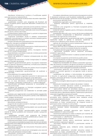 - devoltarea infrastructurii turistice %u0219i fructificarea a%u0219ez%u0103rii comunei la drumul na%u021bional DN 24- dezvoltarea economiei locale pe baza resurselor dsponibileInfrastructur%u0103 %u0219i mediu- posibilitatea acces%u0103rii unor programe de finan%u021bare ale Uniunii Europene pentru sprijinirea dezvolt%u0103rii infrastructurii %u00een mediul rural- existen%u021ba unei legisla%u021bii na%u021bionale privind protec%u021bia mediului cuprinz%u0103toare %u0219i %u00een acord cu directivele %u0219i normele europene- disponibilitatea de fonduri na%u021bionale %u0219i ale Uniunii Europene alocate pentru sectorul de mediu- con%u0219tientizarea mediului de afaceri cu privire la respectarea normelor privind protec%u021bia mediului- implicarea autorit%u0103%u021bilor locale %u00een vederea con%u0219tientiz%u0103rii cet%u0103%u021benilor comunei pentru a %u00eencheia contracte necesare pentru colectarea de%u0219eurilor menajere- campanii de educare a popula%u021biei privind colectarea selectiv%u0103 a de%u0219eurilor menajere %u0219i protejarea mediului.Economie %u0219i resurse umane- programe europene de finan%u021bare pentru mediul economic %u0219i pentru cre%u0219terea competivit%u0103%u021bii economice- programe guvernamentale pentru %u00eencurajarea tinerilor fermieri %u0219i a micilor %u00eentreprinz%u0103tori- disponibilitatea autorit%u0103%u021bilor locale de a %u00eencheia parteneriate cu investitori locali sau str%u0103ini- ac%u021biuni de sprijinire a ini%u021biativei antreprenoriale de c%u0103tre autorit%u0103%u021bile locale- campanii de %u00eendrumare a micilor %u00eentreprinz%u0103tori %u00een vederea ob%u021binerii finan%u021b%u0103rii de proiecte- programe guvernamentale pentru %u00eencurajarea ini%u021biativelor locale, %u00een special %u00een domeniul zootehniei, a infrastructurii aferente, prima afacere, tineri fermieri- cre%u0219terea asisten%u021bei financiare din partea Uniunii Europene pentru IMM-uri prin fonduri nerambursabile- existen%u021ba programelor guvernamentale de sus%u021binere a sectorului IMM- %u00eembun%u0103t%u0103%u021birea %u0219i %u00eencurajarea afacerilor- ac%u021biuni de sprijinire a agen%u021bilor economici %u00een demararea de proiecte privind folosirea de energie din surse alternative- ac%u021binui de orientare pentru %u00eenfiin%u021barea de micro%u00eentreprinderi care au ca scop dezvoltarea activit%u0103%u021bilor de transformare/comercializare a produselor tradi%u021bionale cu o valoare ad%u0103ugat%u0103- diversificarea activit%u0103%u021bilor productive %u00een concordan%u021b%u0103 cu materiile prime locale- atragerea de programe cu finan%u021bare european%u0103 pentru stimularea ocup%u0103rii for%u021bei de munc%u0103- adaptarea programelor de %u00eenv%u0103%u021b%u0103m%u00e2nt la cerin%u021bele pie%u021bei muncii- existen%u021ba unor reglement%u0103ri ce acord%u0103 facilit%u0103%u021bi angajatorilor care creeaz%u0103 noi locuri de munc%u0103 pentru %u0219omeri, tineri absolven%u021bi %u0219i alte categorii de persoane- orientarea programelor spre specializ%u0103ri %u00een domeniile cerute de pia%u021ba for%u021bei de munc%u0103- dezvoltarea antreprenoriatului- programe de includere social%u0103 %u00een mod egal %u00een pia%u021ba for%u021bei de munc%u0103, a femeilor %u0219i b%u0103rba%u021bilor- accesarea unor fina%u021b%u0103ri nerambursabile care acord%u0103 sprijin proiectelor %u00a0de resurse umane- accesarea de fonduri nerambursabile pentru activit%u0103%u021bi menite s%u0103 rezolve problema de incluziune social%u0103 a grupurilor defavorizate- posibilitatea acces%u0103rii unor programe de fina%u021bare guvernamental%u0103 pentru reconversie profesional%u0103 %u0219i crearea unor noi locuri de munc%u0103 pentru %u0219omeri- implicarea autorit%u0103%u021bilor locale %u00een problemele comunit%u0103%u021bii- continuarea %u0219i consolidarea programelor de instruire de baz%u0103, a programelor de %u00eenv%u0103%u021b%u0103m%u00e2nt pe tot parcursul vie%u021bii %u0219i dezvoltare a abilit%u0103%u021bilor antreprenoriale- dezvoltarea pachetelor de instrumente financiare pentru sprijinirea micilor afaceri- valorificarea cadrului natural prin amenajarea unor zone de agrement %u0219i de petrecere a timpului liber- dezvoltarea infrastructurii turistice conduce la cre%u0219terea locurilor de munc%u0103 %u00een turism- %u00eencurajarea, dezvoltarea %u0219i promovarea de programe turistice %u00een domeniul turismului rural: buc%u0103t%u0103rie tradi%u021bional%u0103 cu produse agroalimentare de tip ecologic, ecoturism, turism religios etc- promovarea identit%u0103%u021bii locale- posibilitatea organiz%u0103rii unor tasee turistice- existen%u021ba subven%u021biilor pentru agricultur%u0103 %u0219i cre%u0219terea animalelor- existen%u021ba unor programe cu finan%u021bare european%u0103 pentru dezvoltarea agriculturii- existen%u021ba cadrului legislativ pentru %u00eenfiin%u021barea %u0219i dezvoltarea exploat%u0103rilor agricole- posibilitatea efectu%u0103rii unor cursuri de formare profesional%u0103 privind cre%u0219terea competivit%u0103%u021bii %u0219i difersific%u0103rii produselor %u0219i activit%u0103%u021bilor din agricultur%u0103 %u0219i silvicultur%u0103- existen%u021ba programelor guvernamentale pentru %u00eencurajarea ini%u021biativelor locale, %u00een special %u00een domeniul zootehniei, a infrastructurii aferente, prima afacere, tineri fermieri- aplicare de tehnologii %u0219i practici prietenoase mediului %u0219i de utilizare a energiei regenerabile- sprijin oferit de Oficiul Jude%u021bean de Consutan%u021b%u0103 Agricol%u0103 din jude%u021bul Vaslui cu privire la accesarea fondurilor europene- stimularea asocierii proprietarilor de terenuri agricole;- optimizarea condi%u021biilor pentru sprijinirea activit%u0103%u021bilor rentabile %u00een agricultur%u0103;- asisten%u021b%u0103 acordat%u0103 fermierilor %u00een vederea acces%u0103rii de fonduri nerambursabile;- %u00eencurajarea %u0219i sprijinirea parteneriatului public-p
