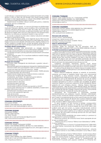 cuv%u00e2nt de spus - ac%u0163ion%u00e2nd %u00eempreun%u0103 cu toate sectoarele comunit%u0103%u0163ii pentru a crea un viitor c%u00e2t mai durabil. Vom reveni asupra acestei strategii %u00een mod regulat pentru a-i aduce %u00eembun%u0103t%u0103%u0163iri astfel %u00eenc%u00e2t ajustarea s%u0103 corespund%u0103 schimb%u0103rii continue.Modernizarea localit%u0103%u021bii trebuie continuat%u0103%u00a0 pentru cre%u0219terea condi%u021biilor de trai a cet%u0103%u021benilor.Evenimente:%u00cen fiecare an, de Rusalii,%u00a0 %u00een comuna %u0218irineasa se s%u0103rb%u0103tore%u0219te Festivalul C%u0103lu%u0219ului V%u00e2lcean, ajuns la edi%u021bia a XII-a. %u015eirineasa este comuna v%u00e2lcean%u0103 aflat%u0103 chiar %u00een mijloc de jude%u0163. De sus %u015fi p%u00e2n%u0103 jos %u015fi de la vest la est, %u015eirineasa ocup%u0103 exact pozi%u0163ia care %u00eei d%u0103 rolul de doamn%u0103 regal%u0103, este comuna unde toamna vine dinspre fosta biseric%u0103 a lui Lahovary %u015fi coloreaz%u0103 merele %u00een ro%u015fu carmin.Iar iernile curbeaz%u0103 muchia celor 2 dealuri aduc%u00e2nd colinde%u0163ii de sear%u0103 %u00een Decembrie Magic. Satul Valea Aluni%u015fului unde avem legenda lacului f%u0103r%u0103 fund de unde se spune c%u0103 izvora p%u00e2r%u00e2ul Ni%u015f, este locul unde fugeau pe vremuri haiducii. %u015ei acum sunt c%u0103utate comorile lui Nicu Asproiu, haiducul ce se f%u0103cu nev%u0103zut %u00een undele lacului, urm%u0103rit de potera. Acest sat cu un uria%u015f poten%u0163ial agroturistic este %u00een aten%u0163ia actualei administra%u0163ii.Facilit%u00e3%u0163i oferite investitorilor:%u00centreaga localitate este alimentat%u0103 cu energie electric%u0103, asfaltarea drumului jude%u0163ean 677 %u0219i modernizare %u0219i asfaltare drumuri comunale, construc%u021bii %u0219an%u021buri %u0219i trotuar pe strada principal%u0103Localitatea are ap%u0103 curent%u0103 %u015fi beneficiaz%u0103 de sistem centralizat de canalizareExist%u0103 re%u0163ea de cablu TV %u00een localitate telefonie mobil%u0103 Orange, Vodafone %u015fi TelekomRe%u0163ea telefonie fix%u0103 %u015fi internet TelekomFor%u0163%u0103 de munc%u0103 ieftin%u0103Proiecte de investi%u0163ii:%u00cenfiin%u021bare re%u021bea inteligent%u0103%u00a0 de distribu%u021bie a gazelor natural %u2013 Anghel SalignyReconstruire gard %u0219i amenajare parc de joac%u0103%u00a0la Gr%u0103dini%u021ba %u0218irineasaMontare sistem de supraveghere video %u00een toat%u0103%u00a0localitateaConstruire sta%u021bii de %u00eenc%u0103rcare electrice - PNNRModernizare sistem de iluminat public stradal - PNRR, dotarea %u0219colii, a laboratoarelor de informatic%u0103Modernizarea Dispensarului medical (interior, exterior)Trotuar pe o lungime de 2 kilometri.Amplasarea %u201epunctelor%u201d de colectare gunoi selectiv.Construire teren sintetic multifunc%u0163ional. Puncte de colectare gunoi selectivProiecte aflate %u00een derulareIntroducere gaze naturaleAlimentarea cu gaze naturaleContinuarea construirii trotuarului paralel cu DJ 677Continuarea demersurilor %u00een vederea reabilit%u0103rii, moderniz%u0103rii %u015fi dot%u0103rii C%u0103minului CulturalAchizi%u021bionare microbuz %u0219colar electricDrumuri de exploata%u021bie agricol%u0103Piste de bicicleteSta%u021bii de %u00eenc%u0103rcare electrice Construirea de capele funerareCOMUNA %u015eTEF%u0102NE%u015eTICod po%u0219tal: 247685Telefon: 0250-830497; Fax: 0250-830415; Adresa de e-mail: stefanesti@vl.e-adm.roCOMUNA %u015eU%u015eANICod po%u0219tal: 247690Telefon: 0250-764234; Fax: 0250-764225; Adresa de e-mail: primariasusani@yahoo.comURL: www.comuna-susani.roCOMUNA TETOIUAdres%u0103: Sat %u0162epe%u015fti; Cod po%u0219tal: 247695Telefon: 0250-867869, 867804, 867902; Fax: 0250-867804; Adresa de e-mail: primariatetoiu@yahoo.com, tetoiu@vl.e-adm.roURL: www.primariatetoiu.roCOMUNA TITE%u015eTICod po%u0219tal: 247492Telefon: 0250-756900; Fax: 0250-756903; Adresa de e-mail: primtitesti@yahoo.com, titesti@vl.e-adm.roURL: http://www.titesti.ro/COMUNA TOM%u015eANIAdres%u0103: Tudor Vladimire scu, nr. 1; Cod po%u0219tal: 247705Telefon: 0250-863550, 863584; Fax: 0250-863584; Adresa de e-mail: primariatomsanivl@yahoo.comtomsani@vl.e-adm.roCOMUNA VAIDEENICod po%u0219tal: 247725; Telefon: 0250-865009; Fax: 0250-865001; Adresa de e-mail: primaria.vaideeni@yahoo.comvaideeni@vl.e-adm.roURL: www.primaria-vaideeni.roPersoane din primarie:Primar:%u00a0Achim- Daniel%u00a0B%u0103lu%u0163%u0103Viceprimar: Vasile Cornel%u00a0Ichim%u00a0Secretar General: Ana-Maria- Gra%u021biela%u00a0 MarcuContabil:%u00a0Lumini%u0163a%u00a0CojocaruSate %u00een administra%u021bie:Vaideeni, Izvoru Rece, Mari%u0163a, Cornet, CernaSuprafa%u021ba:%u00a0 15759 ha; Intravilan:%u00a0 752 ha; Extravilan:%u00a0 1507 ha; Popula%u021bia:%u00a03988; Gospod%u0103rii:%u00a01537; Locuin%u021be:%u00a02039; Gr%u0103dini%u021be:%u00a04; %u0218coli:%u00a04; Activitati economice si specifice zonei:Agricultura reprezint%u0103 principala activitate economic%u0103, mai ales, cre%u015fterea animalelor %u015fi pomicultura. M%u0103rimea exploata%u0163iilor agricole este mic%u0103, %u00een general sub 2 ha, ceea ce denot%u0103 o f%u0103r%u00e2mi%u0163are excesiv%u0103 a terenurilor agricole. Suprafe%u0163e compacte %u015fi mai mari de%u0163in ob%u015ftile s%u0103te%u015fti de pe raza comunei Vaideeni, mai ales %u00een zona de munte, formate din p%u0103%u015funi care vara sunt arendate posesorilor de bovine %u015fi ovine. Culturile dominante sunt cele pomicole, exist%u00e2nd %u00een jur de 640 ha de livezi, formate predominant din prun %u015fi m%u0103rCre%u015fterea animalelor reprezint%u0103, pentru mul%u0163i dintre locuitorii comunei Vaideeni, o surs%u0103 de venit, bovinele %u015fi ovinele reprezent%u00e2nd principalele animale crescute %u00een comuna Vaideeni. %u00cen ultimul timp se observ%u0103 un interes crescut al turi%u015filor pentru aceast%u0103 zon%u0103, exist%u00e2nd unele pensiuni care ofer%u0103 facilit%u0103%u0163i de cazare.Obiective turi